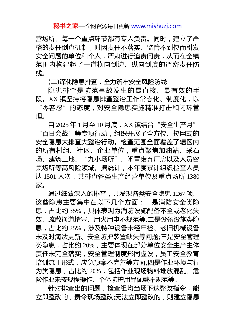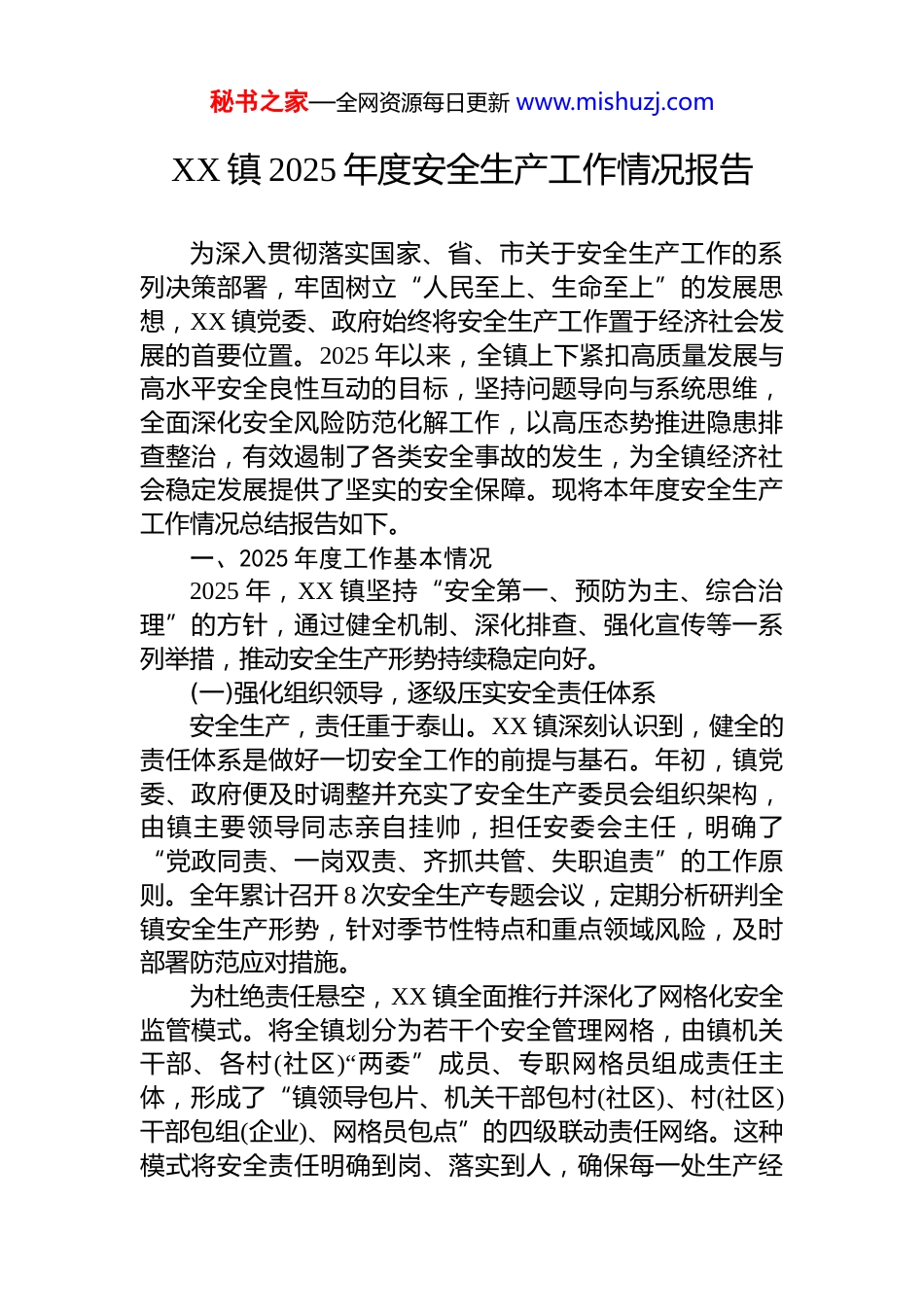 秘书之家—全网资源每日更新 www.mishuzj.comXX 镇 2025 年度安全生产工作情况报告为深入贯彻落实国家、省、市关于安全生产工作的系列决策部署,牢固树立“人民至上、生命至上”的发展思想,XX 镇党委、政府始终将安全生产工作置于经济社会发展的首要位置。2025 年以来,全镇上下紧扣高质量发展与高水平安全良性互动的目标,坚持问题导向与系统思维,全面深化安全风险防范化解工作,以高压态势推进隐患排查整治,有效遏制了各类安全事故的发生,为全镇经济社会稳定发展提供了坚实的安全保障。现将本年度安全生产工作情况总结报告如下。一、2025 年度工作基本情况2025 年,XX 镇坚持“安全第一、预防为主、综合治理”的方针,通过健全机制、深化排查、强化宣传等一系列举措,推动安全生产形势持续稳定向好。(一)强化组织领导,逐级压实安全责任体系安全生产,责任重于泰山。XX 镇深刻认识到,健全的责任体系是做好一切安全工作的前提与基石。年初,镇党委、政府便及时调整并充实了安全生产委员会组织架构,由镇主要领导同志亲自挂帅,担任安委会主任,明确了“党政同责、一岗双责、齐抓共管、失职追责”的工作原则。全年累计召开 8 次安全生产专题会议,定期分析研判全镇安全生产形势,针对季节性特点和重点领域风险,及时部署防范应对措施。为杜绝责任悬空,XX 镇全面推行并深化了网格化安全监管模式。将全镇划分为若干个安全管理网格,由镇机关干部、各村(社区)“两委”成员、专职网格员组成责任主体,形成了“镇领导包片、机关干部包村(社区)、村(社区)干部包组(企业)、网格员包点”的四级联动责任网络。这种模式将安全责任明确到岗、落实到人,确保每一处生产经秘书之家—全网资源每日更新 www.mishuzj.com营场所、每一个重点环节都有专人负责。同时,建立了严格的责任倒查机制,对因责任不落实、监管不到位而引发安全问题的单位和个人,严肃进行追责问责,从而在全镇范围内构建起了一道横向到边、纵向到底的严密责任防线。(二)深化隐患排查,全力筑牢安全风险防线隐患排查是防范事故发生的 最直接、最有效的手段。XX 镇坚持将隐患排查整治工作常态化、制度化,以“零容忍”的态度,对安全隐患实施精准打击和闭环管理。自 2025 年 1 月至 10 月底,XX 镇结合“安全生产月”“百日会战”等专项行动,组织开展了全方位、拉网式的安全隐患大排查大整治行动。检查范围全面覆盖了辖区内的所有村组、社区、企业单位,重点聚焦加油站、采石场、建筑工地、“九小场所”、闲置废弃厂房以及人员密集场所等高风险领域。据统计,本年度累计组织检查人员达 1501 人次,共排查各类生产经营单位及重点场所 1380家。通过细致深入的排查,共发现各类安全隐患 1267 项。这些隐患主要集中在以下几个方面:一是消防安全类隐患,占比约 35%,具体表现为消防设施配备不全或老化失效、疏散通道堵塞、用火用电不规范等;二是设备设施类隐患,占比约 25%,涉及特种设备未经年检、老旧机械设备未及时淘汰更新、安全防护装置缺失等问题;三是安全管理类隐患,占比约 20%,主要体现在部分单位安全生产主体责任未完全落实,安全管理制度形同虚设,员工安全教育培训流于形式,应急预案不完善等方面;四是作业环境与行为类隐患,占比约 20%,包括作业现场物料堆放混乱、危险作业未按规程操作、个体防护用品佩戴不规范等。针对排查出的问题,检查组均当场下达整改指令,能立即整改的,责令现场整改;无法立即整改的,则建立隐患秘书之家—全网资源每日更新 www.mishuzj.com台账,明确整改责任人、整改措施和整改时限,实行挂账督办。镇安委会办公室对重点难点隐患的整改过程进行全程跟踪、定期复查,确保问题整改到位,形成“发现—登记—整改—复查—销号”的闭环管理。截至 2025 年 10 月底,已完成整改的隐患共计 1260 项,总体整改完成率达到99.45%,有力地守护了全镇的安全红线。(三)广泛宣传教育,着力提升全民安全意识提升全民安全素养是实现本质安全的根本途径。XX 镇坚持将安全宣传教育作为一项基础性、先导性工作来抓,通过多样化的形式和渠道,努力在全社会营造...