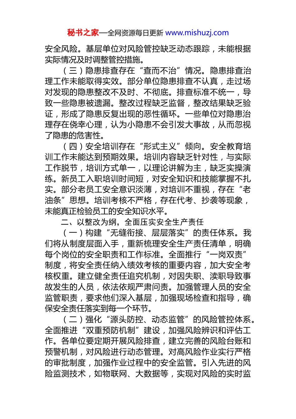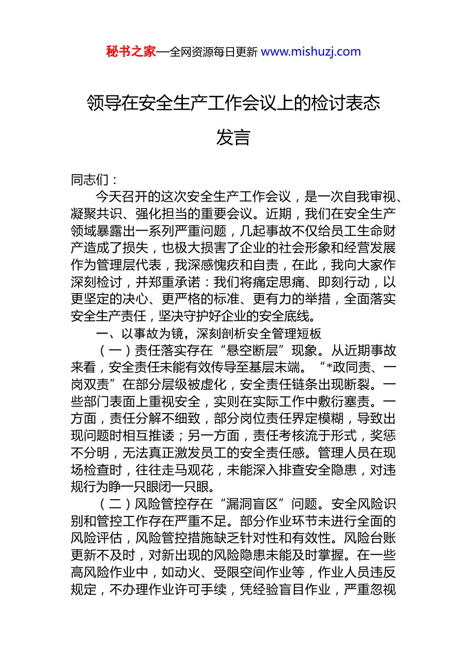 秘书之家—全网资源每日更新 www.mishuzj.com领导在安全生产工作会议上的检讨表态发言同志们:今天召开的这次安全生产工作会议,是一次自我审视、凝聚共识、强化担当的重要会议。近期,我们在安全生产领域暴露出一系列严重问题,几起事故不仅给员工生命财产造成了损失,也极大损害了企业的社会形象和经营发展作为管理层代表,我深感愧疚和自责,在此,我向大家作深刻检讨,并郑重承诺:我们将痛定思痛、即刻行动,以更坚定的决心、更严格的标准、更有力的举措,全面落实安全生产责任,坚决守护好企业的安全底线。一、以事故为镜,深刻剖析安全管理短板(一)责任落实存在“悬空断层”现象。从近期事故来看,安全责任未能有效传导至基层末端。“*政同责、一岗双责”在部分层级被虚化,安全责任链条出现断裂。一些部门表面上重视安全,实则在实际工作中敷衍塞责。一方面,责任分解不细致,部分岗位责任界定模糊,导致出现问题时相互推诿;另一方面,责任考核流于形式,奖惩不分明,无法真正激发员工的安全责任感。管理人员在现场检查时,往往走马观花,未能深入排查安全隐患,对违规行为睁一只眼闭一只眼。(二)风险管控存在“漏洞盲区”问题。安全风险识别和管控工作存在严重不足。部分作业环节未进行全面的风险评估,风险管控措施缺乏针对性和有效性。风险台账更新不及时,对新出现的风险隐患未能及时掌握。在一些高风险作业中,如动火、受限空间作业等,作业人员违反规定,不办理作业许可手续,凭经验盲目作业,严重忽视秘书之家—全网资源每日更新 www.mishuzj.com安全风险。基层单位对风险管控缺乏动态跟踪,未能根据实际情况及时调整管控措施。(三)隐患排查存在“查而不治”情况。隐患排查治理工作未能取得实效。部分单位隐患排查不认真,走过场对发现的隐患整改不及时、不彻底。排查标准不统一,导致一些隐患被遗漏。整改过程缺乏监督,整改结果缺乏验证,形成了隐患反复出现的恶性循环。一些单位对隐患治理存在侥幸心理,认为小隐患不会引发大事故,从而忽视了隐患的危害性。(四)安全培训存在“形式主义”倾向。安全教育培训工作未能达到预期效果。培训内容缺乏针对性,与实际工作脱节,培训方式单一,以理论讲解为主,缺乏实操演练。新员工入职培训时间短,对安全知识和技能掌握不扎实。部分老员工安全意识淡薄,对培训不重视,存在“老油条”思想。培训考核不严格,存在代考、抄袭等现象,未能真正检验员工的安全知识水平。二、以整改为纲,全面压实安全生产责任(一)构建“无缝衔接、层层落实”的责任体系。我们将从制度层面入手,重新梳理安全生产责任清单,明确每个岗位的安全职责和工作标准。全面推行“一岗双责”制度,将安全责任纳入绩效考核的重要内容,加大安全考核权重。建立健全责任追究机制,对因失职、渎职导致事故发生的人员,依法依规严肃问责。加强管理人员的安全监管职责,要求他们深入基层,加强现场检查和指导,确保安全责任落实到每一个环节。(二)强化“源头防控、动态监管”的风险管控体系。全面推进“双重预防机制”建设,加强风险辨识和评估工作。各单位要定期开展风险排查,建立完善的风险台账和预警机制,对风险进行动态管理。对高风险作业实行严格的审批制度,加强作业过程中的安全监管。引入先进的风险监测技术,如物联网、大数据等,实现对风险的实时监秘书之家—全网资源每日更新 www.mishuzj.com控和预警。加强对重大风险的管控,实行领导包保责任制确保重大风险可控可防。(三)完善“拉网排查、闭环治理”的隐患排查机制。按照“全覆盖、零容忍、严执法、重实效”的要求,全面开展安全隐患排查治理工作。建立定期排查和不定期抽查相结合的隐患排查制度,确保隐患排查无死角。对排查出的隐患,要按照“五落实”的要求进行整改,即落实整改责任人、整改措施、整改期限、整改资金和整改预案。建立隐患整改销号制度,对整改完成的隐患进行严格验收,确保整改到位。加强对隐患排查治理工作的监督检查,对工作不力的单位和个人进行严肃问责。(四)夯实“精准培训、全员覆盖”的安全培训机制。以提高员工安全意识和技能为目标,全面加...