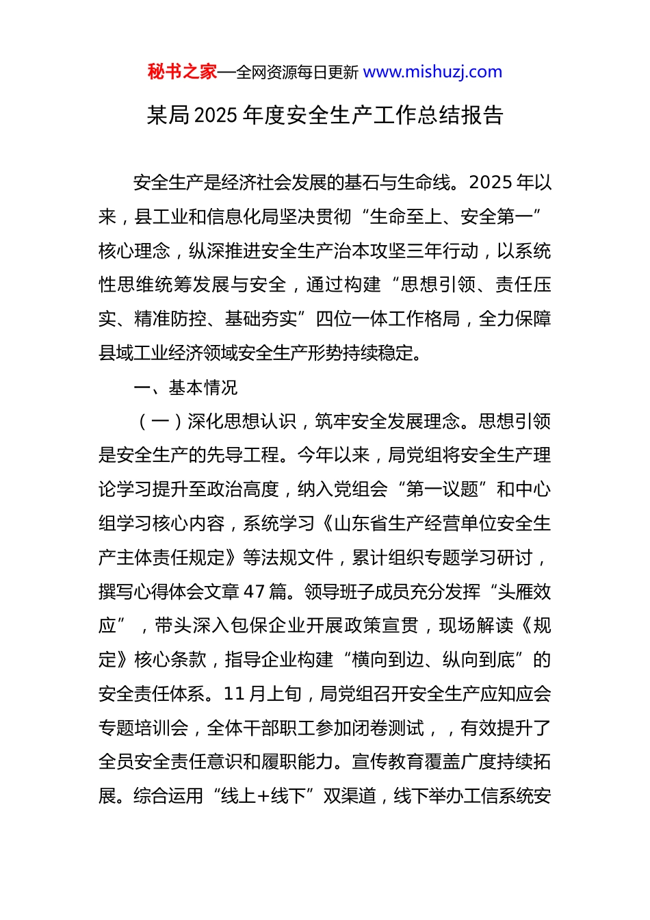 秘书之家—全网资源每日更新 www.mishuzj.com某局 2025 年度安全生产工作总结报告 安全生产是经济社会发展的基石与生命线。2025 年以来,县工业和信息化局坚决贯彻“生命至上、安全第一”核心理念,纵深推进安全生产治本攻坚三年行动,以系统性思维统筹发展与安全,通过构建“思想引领、责任压实、精准防控、基础夯实”四位一体工作格局,全力保障县域工业经济领域安全生产形势持续稳定。一、基本情况(一)深化思想认识,筑牢安全发展理念。思想引领是安全生产的先导工程。今年以来,局党组将安全生产理论学习提升至政治高度,纳入党组会“第一议题”和中心组学习核心内容,系统学习《山东省生产经营单位安全生产主体责任规定》等法规文件,累计组织专题学习研讨,撰写心得体会文章 47 篇。领导班子成员充分发挥“头雁效应”,带头深入包保企业开展政策宣贯,现场解读《规定》核心条款,指导企业构建“横向到边、纵向到底”的安全责任体系。11 月上旬,局党组召开安全生产应知应会专题培训会,全体干部职工参加闭卷测试,,有效提升了全员安全责任意识和履职能力。宣传教育覆盖广度持续拓展。综合运用“线上+线下”双渠道,线下举办工信系统安秘书之家—全网资源每日更新 www.mishuzj.com全生产大讲堂、事故案例警示教育会等集中活动,参训企业主要负责人和安全管理人员。线上依托微信公众号、企业联络群等平台,推送安全预警信息、政策解读、风险提示等内容,针对四季度雨雪、大风、寒潮等恶劣天气,建立气象预警快速响应机制,提前 72 小时向企业发布预警信息和安全提示,累计发送短信提醒,覆盖所有规上工业企业。通过高频次、多渠道宣传,企业安全发展理念显著增强,形成了“人人重视安全、人人参与安全”的浓厚氛围。(二)强化责任落实,构建协同监管格局。责任体系是安全生产的根本保障。年初制定《2025 年度工业和信息化领域安全生产监管责任清单》,明确局领导班子、业务科室、监管人员的具体职责,形成“一级抓一级、层层抓落实”的责任链条。创新实施“局领导包片、科室包保、专家指导”三级联动机制,成立 8 个由分管领导任组长的常态化帮扶小组,配备注册安全工程师、爆破专家等专业人员,对民爆行业实行驻点监督,对规上工业企业实施分级分类监管。帮扶小组每月至少开展 1 次现场督导,每季度召开 1 次风险研判会,确保问题早发现、早处置。企业主体责任压实机制不断完善。督促指导企业严格落实全员安全生产责任制,将责任清单细化到车间、班组、岗位。秘书之家—全网资源每日更新 www.mishuzj.com推行“一企一档”隐患清单式管理,要求企业建立“风险辨识、隐患排查、整改销号”闭环台账。严格执行“五个必查”原则,即必查责任落实、必查制度执行、必查现场管理、必查教育培训、必查应急准备。通过“四不两直”方式开展突击检查,对主体责任落实不到位的企业进行约谈警示,形成强大震慑效应。(三)聚焦精准治理,提升风险防控能力。专项整治是消除隐患的关键抓手。全年统筹开展“十大行动”“五项整治”系列专项行动,涵盖民爆物品、燃气使用、粉尘涉爆、有限空间等重点领域。民爆行业实施“一月一主题”集中整治,针对规模以上工业企业,开展起底式安全生产大排查,重大隐患均建立“一患一档”,实行挂牌督办。开展起重机械专项整治,检查设备,发现并整改安全隐患,有效防范机械伤害事故。风险分级管控机制科学运行。建立企业安全风险“红橙黄蓝”四色分布图,对高风险企业实施“一企一策”精准监管。引入第三方安全服务机构,对重点企业进行安全诊断,出具诊断报告,提出改进建议。建立隐患整改“双复核”制度,企业整改完成后先由帮扶小组初核,再聘请专家复核,确保整改质量。前三季度,企业自查隐患数量同比增长,闭环管理效果显著。秘书之家—全网资源每日更新 www.mishuzj.com(四)夯实基层基础,增强本质安全水平。应急管理能力持续强化。制定《2025 年工矿商贸行业生产安全事故应急预案》,组织民爆企业开展专项应急演练。督导企业修订完善应急预案,建立应急物资储备动态台账,指导企业储备应急物资价值。与气象、应急等部门建...