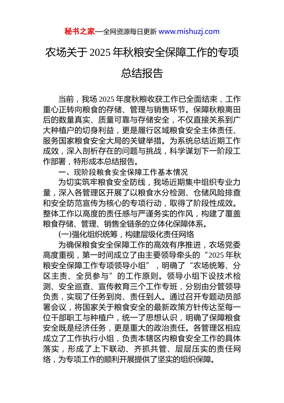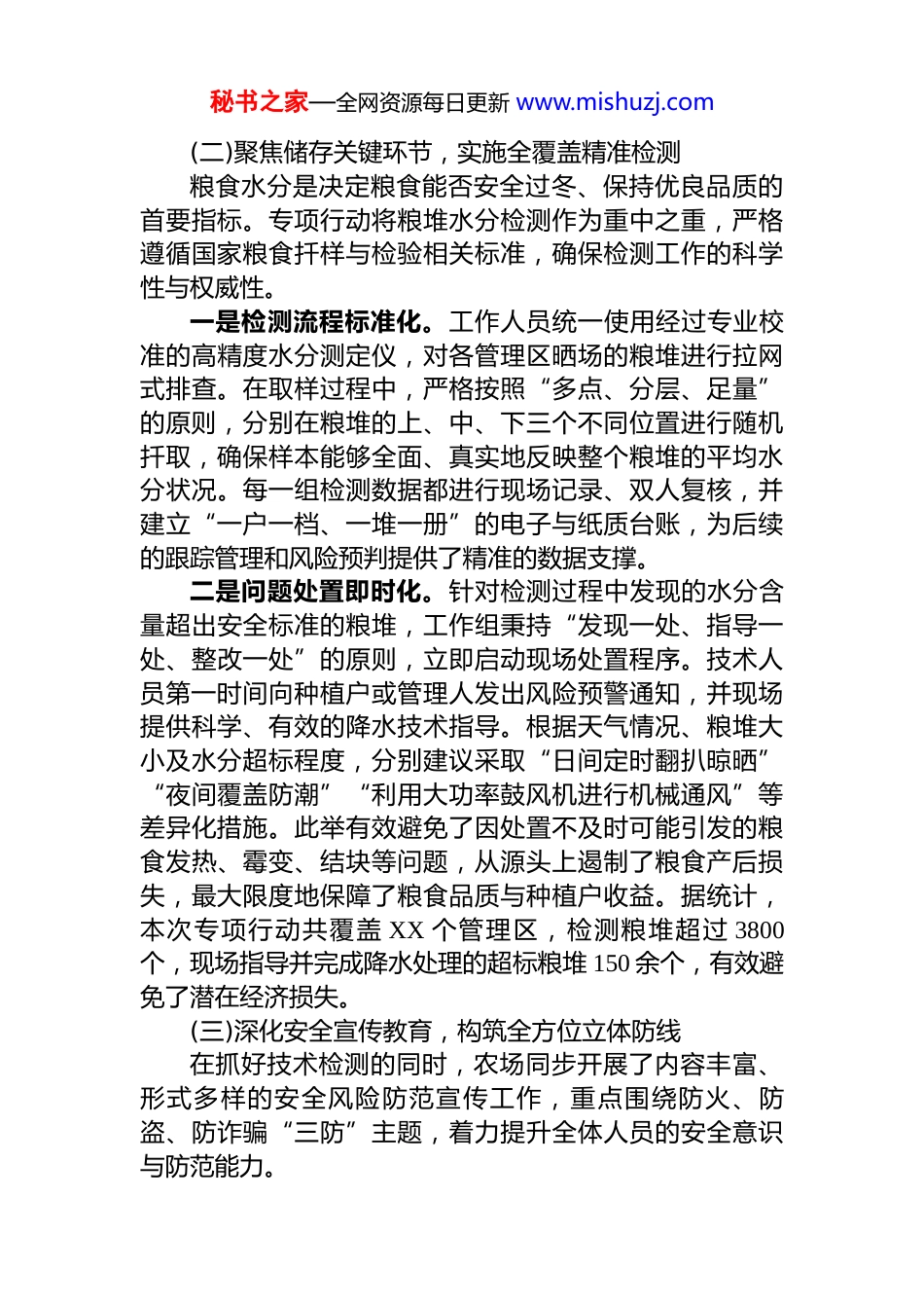 秘书之家—全网资源每日更新 www.mishuzj.com农场关于 2025 年秋粮安全保障工作的专项总结报告当前,我场 2025 年度秋粮收获工作已全面结束,工作重心正转向粮食的存储、管理与销售环节。保障秋粮离田后的数量真实、质量可靠与存储安全,不仅直接关系到广大种植户的切身利益,更是履行区域粮食安全主体责任、服务国家粮食安全大局的关键举措。为系统总结近期工作成效,深入剖析存在的问题与挑战,科学谋划下一阶段工作部署,特形成本总结报告。一、现阶段粮食安全保障工作基本情况为切实筑牢粮食安全防线,我场近期集中组织专业力量,深入各管理区开展了以粮食水分检测、仓储风险排查和安全防范宣传为核心的专项行动,取得了阶段性成效。整体工作以高度的责任感与严谨务实的作风,构建了覆盖粮食存储、管理、销售全链条的立体化保障体系。(一)强化组织统筹,构建层级化责任网络为确保粮食安全保障工作的高效有序推进,农场党委高度重视,第一时间成立了由主要领导牵头的“2025 年秋粮安全保障工作专项领导小组”,明确了“农场统筹、分区主责、全员参与”的工作原则。领导小组下设技术检测、安全巡查、宣传教育三个工作专班,分别由分管领导负责,实现了任务到岗、责任到人。通过召开专题动员部署会议,将国家关于粮食安全的最新政策方针传达至每一位干部职工与种植户,统一了思想认识,明确了保障粮食安全既是经济任务,更是重大的政治责任。各管理区相应成立了工作执行小组,负责本辖区内粮食安全工作的具体落实,形成了上下联动、齐抓共管、层层压实的责任网络,为专项工作的顺利开展提供了坚实的组织保障。秘书之家—全网资源每日更新 www.mishuzj.com(二)聚焦储存关键环节,实施全覆盖精准检测粮食水分是决定粮食能否安全过冬、保持优良品质的首要指标。专项行动将粮堆水分检测作为重中之重,严格遵循国家粮食扦样与检验相关标准,确保检测工作的科学性与权威性。一是检测流程标准化。工作人员统一使用经过专业校准的高精度水分测定仪,对各管理区晒场的粮堆进行拉网式排查。在取样过程中,严格按照“多点、分层、足量”的原则,分别在粮堆的上、中、下三个不同位置进行随机扦取,确保样本能够全面、真实地反映整个粮堆的平均水分状况。每一组检测数据都进行现场记录、双人复核,并建立“一户一档、一堆一册”的电子与纸质台账,为后续的跟踪管理和风险预判提供了精准的数据支撑。二是问题处置即时化。针对检测过程中发现的水分含量超出安全标准的粮堆,工作组秉持“发现一处、指导一处、整改一处”的原则,立即启动现场处置程序。技术人员第一时间向种植户或管理人发出风险预警通知,并现场提供科学、有效的降水技术指导。根据天气情况、粮堆大小及水分超标程度,分别建议采取“日间定时翻扒晾晒”“夜间覆盖防潮”“利用大功率鼓风机进行机械通风”等差异化措施。此举有效避免了因处置不及时可能引发的粮食发热、霉变、结块等问题,从源头上遏制了粮食产后损失,最大限度地保障了粮食品质与种植户收益。据统计,本次专项行动共覆盖 XX 个管理区,检测粮堆超过 3800个,现场指导并完成降水处理的超标粮堆 150 余个,有效避免了潜在经济损失。(三)深化安全宣传教育,构筑全方位立体防线在抓好技术检测的同时,农场同步开展了内容丰富、形式多样的安全风险防范宣传工作,重点围绕防火、防盗、防诈骗“三防”主题,着力提升全体人员的安全意识与防范能力。秘书之家—全网资源每日更新 www.mishuzj.com一是在防火安全上,强调“人防”与“物防”相结合。工作组对各晒场的消防设施配备情况进行了全面检查,包括灭火器的有效性、消防栓的完好性以及消防水源的充足性,对发现的问题要求立查立改。同时,大力宣传安全用火用电常识,严禁在粮堆周边区域吸烟、动用明火或进行电焊等危险作业,并指导管理区及时清理场内及周边的枯草、落叶等易燃物。通过物理隔离与行为规范相结合,构筑了坚实的防火屏障。二是在防盗安全上,推动“技防”与“人防”相补充。针对粮食盗窃风险,工作组指导并协助各管理区升级完善视频监控系统,重点对出入口、主要通道及监控盲区进行优化布局...