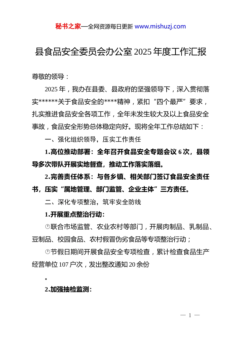 秘书之家—全网资源每日更新 www.mishuzj.com县食品安全委员会办公室 2025 年度工作汇报尊敬的领导:2025 年,我办在县委、县政府的坚强领导下,深入贯彻落实******关于食品安全的****精神,紧扣“四个最严”要求,扎实推进食品安全各项工作,全年未发生较大及以上食品安全事故,食品安全形势总体稳定向好。现将全年工作总结如下:一、强化组织领导,压实工作责任1.高位推动部署:全年召开食品安全专题会议 6 次,县领导多次带队开展实地督查,推动工作落实落细。2.完善责任体系:与各乡镇、相关部门签订食品安全责任书,压实“属地管理、部门监管、企业主体”三方责任。二、深化专项整治,筑牢安全防线1.开展重点整治行动:联合市场监管、农业农村等部门,开展肉制品、乳制品、豆制品、校园食品、农村假冒伪劣食品等专项整治行动;节假日期间开展食品安全专项检查,累计检查食品生产经营单位 107 户次,发出整改通知 20 余份。2.加强抽检监测:— 1 —秘书之家—全网资源每日更新 www.mishuzj.com全年完成食品抽检 4025 批次,不合格样品 130 批次,均已依法处置;开展“你点我检”活动 338 批次,覆盖商超、社区、乡镇等重点区域。三、推进示范创建,提升治理水平1.打造示范点位:创建“浙里食安”示范食品作坊 9 家;建成阳光小作坊 29 家,学校配送企业“阳光配送”覆盖率达 85%。2.推进食安宣传:建立食安科普点 241 个,实现行政村全覆盖;开展“食品安全宣传月”“百姓点检日”等活动,提升群众食品安全意识。四、加强应急管理,提升处置能力1.完善应急机制:修订食品安全事故应急预案,组织开展应急演练 2 次。2.强化信息报送:建立食品安全信息快速通报机制,全年未发生迟报、漏报、瞒报情况。— 2 —秘书之家—全网资源每日更新 www.mishuzj.com五、存在问题与下一步打算存在问题:个别乡镇食品安全基础薄弱,协管员作用发挥不充分;小作坊、小摊贩监管难度大,部分经营者法律意识淡薄;食品抽检不合格率仍需进一步压降。下一步打算:持续推进食品安全“两个责任”落实;深化农村食品安全治理,强化基层协管员培训;加强智慧监管建设,推动“阳光厨房”“阳光作坊”全覆盖;严厉打击食品安全违法犯罪,坚决守住人民群众“舌尖上的安全”。— 3 —