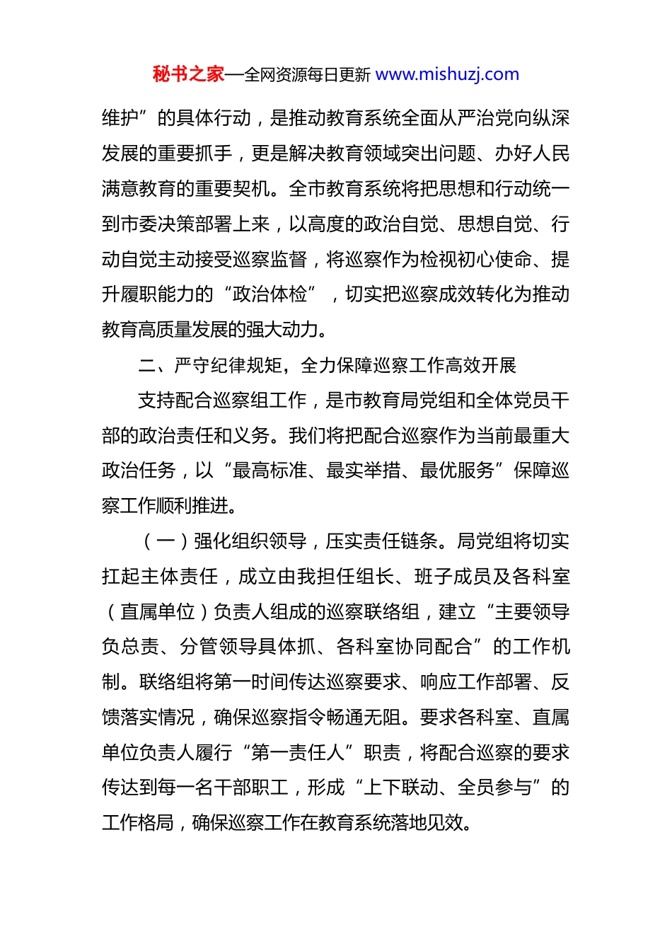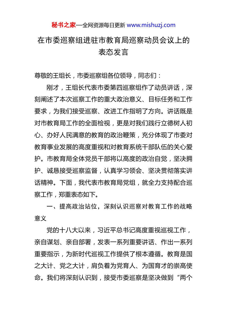 秘书之家—全网资源每日更新 www.mishuzj.com在市委巡察组进驻市教育局巡察动员会议上的表态发言 尊敬的王组长,市委巡察组各位领导,同志们:刚才,王组长代表市委第四巡察组作了动员讲话,深刻阐述了本次巡察工作的重大政治意义、目标任务和工作要求,为我们接受巡察、改进工作指明了方向。讲话既是对市教育局工作的全面检视,更是对我们践行立德树人初心、办好人民满意的教育的政治鞭策,充分体现了市委对教育事业发展的高度重视和对教育系统干部队伍的关心爱护。市教育局全体党员干部将以高度的政治自觉,坚决拥护、诚恳接受巡察监督,认真学习领会、坚决贯彻落实讲话精神。下面,我代表市教育局党组,就全力支持配合巡察工作,郑重表态如下。一、提高政治站位,深刻认识巡察对教育工作的战略意义党的十八大以来,习近平总书记高度重视巡视工作,亲自谋划、亲自部署,发表一系列重要讲话、作出一系列重要指示,为新时代巡视工作提供了根本遵循。教育是国之大计、党之大计,肩负着为党育人、为国育才的崇高使命。我们将深刻认识到,接受市委巡察是坚决做到“两个秘书之家—全网资源每日更新 www.mishuzj.com维护”的具体行动,是推动教育系统全面从严治党向纵深发展的重要抓手,更是解决教育领域突出问题、办好人民满意教育的重要契机。全市教育系统将把思想和行动统一到市委决策部署上来,以高度的政治自觉、思想自觉、行动自觉主动接受巡察监督,将巡察作为检视初心使命、提升履职能力的“政治体检”,切实把巡察成效转化为推动教育高质量发展的强大动力。二、严守纪律规矩,全力保障巡察工作高效开展支持配合巡察组工作,是市教育局党组和全体党员干部的政治责任和义务。我们将把配合巡察作为当前最重大政治任务,以“最高标准、最实举措、最优服务”保障巡察工作顺利推进。(一)强化组织领导,压实责任链条。局党组将切实扛起主体责任,成立由我担任组长、班子成员及各科室(直属单位)负责人组成的巡察联络组,建立“主要领导负总责、分管领导具体抓、各科室协同配合”的工作机制。联络组将第一时间传达巡察要求、响应工作部署、反馈落实情况,确保巡察指令畅通无阻。要求各科室、直属单位负责人履行“第一责任人”职责,将配合巡察的要求传达到每一名干部职工,形成“上下联动、全员参与”的工作格局,确保巡察工作在教育系统落地见效。秘书之家—全网资源每日更新 www.mishuzj.com(二)全面服务保障,主动接受监督。在资料提供上,严格落实巡察组要求,无论是涉及落实立德树人根本任务、教育教学质量提升、“双减”政策推进、校园安全稳定、教育经费管理、教师队伍建设、招生考试公平、职业教育改革、学前教育普及普惠、义务教育优质均衡发展等核心业务领域,均保证第一时间、全面准确、实事求是提供文件、档案、账目等资料,绝不拖延推诿、隐瞒遮掩、弄虚作假。在人员配合上,全力支持巡察组开展个别谈话、座谈调研、下沉学校核查等工作,合理安排相关人员,做到随叫随到、如实汇报、客观反映问题。在后勤保障上,提供符合要求的办公条件和生活环境,为巡察组同志创造高效、便利的工作氛围,确保巡察组能够全面、深入、准确了解教育系统实际情况。(三)严明纪律规矩,端正接受态度。全局党员干部将严守政治纪律和政治规矩,坚决服从巡察安排。对巡察组指出的问题,虚心听取、诚恳接受、不回避不遮掩;对巡察组提出的意见,立行立改、深刻反思;对巡察组移交的线索,严肃核查、及时报告。坚决杜绝干扰巡察、隐瞒事实、打击报复等行为,以最严明的纪律确保巡察工作不受阻碍,以最坦诚的态度接受监督,真正把巡察过程作为锤炼党性、改进作风的过程。秘书之家—全网资源每日更新 www.mishuzj.com三、坚持问题导向,以巡察整改推动教育事业高质量发展巡察的最终目的是“发现问题、形成震慑、推动改革、促进发展”。我们将牢固树立“整改不力是失职,不抓整改是渎职”的理念,把巡察整改作为检验政治担当的“试金石”,聚焦“立德树人”根本任务,做到“即知即改、标本兼治、长效提升”。(一)坚持立行立改,直面问题抓整改。对巡察期间发现的问题,坚持“事不过夜”...