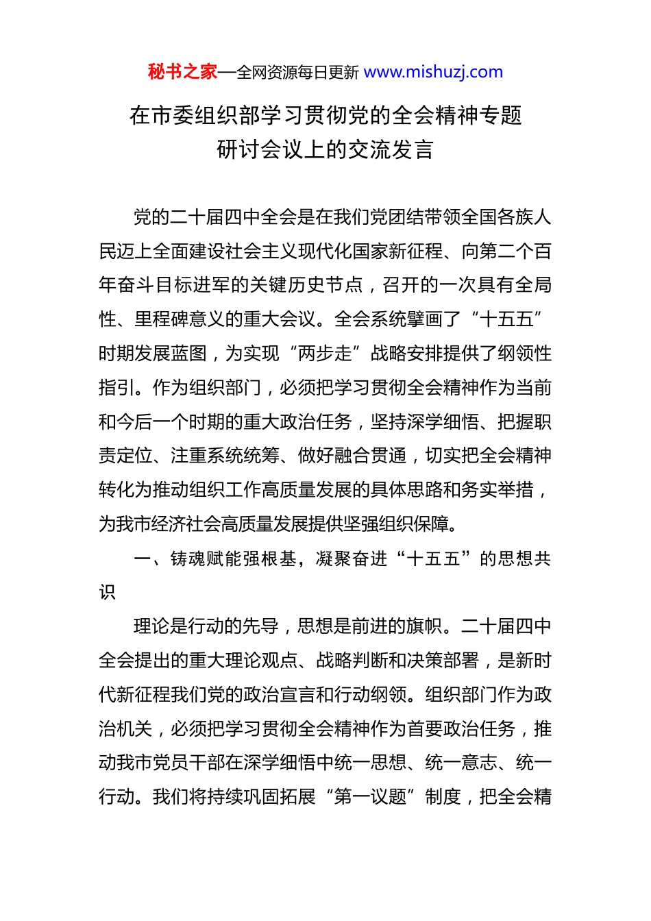 秘书之家—全网资源每日更新 www.mishuzj.com在市委组织部学习贯彻党的全会精神专题研讨会议上的交流发言 党的二十届四中全会是在我们党团结带领全国各族人民迈上全面建设社会主义现代化国家新征程、向第二个百年奋斗目标进军的关键历史节点,召开的一次具有全局性、里程碑意义的重大会议。全会系统擘画了“十五五”时期发展蓝图,为实现“两步走”战略安排提供了纲领性指引。作为组织部门,必须把学习贯彻全会精神作为当前和今后一个时期的重大政治任务,坚持深学细悟、把握职责定位、注重系统统筹、做好融合贯通,切实把全会精神转化为推动组织工作高质量发展的具体思路和务实举措,为我市经济社会高质量发展提供坚强组织保障。一、铸魂赋能强根基,凝聚奋进“十五五”的思想共识理论是行动的先导,思想是前进的旗帜。二十届四中全会提出的重大理论观点、战略判断和决策部署,是新时代新征程我们党的政治宣言和行动纲领。组织部门作为政治机关,必须把学习贯彻全会精神作为首要政治任务,推动我市党员干部在深学细悟中统一思想、统一意志、统一行动。我们将持续巩固拓展“第一议题”制度,把全会精秘书之家—全网资源每日更新 www.mishuzj.com神纳入党委(党组)理论学习中心组、支部“三会一课”、主题党日等学习内容,推动领导干部带头学、带头讲、带头干。依托市委党校主阵地,分层分类开展党员干部全员轮训,重点抓好乡镇(街道)、村(社区)党组织书记和年轻干部专题培训,持续推行“四同”教育模式,实现学习教育全覆盖。注重学用结合,引导广大干部深刻把握“十五五”时期发展主题、主线、主战场,增强推动高质量发展、服务群众、防范化解风险的本领,切实把学习成果转化为谋划工作的思路、推动落实的举措、解决问题的能力。二、选贤任能树导向,建强担当“十五五”的骨干队伍政治路线确定之后,干部就是决定因素。落实“十五五”规划,关键在人,关键在干部。组织部门必须坚持党管干部原则,树立重实干、重实绩、重担当的鲜明用人导向,打造一支政治过硬、适应新时代要求、具备领导现代化建设能力的高素质专业化干部队伍。我们将做深做实干部政治素质考察,突出把好政治关、廉洁关、能力关,大力选拔使用在改革发展稳定一线、急难险重任务中敢于负责、勇于担当、善于作为、实绩突出的干部。严格落实《推进领导干部能上能下规定》,推动形成能者上、优者秘书之家—全网资源每日更新 www.mishuzj.com奖、庸者下、劣者汰的良性循环。强化干部专业训练和实践锻炼,围绕产业发展、乡村振兴、基层治理等重点领域,开展“点单式”培训,有计划地选派优秀年轻干部到一线墩苗历练,提升实战能力。坚持严管厚爱结合,加强对干部的全方位管理和经常性监督,落实谈心谈话、带薪休假、体检疗养等关爱措施,旗帜鲜明为担当者担当、为负责者负责,营造风清气正、干事创业的良好政治生态。三、强基固本提质效,筑牢支撑“十五五”的坚强堡垒基础不牢,地动山摇。基层党组织是党的全部工作和战斗力的基础。二十届四中全会对增强基层党组织政治功能和组织功能提出了明确要求。我市作为省域中心城市,农村面积大、人口多,必须把抓基层打基础作为长远之计和固本之策,推动基层党组织全面进步、全面过硬。我们将牢固树立大抓基层的鲜明导向,以提升组织力为重点,统筹推进农村、社区、机关、学校、国企等各领域党建提质增效。扎实推进抓党建促乡村振兴,高质量筹备 2026 年集中换届工作,选优配强“领头雁”,优化班子结构,提升整体功能。用好村级后备人才“雁阵”培育工程,发挥好到村任职大学生作用。常态化整顿软弱涣散村党组织,推行“一村一策”,提升基层党组织凝聚力和战斗力。深秘书之家—全网资源每日更新 www.mishuzj.com化党建引领基层治理,完善“街乡吹哨、部门报到”机制,优化平急转换工作体系,提升基层治理精细化、现代化水平。严格党员发展和教育管理,突出政治标准,抓好流动党员管理,建立健全党员在应急状态下发挥作用机制,充分发挥党员先锋模范作用。四、聚才引智增活力,汇聚服务“十五五”的智力支撑功以才成,业由才广。二十届四中全会再次强调“深入实施...