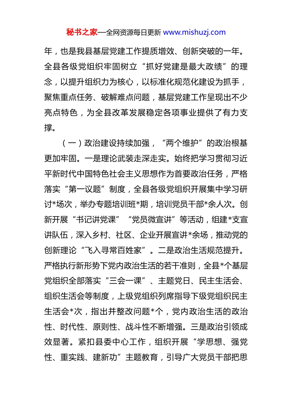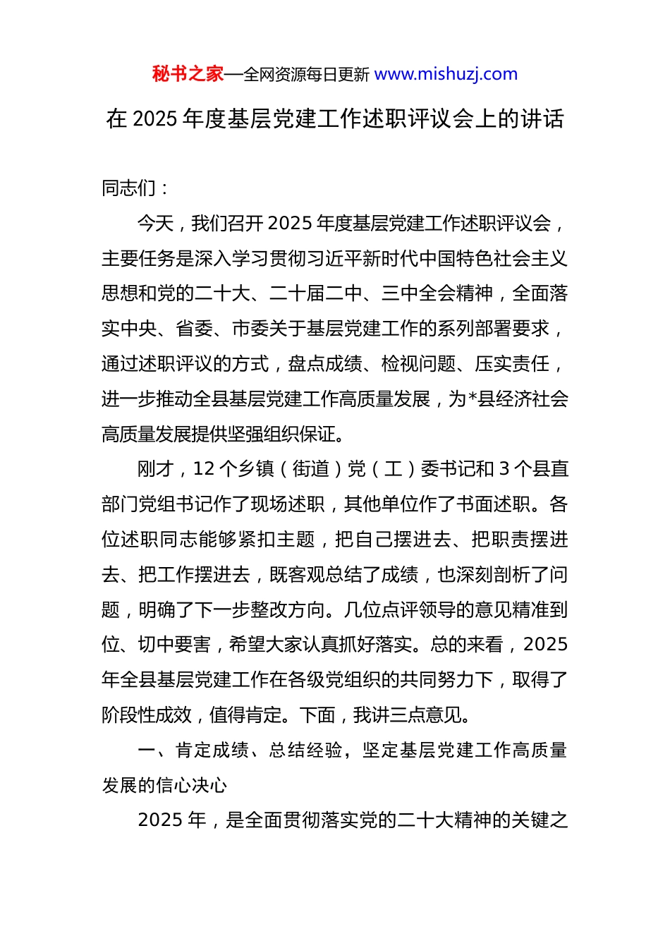 秘书之家—全网资源每日更新 www.mishuzj.com在 2025 年度基层党建工作述职评议会上的讲话 同志们:今天,我们召开 2025 年度基层党建工作述职评议会,主要任务是深入学习贯彻习近平新时代中国特色社会主义思想和党的二十大、二十届二中、三中全会精神,全面落实中央、省委、市委关于基层党建工作的系列部署要求,通过述职评议的方式,盘点成绩、检视问题、压实责任,进一步推动全县基层党建工作高质量发展,为*县经济社会高质量发展提供坚强组织保证。刚才,12 个乡镇(街道)党(工)委书记和 3 个县直部门党组书记作了现场述职,其他单位作了书面述职。各位述职同志能够紧扣主题,把自己摆进去、把职责摆进去、把工作摆进去,既客观总结了成绩,也深刻剖析了问题,明确了下一步整改方向。几位点评领导的意见精准到位、切中要害,希望大家认真抓好落实。总的来看,2025年全县基层党建工作在各级党组织的共同努力下,取得了阶段性成效,值得肯定。下面,我讲三点意见。一、肯定成绩、总结经验,坚定基层党建工作高质量发展的信心决心2025 年,是全面贯彻落实党的二十大精神的关键之秘书之家—全网资源每日更新 www.mishuzj.com年,也是我县基层党建工作提质增效、创新突破的一年。全县各级党组织牢固树立“抓好党建是最大政绩”的理念,以提升组织力为核心,以标准化规范化建设为抓手,聚焦重点任务、破解难点问题,基层党建工作呈现出不少亮点特色,为全县改革发展稳定各项事业提供了有力支撑。(一)政治建设持续加强,“两个维护”的政治根基更加牢固。一是理论武装走深走实。始终把学习贯彻习近平新时代中国特色社会主义思想作为首要政治任务,严格落实“第一议题”制度,全县各级党组织开展集中学习研讨*场次,举办专题培训班*期,培训党员干部*余人次。创新开展“书记讲党课”“党员微宣讲”等活动,组建*支宣讲队伍,深入乡村、社区、企业开展宣讲*余场,推动党的创新理论“飞入寻常百姓家”。二是政治生活规范提升。严格执行新形势下党内政治生活的若干准则,全县*个基层党组织全部落实“三会一课”、主题党日、民主生活会、组织生活会等制度,上级党组织列席指导下级党组织民主生活会*次,指出并整改问题*个,党内政治生活的政治性、时代性、原则性、战斗性不断增强。三是政治引领成效显著。紧扣县委中心工作,组织开展“学思想、强党性、重实践、建新功”主题教育,引导广大党员干部把思秘书之家—全网资源每日更新 www.mishuzj.com想和行动统一到县委决策部署上来。在重大项目建设、乡村振兴、信访维稳等一线设立“党员先锋岗”“党员责任区”*个,党员干部冲锋在前、攻坚克难,切实把“两个维护”体现在具体行动上。(二)组织体系不断健全,基层党组织的战斗堡垒作用更加凸显。一是基层党组织覆盖全面夯实。坚持“应建尽建、设置规范、运行高效”原则,优化调整基层党组织设置*个,新建非公企业和社会组织党组织*个,实现全县机关、乡村、社区、学校、医院、企业等领域党组织全覆盖。扎实推进党支部标准化规范化建设,投入*万元用于基层党组织活动场所升级改造,打造标准化党支部*个,其中省级示范党支部*个、市级示范党支部*个。二是基层党组织书记队伍建设加强。严格按照“政治素质好、工作能力强、群众威信高”的标准,选优配强基层党组织书记*名,其中村(社区)党组织书记*名。开展基层党组织书记“擂台比武”*场次,组织*名村(社区)党组织书记赴先进地区考察学习,提升履职能力。建立基层党组织书记绩效考核机制,将考核结果与薪酬待遇、评先评优挂钩,激发干事创业活力。三是软弱涣散党组织整顿成效明显。采取“一村一策”“一支部一方案”的方式,对排查出的*个软弱涣散基层党组织进行集中整顿。县级领导带头包联,选秘书之家—全网资源每日更新 www.mishuzj.com派*名第一书记和驻村工作队员驻村帮扶,投入整顿资金*万元,解决群众急难愁盼问题*个,软弱涣散基层党组织全部实现转化提升。(三)党员队伍建设提质增效,先锋模范作用更加突出。一是党员发展质量不断提高。严格执行党员发展“控制总量、优化结构、提高质量、发挥作用”的总要求...