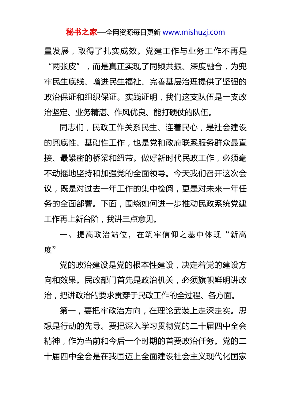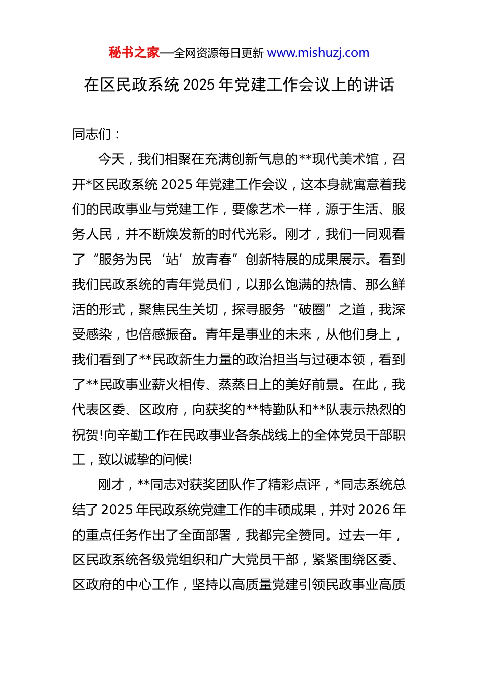 秘书之家—全网资源每日更新 www.mishuzj.com在区民政系统 2025 年党建工作会议上的讲话 同志们:今天,我们相聚在充满创新气息的**现代美术馆,召开*区民政系统 2025 年党建工作会议,这本身就寓意着我们的民政事业与党建工作,要像艺术一样,源于生活、服务人民,并不断焕发新的时代光彩。刚才,我们一同观看了“服务为民‘站’放青春”创新特展的成果展示。看到我们民政系统的青年党员们,以那么饱满的热情、那么鲜活的形式,聚焦民生关切,探寻服务“破圈”之道,我深受感染,也倍感振奋。青年是事业的未来,从他们身上,我们看到了**民政新生力量的政治担当与过硬本领,看到了**民政事业薪火相传、蒸蒸日上的美好前景。在此,我代表区委、区政府,向获奖的**特勤队和**队表示热烈的祝贺!向辛勤工作在民政事业各条战线上的全体党员干部职工,致以诚挚的问候!刚才,**同志对获奖团队作了精彩点评,*同志系统总结了 2025 年民政系统党建工作的丰硕成果,并对 2026 年的重点任务作出了全面部署,我都完全赞同。过去一年,区民政系统各级党组织和广大党员干部,紧紧围绕区委、区政府的中心工作,坚持以高质量党建引领民政事业高质秘书之家—全网资源每日更新 www.mishuzj.com量发展,取得了扎实成效。党建工作与业务工作不再是“两张皮”,而是真正实现了同频共振、深度融合,为兜牢民生底线、增进民生福祉、完善基层治理提供了坚强的政治保证和组织保证。实践证明,我们这支队伍是一支政治坚定、业务精湛、作风优良、能打硬仗的队伍。同志们,民政工作关系民生、连着民心,是社会建设的兜底性、基础性工作,也是党和政府联系服务群众最直接、最紧密的桥梁和纽带。做好新时代民政工作,必须毫不动摇地坚持和加强党的全面领导。今天我们召开这次会议,既是对过去一年工作的集中检阅,更是对未来一年任务的全面部署。下面,围绕如何进一步推动民政系统党建工作再上新台阶,我讲三点意见。一、提高政治站位,在筑牢信仰之基中体现“新高度”党的政治建设是党的根本性建设,决定着党的建设方向和效果。民政部门首先是政治机关,必须旗帜鲜明讲政治,把讲政治的要求贯穿于民政工作的全过程、各方面。第一,要把牢政治方向,在理论武装上走深走实。思想是行动的先导。要把深入学习贯彻党的二十届四中全会精神,作为当前和今后一个时期的首要政治任务。党的二十届四中全会是在我国迈上全面建设社会主义现代化国家秘书之家—全网资源每日更新 www.mishuzj.com新征程、向第二个百年奋斗目标进军的关键时刻召开的一次十分重要的会议,为我们未来的发展指明了前进方向、提供了根本遵循。民政系统各级党组织要迅速组织传达学习,领导干部要带头学、深入学,确保全会精神入脑入心。要深刻领悟“两个确立”的决定性意义,把“两个维护”作为最高政治原则和根本政治规矩,不断提高政治判断力、政治领悟力、政治执行力,确保党中央的各项决策部署在**民政系统不折不扣得到贯彻落实。我们全系统拥有近 50 个基层党支部、上千名党员,2025 年我们高质量发展了 30 名新党员,组织了超过 200 场次的主题党日活动,党员参学率超过 95%,这充分说明我们的组织基础是坚实的。下一步,要持续巩固拓展主题教育成果,将理论学习常态化、制度化,真正做到学思用贯通、知信行统一。第二,要站稳政治立场,在为民服务中践行初心。江山就是人民,人民就是江山。民政工作的本质就是做群众工作,我们的政治立场就是人民立场。要把党的领导具体地、生动地体现在每一次政策落实、每一次入户探访、每一次窗口服务中。例如,当我们在落实社会救助政策时,是否做到了精准识别、应保尽保,让困难群众感受到党和政府的温暖?当我们在推进养老服务时,是否真正从老年人秘书之家—全网资源每日更新 www.mishuzj.com的视角出发,解决了他们“急难愁盼”的实际问题?当我们在深化社区治理时,是否有效发动了党员、凝聚了群众,共同建设美好家园?这些都是检验我们政治立场是否坚定的“试金石”。必须坚持把人民对美好生活的向往作为奋斗目标,用心用情用力解决好群众的操心事、烦心事、揪心事,让我们的工作...