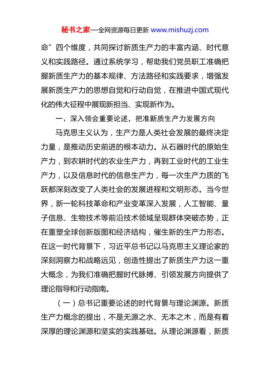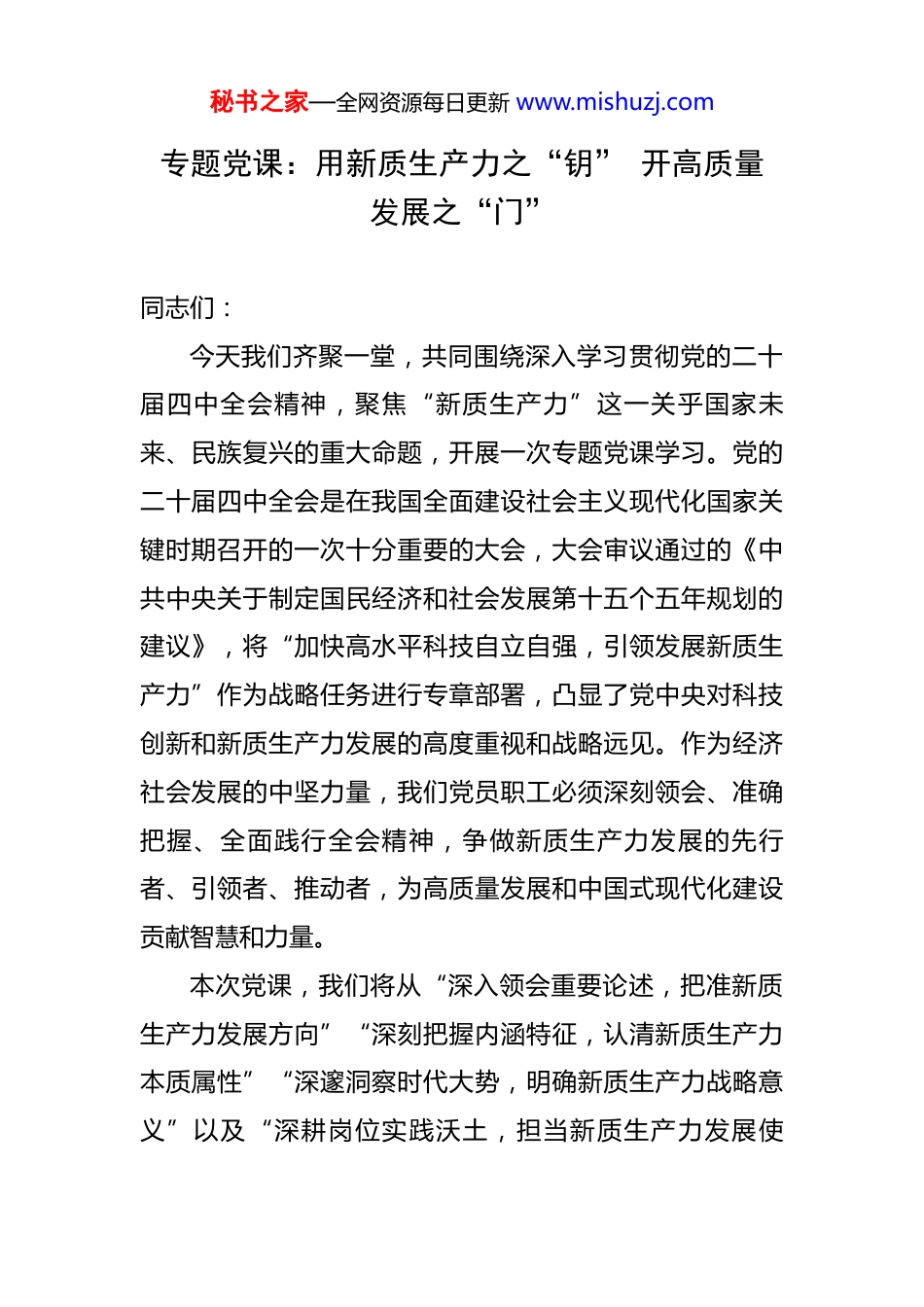 秘书之家—全网资源每日更新 www.mishuzj.com专题党课:用新质生产力之“钥” 开高质量发展之“门” 同志们:今天我们齐聚一堂,共同围绕深入学习贯彻党的二十届四中全会精神,聚焦“新质生产力”这一关乎国家未来、民族复兴的重大命题,开展一次专题党课学习。党的二十届四中全会是在我国全面建设社会主义现代化国家关键时期召开的一次十分重要的大会,大会审议通过的《中共中央关于制定国民经济和社会发展第十五个五年规划的建议》,将“加快高水平科技自立自强,引领发展新质生产力”作为战略任务进行专章部署,凸显了党中央对科技创新和新质生产力发展的高度重视和战略远见。作为经济社会发展的中坚力量,我们党员职工必须深刻领会、准确把握、全面践行全会精神,争做新质生产力发展的先行者、引领者、推动者,为高质量发展和中国式现代化建设贡献智慧和力量。本次党课,我们将从“深入领会重要论述,把准新质生产力发展方向”“深刻把握内涵特征,认清新质生产力本质属性”“深邃洞察时代大势,明确新质生产力战略意义”以及“深耕岗位实践沃土,担当新质生产力发展使秘书之家—全网资源每日更新 www.mishuzj.com命”四个维度,共同探讨新质生产力的丰富内涵、时代意义和实践路径。通过系统学习,帮助我们党员职工准确把握新质生产力的基本规律、方法路径和实践要求,增强发展新质生产力的思想自觉和行动自觉,在推进中国式现代化的伟大征程中展现新担当、实现新作为。一、深入领会重要论述,把准新质生产力发展方向马克思主义认为,生产力是人类社会发展的最终决定力量,是推动历史前进的根本动力。从石器时代的原始生产力,到农耕时代的农业生产力,再到工业时代的工业生产力,以及信息时代的信息生产力,每一次生产力质的飞跃都深刻改变了人类社会的发展进程和文明形态。当今世界,新一轮科技革命和产业变革深入发展,人工智能、量子信息、生物技术等前沿技术领域呈现群体突破态势,正在重塑全球创新版图和经济结构,催生新的生产力形态。在这一时代背景下,习近平总书记以马克思主义理论家的深刻洞察力和战略远见,创造性提出了新质生产力这一重大概念,为我们准确把握时代脉搏、引领发展方向提供了理论指导和行动指南。(一)总书记重要论述的时代背景与理论渊源。新质生产力概念的提出,不是无源之水、无本之木,而是有着深厚的理论渊源和坚实的实践基础。从理论渊源看,新质秘书之家—全网资源每日更新 www.mishuzj.com生产力继承和发展了马克思主义生产力理论,是马克思主义生产力理论中国化时代化的最新成果。马克思主义认为,生产力是人类社会发展的最终决定力量,是生产方式的物质内容,生产关系则是其社会形式。生产力决定生产关系,生产关系反作用于生产力,这是人类社会发展的基本规律。马克思在《资本论》中分析了劳动过程中的简单要素,包括“有目的的活动或劳动本身、劳动对象和劳动资料”,这实质上就是从生产力要素角度对生产过程的解析。习近平总书记提出的新质生产力概念,坚持和继承了马克思主义生产力理论的基本原理,同时结合新时代新征程的新实践新要求,对生产力理论作出了原创性贡献。从实践基础看,新质生产力概念的提出,建立在对国内外发展环境和发展阶段的深刻洞察之上。从国际看,当今世界正经历百年未有之大变局,新一轮科技革命和产业变革深入发展,国际力量对比深刻调整,全球科技竞争空前激烈。科技创新成为国际战略博弈的主要战场,围绕科技制高点的竞争日趋白热化。从国内看,我国已进入高质量发展阶段,经济发展从高速增长转向中高速增长,传统动力减弱,资源环境约束趋紧,需要新的动力引擎推动经济持续健康发展。同时,我国科技发展取得历史性成就,国家综合创新能力从 2020 年的第 14 位提升至 2024 年的第秘书之家—全网资源每日更新 www.mishuzj.com10 位,具备了引领新质生产力发展的基础和条件。基于这样的国内外形势,习近平总书记审时度势,提出新质生产力这一重大概念,为我国抢占未来发展制高点、塑造国际竞争新优势指明了方向。(二)新质生产力概念的提出与发展脉络。新质生产力这一重大概念的提出和发展,...
