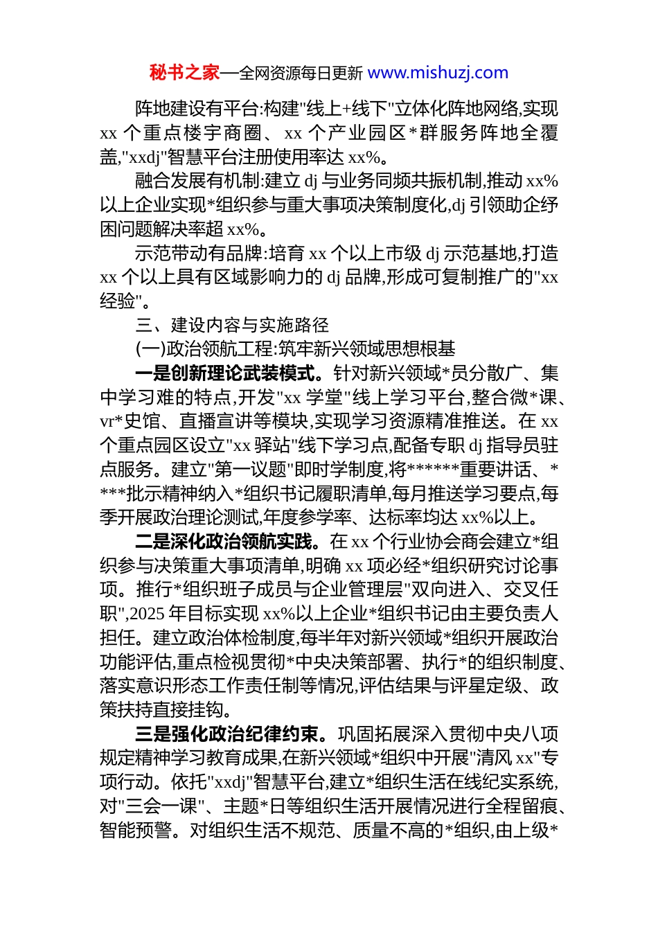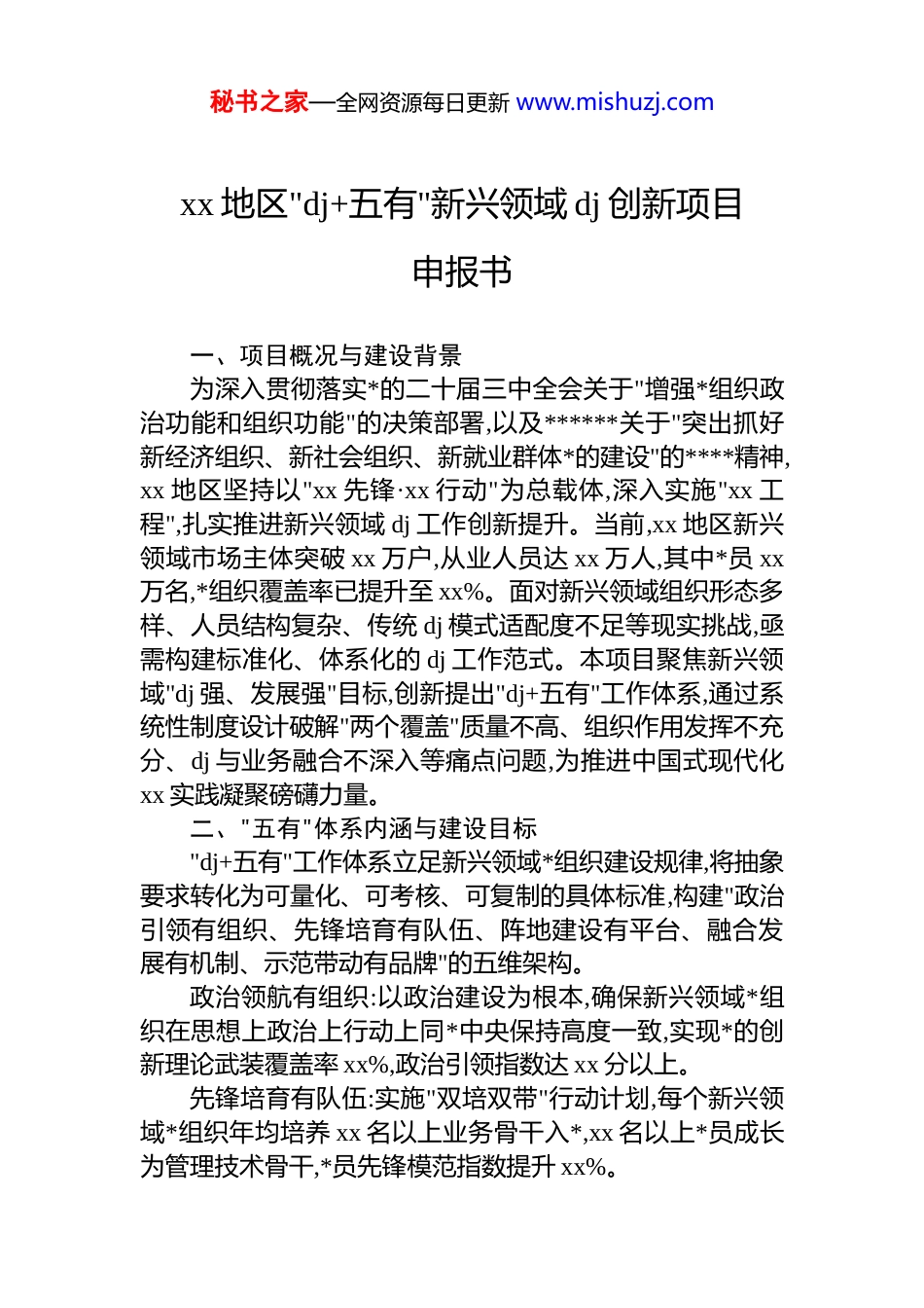 秘书之家—全网资源每日更新 www.mishuzj.comxx 地区"dj+五有"新兴领域 dj 创新项目申报书一、项目概况与建设背景为深入贯彻落实*的二十届三中全会关于"增强*组织政治功能和组织功能"的决策部署,以及******关于"突出抓好新经济组织、新社会组织、新就业群体*的建设"的****精神,xx 地区坚持以"xx 先锋·xx 行动"为总载体,深入实施"xx 工程",扎实推进新兴领域 dj 工作创新提升。当前,xx 地区新兴领域市场主体突破 xx 万户,从业人员达 xx 万人,其中*员 xx万名,*组织覆盖率已提升至 xx%。面对新兴领域组织形态多样、人员结构复杂、传统 dj 模式适配度不足等现实挑战,亟需构建标准化、体系化的 dj 工作范式。本项目聚焦新兴领域"dj 强、发展强"目标,创新提出"dj+五有"工作体系,通过系统性制度设计破解"两个覆盖"质量不高、组织作用发挥不充分、dj 与业务融合不深入等痛点问题,为推进中国式现代化xx 实践凝聚磅礴力量。二、"五有"体系内涵与建设目标"dj+五有"工作体系立足新兴领域*组织建设规律,将抽象要求转化为可量化、可考核、可复制的具体标准,构建"政治引领有组织、先锋培育有队伍、阵地建设有平台、融合发展有机制、示范带动有品牌"的五维架构。政治领航有组织:以政治建设为根本,确保新兴领域*组织在思想上政治上行动上同*中央保持高度一致,实现*的创新理论武装覆盖率 xx%,政治引领指数达 xx 分以上。先锋培育有队伍:实施"双培双带"行动计划,每个新兴领域*组织年均培养 xx 名以上业务骨干入*,xx 名以上*员成长为管理技术骨干,*员先锋模范指数提升 xx%。秘书之家—全网资源每日更新 www.mishuzj.com阵地建设有平台:构建"线上+线下"立体化阵地网络,实现xx 个重点楼宇商圈、 xx 个产业园区*群服务阵地全覆盖,"xxdj"智慧平台注册使用率达 xx%。融合发展有机制:建立 dj 与业务同频共振机制,推动 xx%以上企业实现*组织参与重大事项决策制度化,dj 引领助企纾困问题解决率超 xx%。示范带动有品牌:培育 xx 个以上市级 dj 示范基地,打造xx 个以上具有区域影响力的 dj 品牌,形成可复制推广的"xx经验"。三、建设内容与实施路径(一)政治领航工程:筑牢新兴领域思想根基一是创新理论武装模式。针对新兴领域*员分散广、集中学习难的特点,开发"xx 学堂"线上学习平台,整合微*课、vr*史馆、直播宣讲等模块,实现学习资源精准推送。在 xx个重点园区设立"xx 驿站"线下学习点,配备专职 dj 指导员驻点服务。建立"第一议题"即时学制度,将******重要讲话、****批示精神纳入*组织书记履职清单,每月推送学习要点,每季开展政治理论测试,年度参学率、达标率均达 xx%以上。二是深化政治领航实践。在 xx 个行业协会商会建立*组织参与决策重大事项清单,明确 xx 项必经*组织研究讨论事项。推行*组织班子成员与企业管理层"双向进入、交叉任职",2025 年目标实现 xx%以上企业*组织书记由主要负责人担任。建立政治体检制度,每半年对新兴领域*组织开展政治功能评估,重点检视贯彻*中央决策部署、执行*的组织制度、落实意识形态工作责任制等情况,评估结果与评星定级、政策扶持直接挂钩。三是强化政治纪律约束。巩固拓展深入贯彻中央八项规定精神学习教育成果,在新兴领域*组织中开展"清风 xx"专项行动。依托"xxdj"智慧平台,建立*组织生活在线纪实系统,对"三会一课"、主题*日等组织生活开展情况进行全程留痕、智能预警。对组织生活不规范、质量不高的*组织,由上级*秘书之家—全网资源每日更新 www.mishuzj.com组织书记进行约谈提醒,情节严重的予以整顿。2025 年实现组织生活规范率达 xx%,*员违纪违法案件较 2024 年下降 xx%。(二)组织覆盖工程:构建全域贯通 dj 网络一是推进"两个覆盖"攻坚提质。启动新兴领域*组织建设"磐石计划",采取单独组建、行业统建、楼宇联建、园区聚建等方式,2025 年新建*组织 xx 个,覆盖"三有"非公企业 xx家、社会组织 xx 家。同步推进群团组织建设,新建工会组织xx 个、共青团组织 xx 个、妇联组织 xx 个,实现*的工作覆盖率达 xx%。对暂不具备组建条件的,选派 xx 名 dj 指导员入驻,实现工作覆盖 xx%。二是建设...