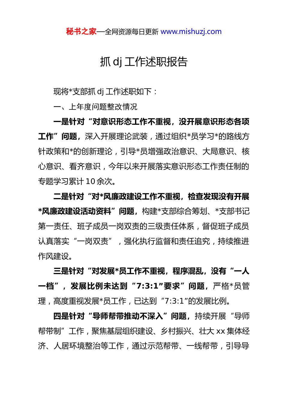 秘书之家—全网资源每日更新 www.mishuzj.com抓 dj 工作述职报告现将*支部抓 dj 工作述职如下:一、上年度问题整改情况一是针对“对意识形态工作不重视,没开展意识形态各项工作”问题,深入开展理论武装,通过组织*员学习*的路线方针政策和*的创新理论,引导*员增强政治意识、大局意识、核心意识、看齐意识,今年以来开展落实意识形态工作责任制的专题学习累计 10 余次。二是针对“对*风廉政建设工作不重视,检查发现没有开展*风廉政建设活动资料”问题,构建*支部综合筹划、*支部书记第一责任、班子成员一岗双责的三级责任体系,督促班子成员认真落实“一岗双责”,强化执行监督和责任追究,持续推进作风建设。三是针对“对发展*员工作不重视,程序混乱,没有“一人一档”,发展比例未达到“7:3:1”要求”问题,严格*员管理,高度重视发展*员工作,已达到“7:3:1”的发展比例。四是针对“导师帮带推动不深入”问题,持续开展“导师帮带制”工作,聚焦基层组织建设、乡村振兴、壮大 xx 集体经济、人居环境整治等工作,通过示范帮带、一线帮带,引导导秘书之家—全网资源每日更新 www.mishuzj.com师带领“徒弟”快速进入角色、熟悉业务。五是针对“连务监督运转不规范”问题,将连务监督委员会纳入基层组织建设范畴,与 xx 各项工作同部署、同检查、同落实,今年累计召开连务监督委员业务培训 2 轮,参训 10 人次。六是针对“抓问题整改工作不力”问题,采取“*支部+合作社+职工”“龙头企业+合作社+职工”“xx 经济+能人+合作社+市场”“连社合一”等发展模式,推进 xx 资源变资产、资金变股金、职工变股东改革,今年特色种植西葫芦 74 亩地。二、主要工作成效一是突出*员干部队伍建设。以开展八项规定学习教育为契机,通过集中学习、专题讲座、线上学习等多种形式,深入学习*章*规,始终将理论学习贯穿*员教育的全过程,不断创新学习形式,使*员做到学思用贯通、知信行统一。累计开展“三会一课”xx 次、“主题*日”xx 次,开展集中学习 xx 次,按照团要求逐项列出学习内容,指明学习方向,梳理学习要点,xx名*员结合本职工作谈学习体会和心得。积极发现和培养优秀人才,发展入*积极分子 xx 名,发展对象 xx 名,转正*员 xx名,为*组织注入新鲜血液,注重考察他们的政治素质、道德品秘书之家—全网资源每日更新 www.mishuzj.com质和工作能力,确保新*员的质量。二是突出 xx 面貌整体提升。持续开展人居环境整治,合计开展人居环境整治 20 余次。持续加大绿化工程建设,通过植绿、补绿、扩绿的方式,xx 个人造林面积已达到 xx 亩,种植灌木 xx 余株。严格落实由*支部书记担任林长、*支部副书记担任副林长的林长制及 xx“两委”包地块的绿化包保责任制,压紧压实工作责任,统筹协调、分工协作,逐层签订造林责任状,与各造林地块责任人签订管护责任合同,做到层层下任务、级级落责任、处处保成活。三是突出 dj 引领社会治理。坚持以开展群众身边不正之风和腐败问题集中整治工作为抓手,紧盯群众“急难愁盼”问题,坚持从“小切口”入手,找准民生领域的痛点难点堵点问题,突出重点、上下贯通抓好 15 件群众身边具体实事,让群众看到新变化、得到真实惠。持续做好信访稳定,*员、两委、联户长、网格长带头分片包网格进行零遗漏登记排查,组建*员先锋队宣传知识。促进联户长作用发挥,积极做好入户走访和矛盾纠纷化解工作。严格贯彻落实四议两公开流程,修改连规民约、xx 运转经费预算、经营地竟包底价、追加 10 万元 xx 运转经费预算,均严格按照四议两公开流程规范执行,xx 经费预算执行率完成 62.45%、经营地上交款完成率 100%、房屋欠秘书之家—全网资源每日更新 www.mishuzj.com款完成一户清欠,按流程完善 xx 机库出租出借资料。三、存在的问题一是思想认识不到位。对 dj 工作的重要性认识不足,缺乏应有的责任感和使命感。在日常工作中,往往将 dj 工作与业务工作相割裂,导致 dj 工作与业务工作“两张皮”。二是组织生活不规范。在组织生活上存在不规范现象,如会议召开不及时、内容不充实、形式单一等。这些...