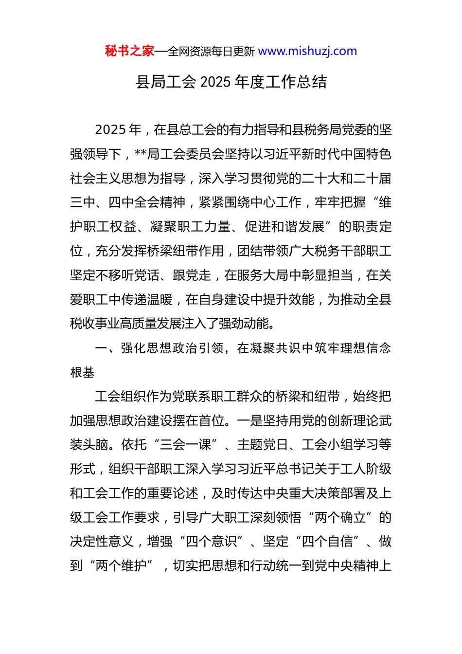 秘书之家—全网资源每日更新 www.mishuzj.com县局工会 2025 年度工作总结 2025 年,在县总工会的有力指导和县税务局党委的坚强领导下,**局工会委员会坚持以习近平新时代中国特色社会主义思想为指导,深入学习贯彻党的二十大和二十届三中、四中全会精神,紧紧围绕中心工作,牢牢把握“维护职工权益、凝聚职工力量、促进和谐发展”的职责定位,充分发挥桥梁纽带作用,团结带领广大税务干部职工坚定不移听党话、跟党走,在服务大局中彰显担当,在关爱职工中传递温暖,在自身建设中提升效能,为推动全县税收事业高质量发展注入了强劲动能。一、强化思想政治引领,在凝聚共识中筑牢理想信念根基工会组织作为党联系职工群众的桥梁和纽带,始终把加强思想政治建设摆在首位。一是坚持用党的创新理论武装头脑。依托“三会一课”、主题党日、工会小组学习等形式,组织干部职工深入学习习近平总书记关于工人阶级和工会工作的重要论述,及时传达中央重大决策部署及上级工会工作要求,引导广大职工深刻领悟“两个确立”的决定性意义,增强“四个意识”、坚定“四个自信”、做到“两个维护”,切实把思想和行动统一到党中央精神上秘书之家—全网资源每日更新 www.mishuzj.com来。全年共组织集中学习 18 次,开展专题研讨 6 场,覆盖职工 600 余人次。二是深化理想信念教育。结合庆祝新中国成立 76 周年、纪念五四运动 106 周年等重要节点,组织开展“赓续红色血脉践行税务初心”主题实践活动,组织参观革命纪念馆、重温入党誓词、观看红色影片等活动,进一步激发干部职工爱党爱国热情。三是弘扬新时代税务精神。大力选树先进典型,推荐评选市级“五一劳动奖章”1 人、县级“最美职工”2 人,通过内部宣传栏、微信公众号等平台广泛宣传先进事迹,营造崇尚先进、学习先进、争当先进的浓厚氛围,激励广大职工在本职岗位上建功立业。二、聚焦主责主业履职,在服务大局中展现工会担当作为紧扣税收改革发展主线,找准工会工作与业务工作的结合点,主动融入、积极作为。一是广泛开展岗位建功活动。围绕落实新的组合式税费支持政策、优化税收营商环境等重点工作,联合业务部门组织开展“岗位练兵强技能服务发展当先锋”系列活动,举办办税服务厅技能比武、税收政策知识竞赛、征管系统操作大赛等竞赛活动 7 场,参与职工达 420 人次,有效提升了干部职工的专业素养和服务能力。二是积极推动合理化建议征集。畅通职工建言秘书之家—全网资源每日更新 www.mishuzj.com献策渠道,组织开展“我为税收发展献一策”活动,累计收集涉及征管改革、信息化建设、纳税服务等方面的合理化建议 83 条,其中 32 条被相关部门采纳并转化为具体工作举措,充分体现了职工主人翁意识和集体智慧。三是助力青年干部成长成才。针对青年职工占比高的特点,实施“青苗培育计划”,建立“导师带徒”机制,组织业务骨干与青年干部结对帮扶;举办“青年讲堂”6 期,邀请系统内外专家授课,内容涵盖税收实务、公文写作、心理调适等多个方面,帮助青年职工快速成长、全面发展。三、倾情关心关爱职工,在暖心服务中传递组织温情始终坚持“职工至上”理念,用心用情用力解决职工急难愁盼问题,不断增强职工的归属感、幸福感。一是扎实做好困难职工帮扶。建立健全困难职工档案动态管理机制,对因病、因灾等原因造成生活困难的 5 名职工家庭进行精准帮扶,发放慰问金及物资共计 2.3 万元,并协调医保、民政等部门落实相关政策,切实做到雪中送炭、纾困解难。二是丰富职工精神文化生活。依托职工之家、阅览室、健身角等阵地,组织开展形式多样、健康向上的文体活动。成功举办迎新春联欢会、职工趣味运动会、“书香税务”读书分享会、“浓情端午·粽叶飘香”包粽子比赛等活动 12 场,参与人数超 800 人次,有效缓解了工作压秘书之家—全网资源每日更新 www.mishuzj.com力,增进了同事感情。三是关注职工身心健康。联合县人民医院开展“健康护航”行动,组织全体在职职工进行年度体检,建立个人健康档案;邀请心理专家举办“压力管理与情绪调节”专题讲座,帮助职工掌握科学的心理调适方法;设立心理健...