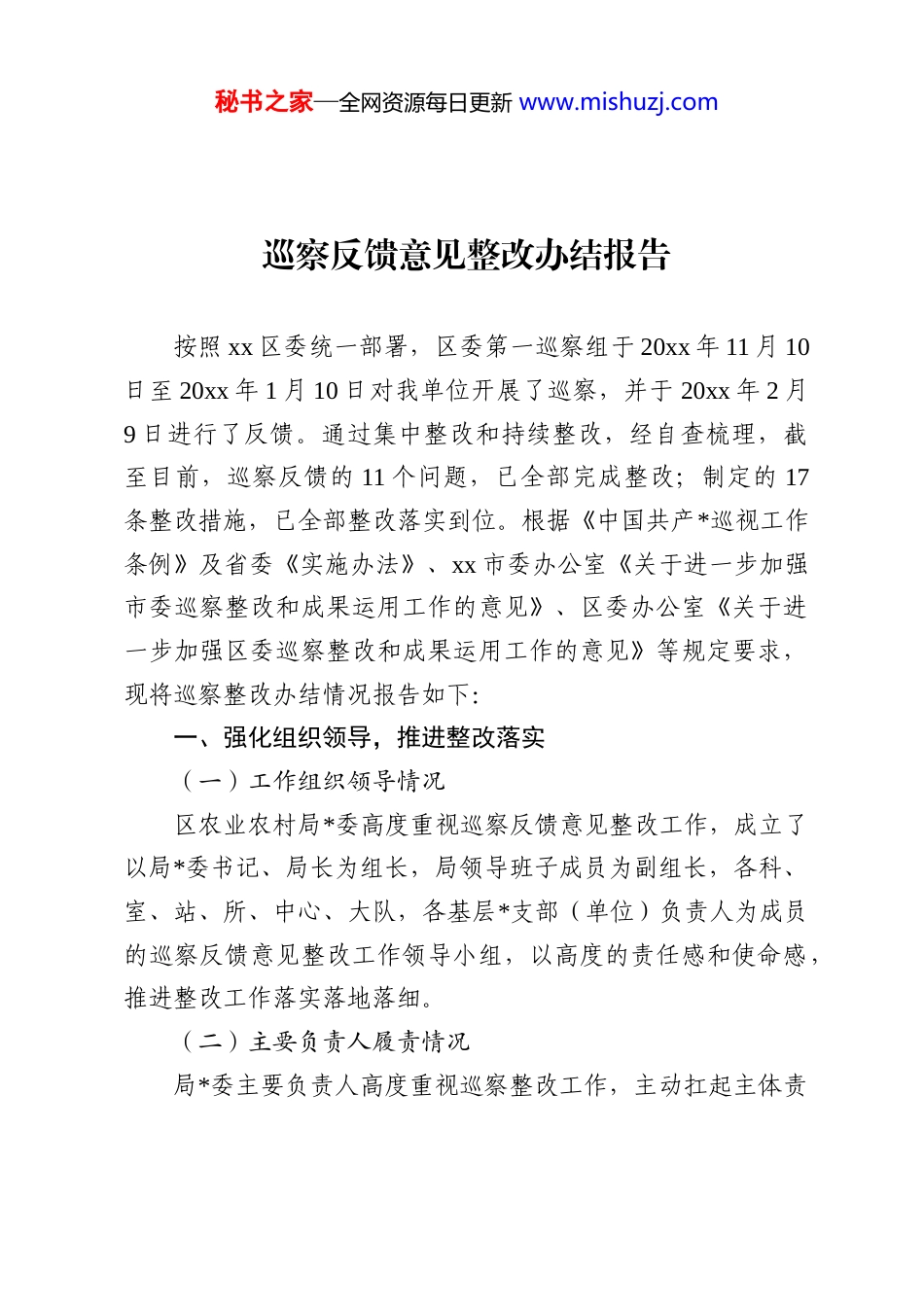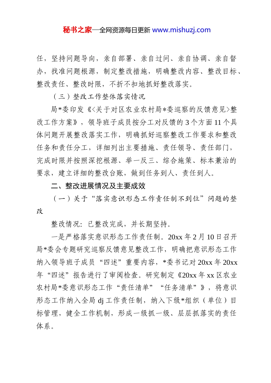 秘书之家—全网资源每日更新 www.mishuzj.com巡察反馈意见整改办结报告按照 xx 区委统一部署,区委第一巡察组于 20xx 年 11 月 10日至 20xx 年 1 月 10 日对我单位开展了巡察,并于 20xx 年 2 月9 日进行了反馈。通过集中整改和持续整改,经自查梳理,截至目前,巡察反馈的 11 个问题,已全部完成整改;制定的 17条整改措施,已全部整改落实到位。根据《中国共产*巡视工作条例》及省委《实施办法》、xx 市委办公室《关于进一步加强市委巡察整改和成果运用工作的意见》、区委办公室《关于进一步加强区委巡察整改和成果运用工作的意见》等规定要求,现将巡察整改办结情况报告如下:一、强化组织领导,推进整改落实(一)工作组织领导情况区农业农村局*委高度重视巡察反馈意见整改工作,成立了以局*委书记、局长为组长,局领导班子成员为副组长,各科、室、站、所、中心、大队,各基层*支部(单位)负责人为成员的巡察反馈意见整改工作领导小组,以高度的责任感和使命感,推进整改工作落实落地落细。(二)主要负责人履责情况局*委主要负责人高度重视巡察整改工作,主动扛起主体责秘书之家—全网资源每日更新 www.mishuzj.com任,坚持问题导向,亲自部署、亲自过问、亲自协调、亲自督办,找准问题根源,制定整改措施,明确整改内容、整改目标、整改责任、整改时限,不折不扣地抓好整改落实。(三)整改工作整体落实情况局*委印发《<关于对区农业农村局*委巡察的反馈意见>整改工作方案》,领导班子成员按分工对反馈的 3 个方面 11 个具体问题开展整改落实工作,明确抓好巡察整改工作要求和整改任务和责任分工,详细列出主要措施、责任领导、责任部门,完成时限并按照深挖根源、举一反三、综合施策、标本兼治的要求,建立详细的整改台账,做到任务到人、责任到人。二、整改进展情况及主要成效(一)关于“落实意识形态工作责任制不到位”问题的整改整改情况:已整改完成,并长期坚持。一是严格落实意识形态工作责任制。20xx 年 2 月 10 日召开局*委会专题研究巡察反馈意见整改工作,明确把意识形态工作纳入领导班子成员“四述”重要内容,*委书记对 20xx 年 20xx年“四述”报告进行了审阅检查。研究制定《20xx 年 xx 区农业农村局*委意识形态工作“责任清单”“任务清单”》,将意识形态工作纳入全局 dj 工作责任制,纳入下级*组织(单位)目标管理,健全工作机制,形成一级抓一级、层层抓落实的责任体系。秘书之家—全网资源每日更新 www.mishuzj.com二是坚持抓好*委中心组学习、*支部*员学习,*委实施会前第一课,学习***《论“三农”工作》。20xx 年 3 月 xx 日组织召开局*委理论学习中心组学习会,局领导班子成员集体学习******在参加十四届全国人大一次会议江苏代表团审议时、在会议闭幕时重要讲话精神和中央一号文件,全年共组织中心组学习 12 次;机关*支部举行学习宣传贯彻*的二十大精神专题微*课,结合 zt 教育,全年共组织*员学习 54 次。*支部书记以《安全责任扛肩上*员旗帜在飘扬》为题,为支部*员讲授专题*课。强化学习强国平台学习运用,在局 dj 微信群通报各*支部*员学习参与度及 20xx 年学习标兵前十名,将沉默学员名单反馈给各*支部书记点对点加强督促;3 月 xx 日在 xx 市蔬菜研究所开展学习*的二十大精神知识竞赛。3 月 28 日下发政治理论知识应知应会学习资料。3 月 29 日全局在职人员进行了意识形态“应知应会”知识测试。3 月 30 日局*委会学习***《论“三农”工作》相关篇幅。3 月 31 日下发了《关于持续深化*的二十大精神学习的通知》。充分运用“学习强国”学习平台、共产*员网等学习资源组织学习,举办“*的二十大精神知识竞赛”“意识形态应知应会测试”;扎实开展 zt 教育,牢牢把握“学思想、强*性、重实践、建新功”的总要求,组织学习*章、二十大报告等,通过重走“***视察路”、观看《榜样 8》等活动,营造比学赶超良好氛围。参加 xx 区举办“贯彻二十大奋进新征程”主题宣讲获二等奖。秘书之家—全网资源每日更新 www.mishuzj.com(二)关于“履行职责不力”问题的...