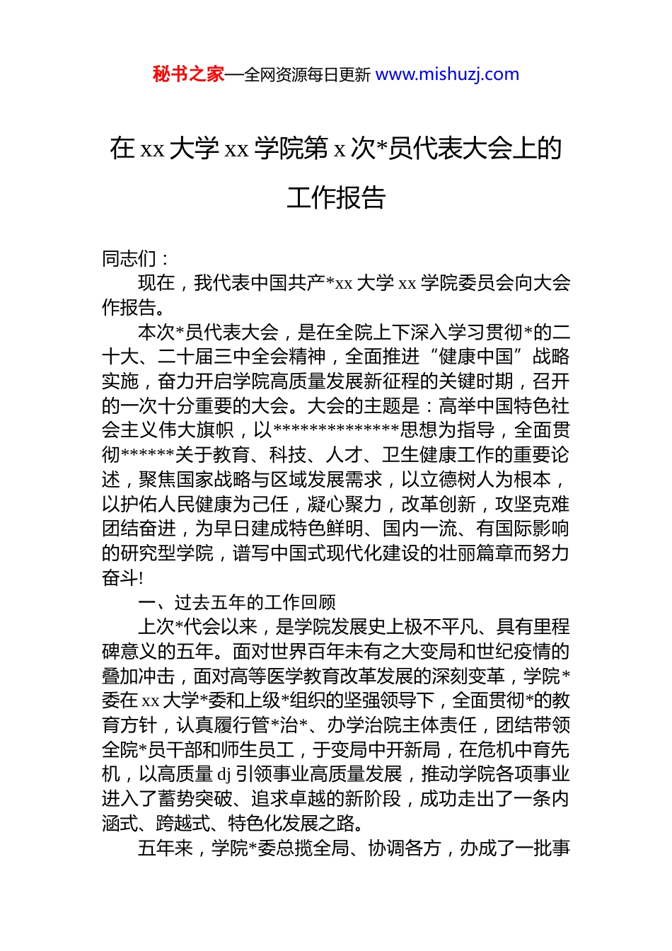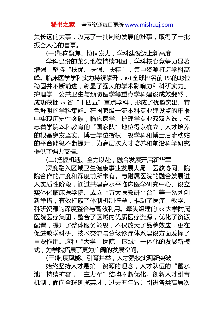 秘书之家—全网资源每日更新 www.mishuzj.com在 xx 大学 xx 学院第 x 次*员代表大会上的工作报告同志们:现在,我代表中国共产*xx 大学 xx 学院委员会向大会作报告。本次*员代表大会,是在全院上下深入学习贯彻*的二十大、二十届三中全会精神,全面推进“健康中国”战略实施,奋力开启学院高质量发展新征程的关键时期,召开的一次十分重要的大会。大会的主题是:高举中国特色社会主义伟大旗帜,以**************思想为指导,全面贯彻******关于教育、科技、人才、卫生健康工作的重要论述,聚焦国家战略与区域发展需求,以立德树人为根本,以护佑人民健康为己任,凝心聚力,改革创新,攻坚克难团结奋进,为早日建成特色鲜明、国内一流、有国际影响的研究型学院,谱写中国式现代化建设的壮丽篇章而努力奋斗!一、过去五年的工作回顾上次*代会以来,是学院发展史上极不平凡、具有里程碑意义的五年。面对世界百年未有之大变局和世纪疫情的叠加冲击,面对高等医学教育改革发展的深刻变革,学院*委在 xx 大学*委和上级*组织的坚强领导下,全面贯彻*的教育方针,认真履行管*治*、办学治院主体责任,团结带领全院*员干部和师生员工,于变局中开新局,在危机中育先机,以高质量 dj 引领事业高质量发展,推动学院各项事业进入了蓄势突破、追求卓越的新阶段,成功走出了一条内涵式、跨越式、特色化发展之路。五年来,学院*委总揽全局、协调各方,办成了一批事秘书之家—全网资源每日更新 www.mishuzj.com关长远的大事,攻克了一批制约发展的难事,取得了一批振奋人心的喜事。(一)靶向聚焦、协同发力,学科建设迈上新高度学科建设的龙头地位持续巩固,学科核心竞争力显著增强。坚持“扶优、扶强、扶特”,集中资源打造学科高峰。临床医学学科实力持续攀升,esi 全球排名前 1%的地位稳固并不断前进,彰显了强大的学术影响力和科研实力。护理学、公共卫生与预防医学等重点学科建设成效斐然,成功获批 xx 省“十四五”重点学科,形成了优势突出、特色鲜明的学科集群。在国家级一流本科专业建设点的申报中实现历史性突破,临床医学、护理学专业双双入选,标志着学院本科教育的“国家队”地位得以确立,人才培养的根基愈发坚实。博士学位授权一级学科和博士后流动站的平台能级不断提升,为高层次人才培养和前沿科学研究提供了强力支撑。(二)把握机遇、全力以赴,融合发展开启新华章深度融入区域卫生健康事业发展大局,医教协同、院院合作的广度和深度前所未有。与附属医院的融合发展进入实质性阶段,通过共建高水平临床医学研究中心、设立实体化临床医学院、成立“五大医教研平台”等一系列创新举措,有效打破了体制机制壁垒,推动了医疗、教学、科研资源的深度整合与高效利用。牵头组建的 xx 大学附属医院医疗集团,整合了区域内优质医疗资源,优化了资源配置,提升了整体服务能级,不仅放大了品牌效应,更在促进教学科研、技术交流与分级诊疗体系建设方面发挥了重要作用。这种“大学—医院—区域”一体化的发展新模式,为学院拓展了更为广阔的发展空间。(三)制度赋能、引育并举,人才强校实现新突破始终坚持人才是第一资源的理念,人才队伍的“蓄水池”持续扩容,“主力军”结构不断优化。创新人才引育机制,面向全球延揽英才,过去五年累计引进各类高层次秘书之家—全网资源每日更新 www.mishuzj.com人才数十名,其中不乏在国内外学界具有重要影响力的领军人物。师资队伍的博士化率和国际化水平显著提升,一支结构合理、素质优良、充满活力的教师队伍已经形成。通过实施青年教师成长助力计划、设立教学发展专项基金等措施,大力支持青年人才挑大梁、当主角,一批优秀的青年学者在国家级科研项目和高水平教学竞赛中崭露头角人才梯队建设更趋完善。(四)培根铸魂、启智润心,人才培养展现新作为全面落实立德树人根本任务,人才培养质量持续提升,交出了一份亮眼的育人答卷。毕业生培养质量获得社会和用人单位的高度认可,护理学、公共卫生等专业毕业生就业率连续多年保持在 99%以上,部分专业达到 100%。学生参加国家执业资格考试成绩斐然,临床执业医师资格考试通过率持续高...