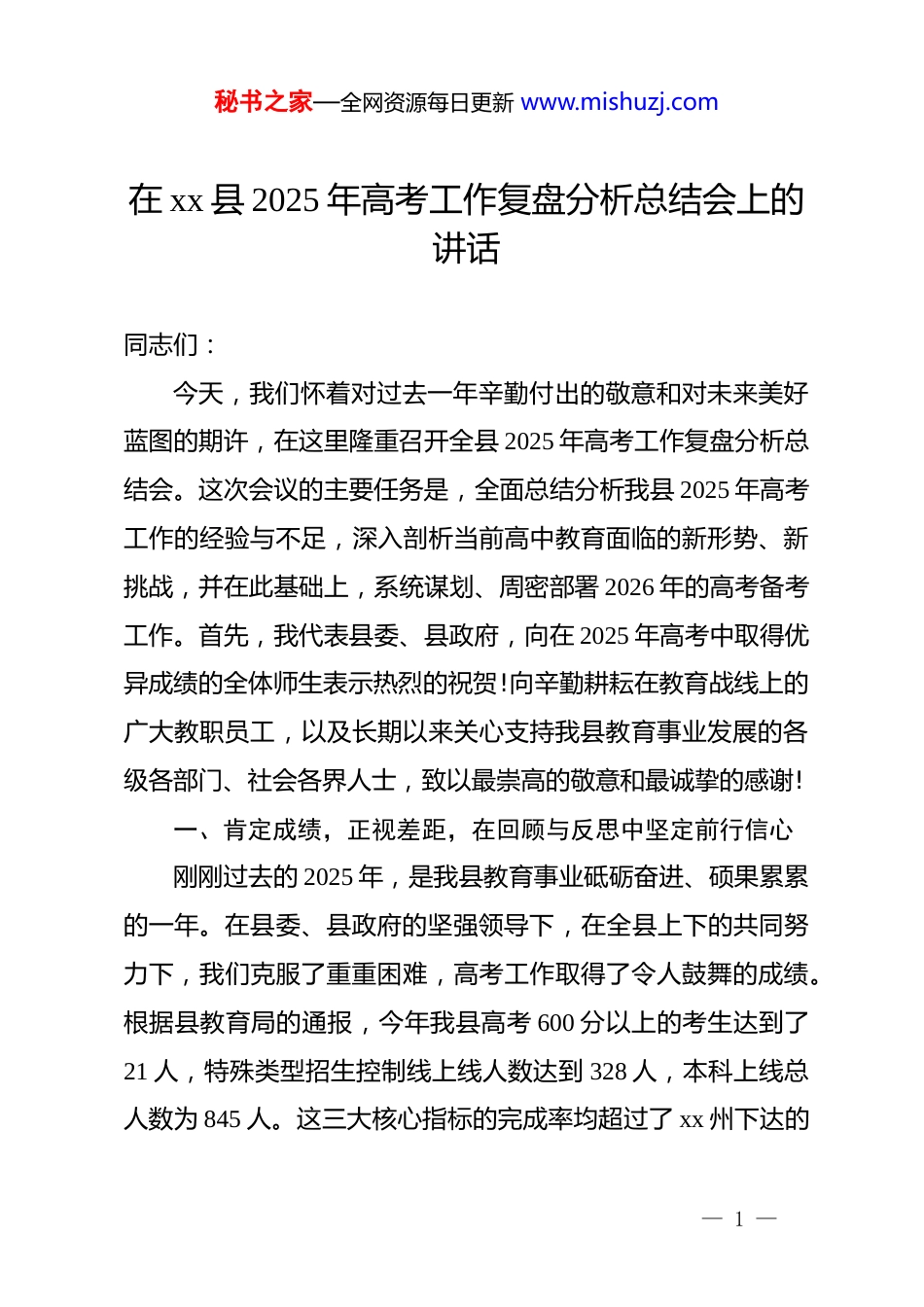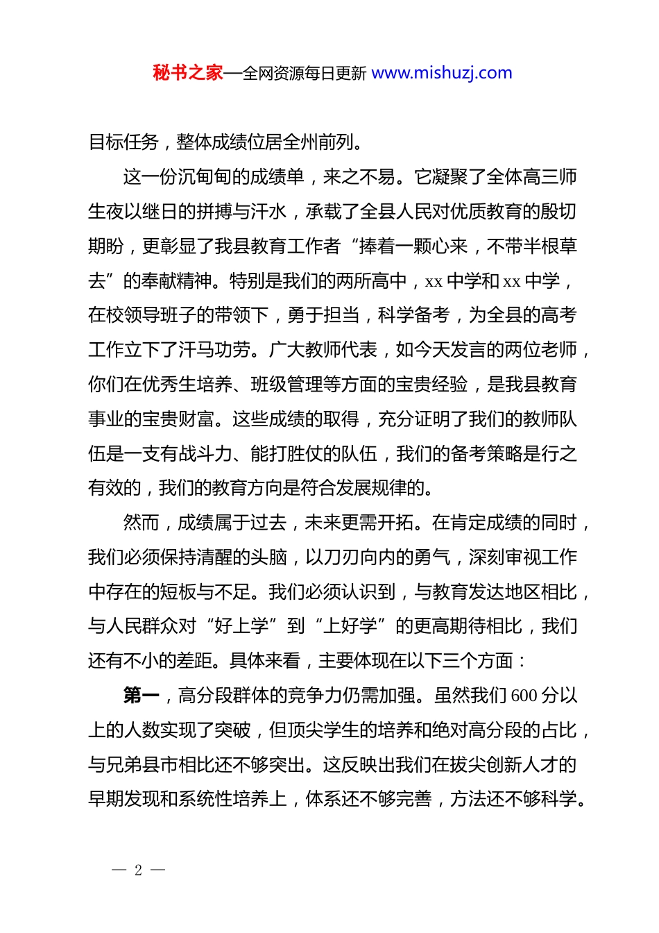 秘书之家—全网资源每日更新 www.mishuzj.com在 xx 县 2025 年高考工作复盘分析总结会上的讲话同志们:今天,我们怀着对过去一年辛勤付出的敬意和对未来美好蓝图的期许,在这里隆重召开全县 2025 年高考工作复盘分析总结会。这次会议的主要任务是,全面总结分析我县 2025 年高考工作的经验与不足,深入剖析当前高中教育面临的新形势、新挑战,并在此基础上,系统谋划、周密部署 2026 年的高考备考工作。首先,我代表县委、县政府,向在 2025 年高考中取得优异成绩的全体师生表示热烈的祝贺!向辛勤耕耘在教育战线上的广大教职员工,以及长期以来关心支持我县教育事业发展的各级各部门、社会各界人士,致以最崇高的敬意和最诚挚的感谢!一、肯定成绩,正视差距,在回顾与反思中坚定前行信心刚刚过去的 2025 年,是我县教育事业砥砺奋进、硕果累累的一年。在县委、县政府的坚强领导下,在全县上下的共同努力下,我们克服了重重困难,高考工作取得了令人鼓舞的成绩。根据县教育局的通报,今年我县高考 600 分以上的考生达到了21 人,特殊类型招生控制线上线人数达到 328 人,本科上线总人数为 845 人。这三大核心指标的完成率均超过了 xx 州下达的— 1 —秘书之家—全网资源每日更新 www.mishuzj.com目标任务,整体成绩位居全州前列。这一份沉甸甸的成绩单,来之不易。它凝聚了全体高三师生夜以继日的拼搏与汗水,承载了全县人民对优质教育的殷切期盼,更彰显了我县教育工作者“捧着一颗心来,不带半根草去”的奉献精神。特别是我们的两所高中,xx 中学和 xx 中学,在校领导班子的带领下,勇于担当,科学备考,为全县的高考工作立下了汗马功劳。广大教师代表,如今天发言的两位老师,你们在优秀生培养、班级管理等方面的宝贵经验,是我县教育事业的宝贵财富。这些成绩的取得,充分证明了我们的教师队伍是一支有战斗力、能打胜仗的队伍,我们的备考策略是行之有效的,我们的教育方向是符合发展规律的。然而,成绩属于过去,未来更需开拓。在肯定成绩的同时,我们必须保持清醒的头脑,以刀刃向内的勇气,深刻审视工作中存在的短板与不足。我们必须认识到,与教育发达地区相比,与人民群众对“好上学”到“上好学”的更高期待相比,我们还有不小的差距。具体来看,主要体现在以下三个方面:第一,高分段群体的竞争力仍需加强。虽然我们 600 分以上的人数实现了突破,但顶尖学生的培养和绝对高分段的占比,与兄弟县市相比还不够突出。这反映出我们在拔尖创新人才的早期发现和系统性培养上,体系还不够完善,方法还不够科学。— 2 —秘书之家—全网资源每日更新 www.mishuzj.com如何让更多的 xx 学子能够叩开国内顶尖学府的大门,是我们必须深入思考和破解的课题。第二,学科发展不均衡的问题依然存在。从总体数据分析来看,部分学科的平均分、高分率与优势学科相比存在明显差距,成为了制约学生总分提升的“短板”。这种不均衡不仅体现在学校与学校之间,也体现在同一学校的不同学科组之间。这说明我们的教研力量未能实现均衡覆盖,对薄弱学科的诊断和帮扶力度尚显不足。第三,备考策略的精细化水平有待提升。在备考过程中,我们的一些做法还停留在传统的经验层面,对新高考改革趋势、课程标准、评价体系的研究还不够深入,运用大数据等现代化手段进行学情分析、精准施教的能力还有待加强。如何从“题海战术”向“精准滴灌”转变,从“经验驱动”向“数据驱动”转变,是我们优化备考策略的核心方向。这些问题,是挑战,更是我们下一步工作的突破口和着力点。我们必须正视它们,研究它们,解决它们,才能在未来的竞争中赢得主动,再创佳绩。二、聚焦关键,精准发力,以系统性思维谋划 2026 年备考新篇章同志们,2026 年的高考备考工作已经拉开序幕。面对新形— 3 —秘书之家—全网资源每日更新 www.mishuzj.com势、新任务,我们必须树立全局观念和长远眼光,以更加科学的理念、更加务实的举措,全面提升我县高中教育的质量和水平。下面,我讲四点意见。(一)深化教学改革,构建科学高效的备考体系高考备考是一项系统工程,绝非高三一年的冲刺,...