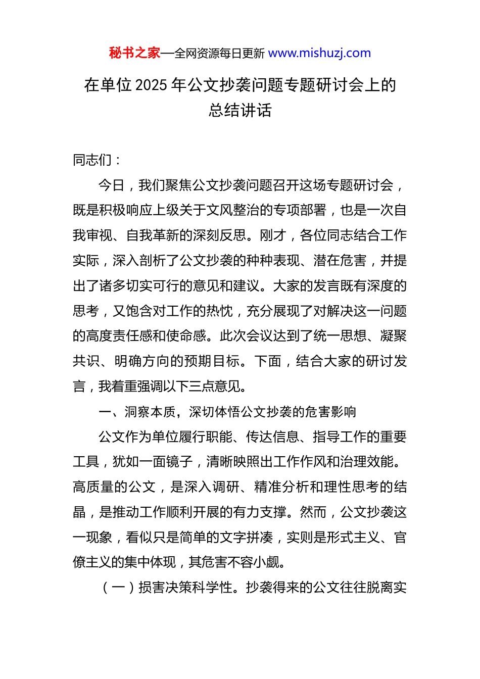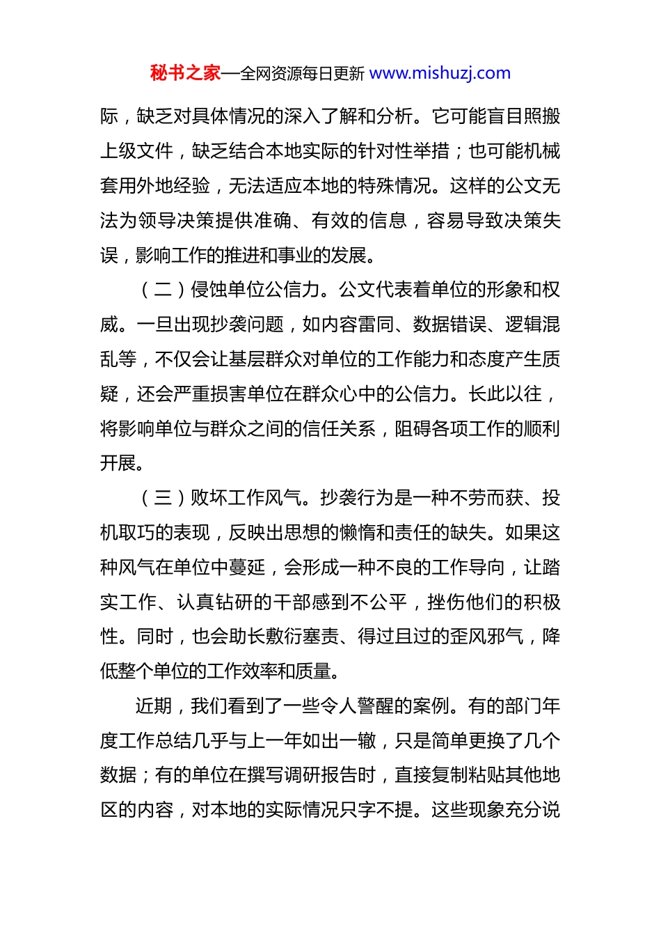 秘书之家—全网资源每日更新 www.mishuzj.com在单位 2025 年公文抄袭问题专题研讨会上的总结讲话 同志们:今日,我们聚焦公文抄袭问题召开这场专题研讨会,既是积极响应上级关于文风整治的专项部署,也是一次自我审视、自我革新的深刻反思。刚才,各位同志结合工作实际,深入剖析了公文抄袭的种种表现、潜在危害,并提出了诸多切实可行的意见和建议。大家的发言既有深度的思考,又饱含对工作的热忱,充分展现了对解决这一问题的高度责任感和使命感。此次会议达到了统一思想、凝聚共识、明确方向的预期目标。下面,结合大家的研讨发言,我着重强调以下三点意见。一、洞察本质,深切体悟公文抄袭的危害影响公文作为单位履行职能、传达信息、指导工作的重要工具,犹如一面镜子,清晰映照出工作作风和治理效能。高质量的公文,是深入调研、精准分析和理性思考的结晶,是推动工作顺利开展的有力支撑。然而,公文抄袭这一现象,看似只是简单的文字拼凑,实则是形式主义、官僚主义的集中体现,其危害不容小觑。(一)损害决策科学性。抄袭得来的公文往往脱离实秘书之家—全网资源每日更新 www.mishuzj.com际,缺乏对具体情况的深入了解和分析。它可能盲目照搬上级文件,缺乏结合本地实际的针对性举措;也可能机械套用外地经验,无法适应本地的特殊情况。这样的公文无法为领导决策提供准确、有效的信息,容易导致决策失误,影响工作的推进和事业的发展。(二)侵蚀单位公信力。公文代表着单位的形象和权威。一旦出现抄袭问题,如内容雷同、数据错误、逻辑混乱等,不仅会让基层群众对单位的工作能力和态度产生质疑,还会严重损害单位在群众心中的公信力。长此以往,将影响单位与群众之间的信任关系,阻碍各项工作的顺利开展。(三)败坏工作风气。抄袭行为是一种不劳而获、投机取巧的表现,反映出思想的懒惰和责任的缺失。如果这种风气在单位中蔓延,会形成一种不良的工作导向,让踏实工作、认真钻研的干部感到不公平,挫伤他们的积极性。同时,也会助长敷衍塞责、得过且过的歪风邪气,降低整个单位的工作效率和质量。近期,我们看到了一些令人警醒的案例。有的部门年度工作总结几乎与上一年如出一辙,只是简单更换了几个数据;有的单位在撰写调研报告时,直接复制粘贴其他地区的内容,对本地的实际情况只字不提。这些现象充分说秘书之家—全网资源每日更新 www.mishuzj.com明,公文抄袭绝非小事,而是必须坚决整治的顽疾。二、深挖根源,精准剖析问题产生的内在症结公文抄袭现象屡禁不止,背后有着复杂的原因,涉及思想认识、制度机制、能力素质等多个方面。我们必须深入分析,找准问题的根源,才能对症下药,从根本上解决问题。(一)思想认识有偏差,责任意识淡薄。部分干部对公文写作的重要性认识不足,没有将其视为一项严肃的政治任务,而是仅仅当作一项普通的事务性工作来对待。他们缺乏对公文质量的追求,没有树立“文责自负”的意识,认为只要完成任务就行,不注重公文的实际效果。一些干部存在侥幸心理,认为抄袭不会被发现,或者即使被发现也不会受到严重的处罚。这种思想上的偏差,导致他们在公文写作中敷衍了事,不愿付出努力进行深入的调研和思考。(二)制度机制不完善,监督管理缺失。单位内部的制度机制不够健全,对公文写作的规范和要求不够明确,缺乏具体的操作流程和质量标准。在公文审核环节,存在审核不严格、把关不细致的问题,对抄袭行为缺乏有效的识别和防范机制。同时,对抄袭行为的处罚力度不够,没有形成足够的威慑力,使得一些干部敢于冒险抄袭。此秘书之家—全网资源每日更新 www.mishuzj.com外,单位内部缺乏有效的激励机制,对高质量公文的奖励不够,不能充分调动干部的写作积极性。(三)能力素质不足,写作水平有限。一些干部的文字功底薄弱,缺乏必要的写作技巧和方法,在面对公文写作任务时,感到力不从心。他们不善于收集和整理资料,不懂得如何运用恰当的语言表达观点,只能通过抄袭来完成任务。同时,随着时代的发展和工作要求的不断提高,公文的内容和形式也在不断变化。一些干部没有及时学习和掌握新的知识和技能,无法适应新形势下公文写作...