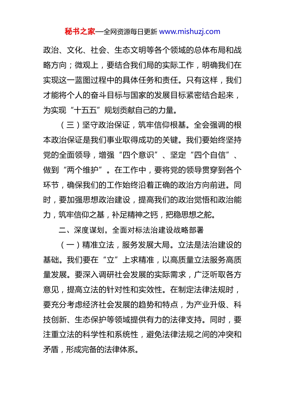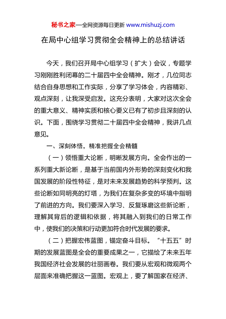 秘书之家—全网资源每日更新 www.mishuzj.com在局中心组学习贯彻全会精神上的总结讲话 今天,我们召开局中心组学习(扩大)会议,专题学习刚刚胜利闭幕的二十届四中全会精神。刚才,几位同志结合自身思想和工作实际,分享了学习体会,内容精彩、观点深刻,让我深受启发。这充分表明,大家对这次全会的重大意义、精神实质和核心要义已有了初步且深刻的认识。下面,围绕学习贯彻二十届四中全会精神,我讲几点意见。一、深刻体悟,精准把握全会精髓(一)领悟重大论断,明晰发展方向。全会作出的一系列重大新论断,是基于当前国内外形势的深刻变化和我国发展的阶段性特征,是对未来发展趋势的科学预判。这些论断如同明亮的灯塔,为我们在复杂多变的环境中指明了前进的方向。我们要深入学习、反复琢磨这些新论断,理解其背后的逻辑和依据,将其融入到我们的日常工作中,使我们的决策和行动更加符合时代发展的要求。(二)把握宏伟蓝图,锚定奋斗目标。“十五五”时期的发展蓝图是全会的重要成果之一,它描绘了未来五年我国经济社会发展的壮丽画卷。我们要从宏观和微观两个层面来准确把握这一蓝图。宏观上,要了解国家在经济、秘书之家—全网资源每日更新 www.mishuzj.com政治、文化、社会、生态文明等各个领域的总体布局和战略方向;微观上,要结合我们局的实际工作,明确我们在实现这一蓝图过程中的具体任务和责任。只有这样,我们才能将个人的奋斗目标与国家的发展目标紧密结合起来,为实现“十五五”规划贡献自己的力量。(三)坚守政治保证,筑牢信仰根基。全会强调的根本政治保证是我们事业取得成功的关键。我们要始终坚持党的全面领导,增强“四个意识”、坚定“四个自信”、做到“两个维护”。在工作中,要将党的领导贯穿到各个环节,确保我们的工作始终沿着正确的政治方向前进。同时,要加强思想政治建设,提高我们的政治觉悟和政治能力,筑牢信仰之基,补足精神之钙,把稳思想之舵。二、深度谋划,全面对标法治建设战略部署(一)精准立法,服务发展大局。立法是法治建设的基础。我们要在“立”上求精准,以高质量立法服务高质量发展。要深入调研社会发展的实际需求,广泛听取各方意见,提高立法的针对性和实效性。在制定法律法规时,要充分考虑经济社会发展的趋势和特点,为产业升级、科技创新、生态保护等领域提供有力的法律支持。同时,要注重立法的科学性和系统性,避免法律法规之间的冲突和矛盾,形成完备的法律体系。秘书之家—全网资源每日更新 www.mishuzj.com(二)规范执法,保障开放格局。执法是法治建设的关键环节。我们要在“执”上求规范,以高水平执法保障高水平开放。要加强执法队伍建设,提高执法人员的业务素质和法治意识,确保执法行为合法、公正、文明。要建立健全执法监督机制,加强对执法过程的全程监督,防止执法权力滥用。在对外开放的背景下,要积极适应国际规则和标准,提高执法的国际化水平,为营造良好的营商环境提供有力保障。(三)高效司法,维护社会稳定。司法是法治建设的最后一道防线。我们要在“司”上求实效,以高标准执行维护社会大局稳定。要深化司法体制改革,提高司法效率和公正性,确保每一个司法案件都能得到公平、公正的处理。要加强司法队伍建设,提高司法人员的专业素养和职业道德水平,增强司法公信力。要积极参与社会治理,通过司法裁判引导社会风尚,化解社会矛盾,维护社会和谐稳定。(四)优质守法,满足人民需求。守法是法治建设的基础要求。我们要在“守”上求突破,以高品质服务满足人民群众对法治的需求。要加强法治宣传教育,提高全民法治意识,形成全社会尊法、学法、守法、用法的良好氛围。要创新法律服务方式,拓展法律服务领域,为人民群秘书之家—全网资源每日更新 www.mishuzj.com众提供更加便捷、高效、优质的法律服务。要积极回应人民群众的法治关切,解决人民群众在生活中遇到的法律问题,让人民群众感受到法治的温暖和力量。(五)拓展涉外,护航对外开放。在经济全球化的背景下,涉外法治建设越来越重要。我们要在“涉外”上求拓展,以高能级法治护航高水平对外开放。要加强涉外法律法规的研究和制定...