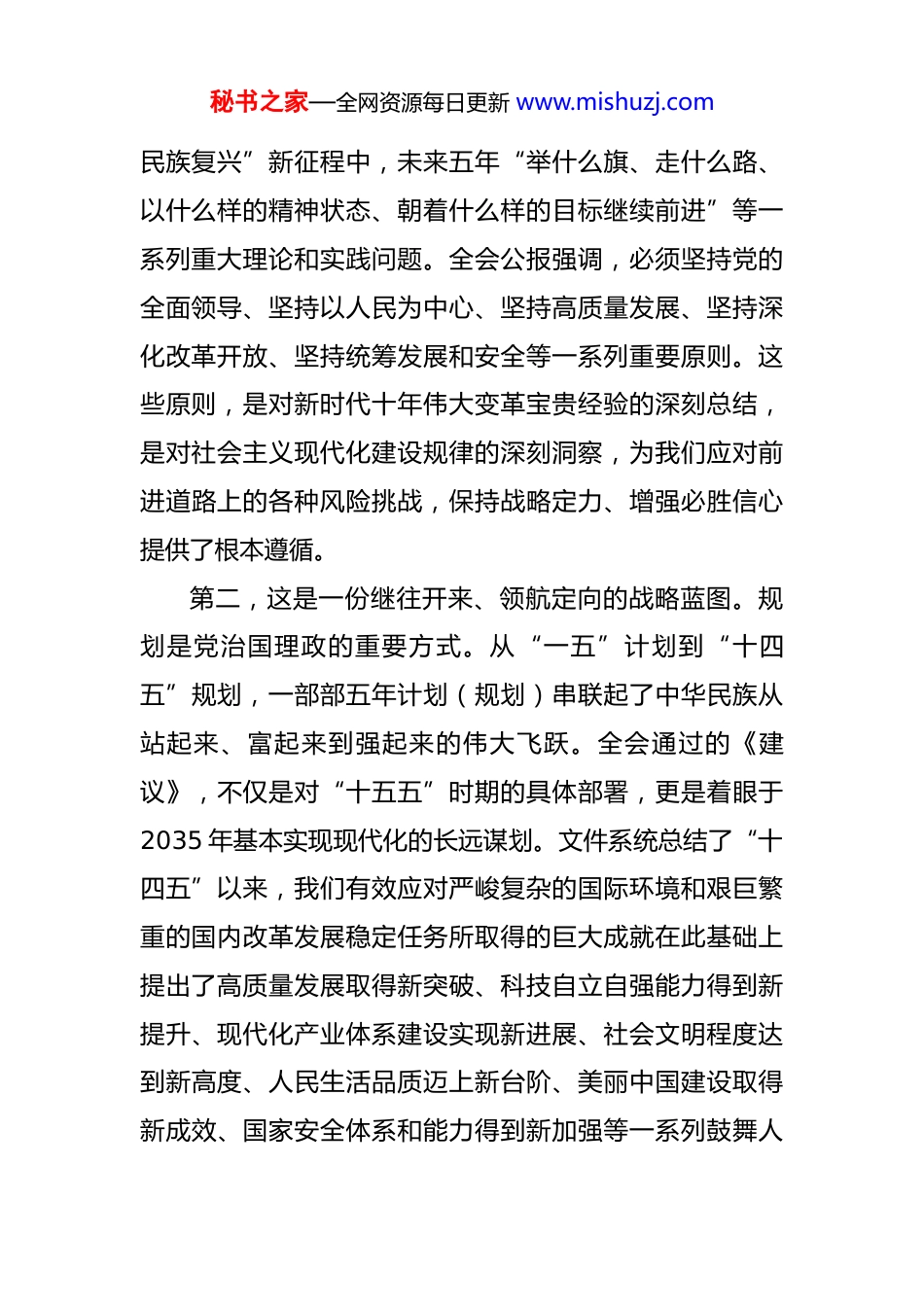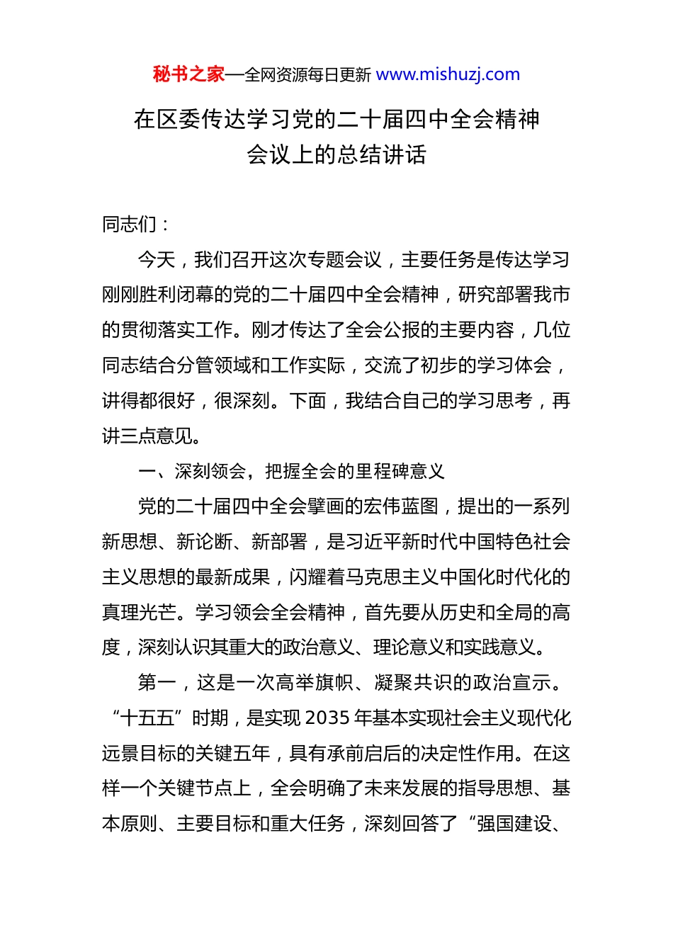 秘书之家—全网资源每日更新 www.mishuzj.com在区委传达学习党的二十届四中全会精神会议上的总结讲话 同志们:今天,我们召开这次专题会议,主要任务是传达学习刚刚胜利闭幕的党的二十届四中全会精神,研究部署我市的贯彻落实工作。刚才传达了全会公报的主要内容,几位同志结合分管领域和工作实际,交流了初步的学习体会,讲得都很好,很深刻。下面,我结合自己的学习思考,再讲三点意见。一、深刻领会,把握全会的里程碑意义党的二十届四中全会擘画的宏伟蓝图,提出的一系列新思想、新论断、新部署,是习近平新时代中国特色社会主义思想的最新成果,闪耀着马克思主义中国化时代化的真理光芒。学习领会全会精神,首先要从历史和全局的高度,深刻认识其重大的政治意义、理论意义和实践意义。第一,这是一次高举旗帜、凝聚共识的政治宣示。“十五五”时期,是实现 2035 年基本实现社会主义现代化远景目标的关键五年,具有承前启后的决定性作用。在这样一个关键节点上,全会明确了未来发展的指导思想、基本原则、主要目标和重大任务,深刻回答了“强国建设、秘书之家—全网资源每日更新 www.mishuzj.com民族复兴”新征程中,未来五年“举什么旗、走什么路、以什么样的精神状态、朝着什么样的目标继续前进”等一系列重大理论和实践问题。全会公报强调,必须坚持党的全面领导、坚持以人民为中心、坚持高质量发展、坚持深化改革开放、坚持统筹发展和安全等一系列重要原则。这些原则,是对新时代十年伟大变革宝贵经验的深刻总结,是对社会主义现代化建设规律的深刻洞察,为我们应对前进道路上的各种风险挑战,保持战略定力、增强必胜信心提供了根本遵循。第二,这是一份继往开来、领航定向的战略蓝图。规划是党治国理政的重要方式。从“一五”计划到“十四五”规划,一部部五年计划(规划)串联起了中华民族从站起来、富起来到强起来的伟大飞跃。全会通过的《建议》,不仅是对“十五五”时期的具体部署,更是着眼于2035 年基本实现现代化的长远谋划。文件系统总结了“十四五”以来,我们有效应对严峻复杂的国际环境和艰巨繁重的国内改革发展稳定任务所取得的巨大成就在此基础上提出了高质量发展取得新突破、科技自立自强能力得到新提升、现代化产业体系建设实现新进展、社会文明程度达到新高度、人民生活品质迈上新台阶、美丽中国建设取得新成效、国家安全体系和能力得到新加强等一系列鼓舞人秘书之家—全网资源每日更新 www.mishuzj.com心的目标。这份蓝图,体现了长远战略与中期目标的统一、顶层设计与实践探索的统一、发展任务与人民期盼的统一,是指引我们奋力谱写中国式现代化新篇章的纲领性文件。第三,这是一套守正创新、开拓进取的行动指南。当前和今后一个时期,我国发展仍然处于重要战略机遇期,但面临的内外环境正在发生深刻复杂变化,不确定难预料因素增多。全会公报中提出了一系列新概念、新观点、新论断特别是将“加快发展新质生产力”摆在了突出位置强调要以科技创新推动产业创新,这抓住了新一轮科技革命和产业变革的脉搏,是我们塑造发展新优势、赢得未来主动权的关键一招。同时,全会围绕构建高水平社会主义市场经济体制、全面推进乡村振兴、促进区域协调发展、推动绿色转型、维护国家安全和社会稳定等方面,作出了一系列重大部署。这些部署既坚持了行之有效的好经验好做法,又根据新形势新任务提出了新思路新举措,充分体现了党中央审时度势、守正创新的政治智慧和驾驭复杂局面的高超能力。二、精准把握,领会全会的核心要义学习贯彻全会精神,关键在于深入理解和准确把握贯穿其中的核心要义和战略部署。全市上下要聚焦公报提出秘书之家—全网资源每日更新 www.mishuzj.com的“十二项重大部署”,结合 XX 市的实际,逐条学习、逐项研究,真正做到学深悟透、融会贯通。一要牢牢把握“高质量发展”这个首要任务。全会强调,高质量发展是全面建设社会主义现代化国家的首要任务。进入新发展阶段,发展的“量”固然重要,但发展的“质”更加关键。我们必须完整、准确、全面贯彻新发展理念,不再简单以 GDP 增速论英雄,而是要更加注重发展的质量和效益。对于 X...