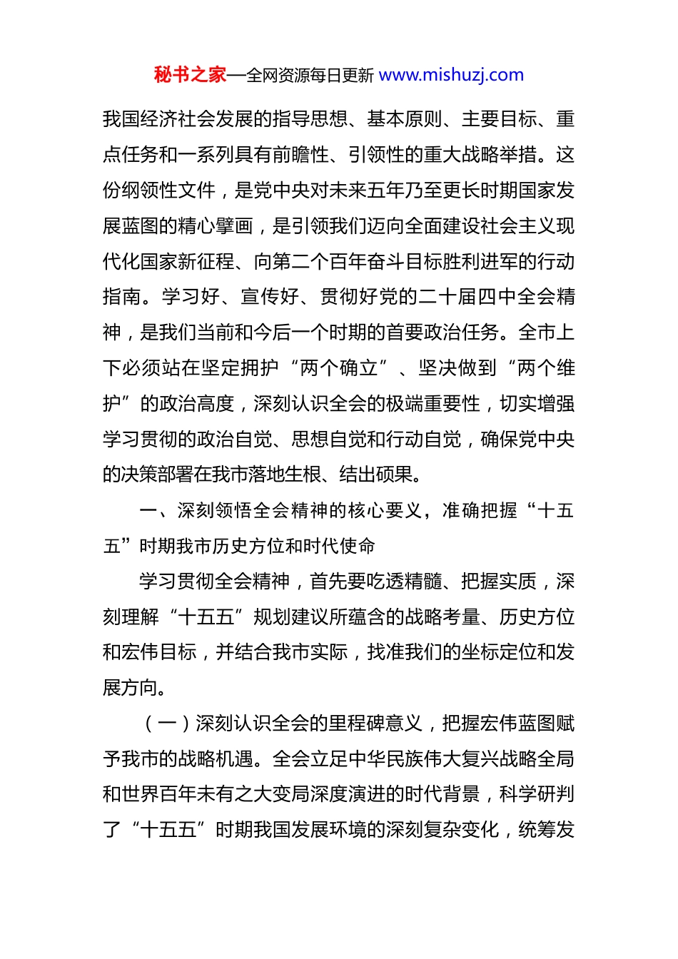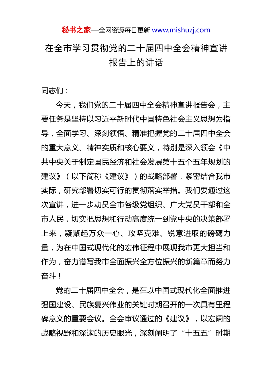 秘书之家—全网资源每日更新 www.mishuzj.com在全市学习贯彻党的二十届四中全会精神宣讲报告上的讲话 同志们:今天,我们党的二十届四中全会精神宣讲报告会,主要任务是坚持以习近平新时代中国特色社会主义思想为指导,全面学习、深刻领悟、精准把握党的二十届四中全会的重大意义、精神实质和核心要义,特别是深入领会《中共中央关于制定国民经济和社会发展第十五个五年规划的建议》(以下简称《建议》)的战略部署,紧密结合我市实际,研究部署切实可行的贯彻落实举措。我们要通过这次宣讲,进一步动员全市各级党组织、广大党员干部和全市人民,切实把思想和行动高度统一到党中央的决策部署上来,凝聚起万众一心、攻坚克难、锐意进取的磅礴力量,为在中国式现代化的宏伟征程中展现我市更大担当和作为,奋力谱写我市全面振兴全方位振兴的新篇章而努力奋斗!党的二十届四中全会,是在以中国式现代化全面推进强国建设、民族复兴伟业的关键时期召开的一次具有里程碑意义的重要会议。全会审议通过的《建议》,以宏阔的战略视野和深邃的历史眼光,深刻阐明了“十五五”时期秘书之家—全网资源每日更新 www.mishuzj.com我国经济社会发展的指导思想、基本原则、主要目标、重点任务和一系列具有前瞻性、引领性的重大战略举措。这份纲领性文件,是党中央对未来五年乃至更长时期国家发展蓝图的精心擘画,是引领我们迈向全面建设社会主义现代化国家新征程、向第二个百年奋斗目标胜利进军的行动指南。学习好、宣传好、贯彻好党的二十届四中全会精神,是我们当前和今后一个时期的首要政治任务。全市上下必须站在坚定拥护“两个确立”、坚决做到“两个维护”的政治高度,深刻认识全会的极端重要性,切实增强学习贯彻的政治自觉、思想自觉和行动自觉,确保党中央的决策部署在我市落地生根、结出硕果。一、深刻领悟全会精神的核心要义,准确把握“十五五”时期我市历史方位和时代使命学习贯彻全会精神,首先要吃透精髓、把握实质,深刻理解“十五五”规划建议所蕴含的战略考量、历史方位和宏伟目标,并结合我市实际,找准我们的坐标定位和发展方向。(一)深刻认识全会的里程碑意义,把握宏伟蓝图赋予我市的战略机遇。全会立足中华民族伟大复兴战略全局和世界百年未有之大变局深度演进的时代背景,科学研判了“十五五”时期我国发展环境的深刻复杂变化,统筹发秘书之家—全网资源每日更新 www.mishuzj.com展和安全两件大事,系统谋划了未来五年的发展路径。这份《建议》,是习近平新时代中国特色社会主义思想的生动实践和最新成果,通篇贯穿了坚持党的全面领导、坚持以人民为中心、坚持新发展理念、坚持深化改革开放、坚持系统观念的“五个坚持”重要原则,彰显了党中央高瞻远瞩的战略定力和驾驭复杂局面的卓越能力。对于我市而言,这份蓝图蕴含着前所未有的重大战略机遇。一是国家推动区域全面振兴的机遇前所未有。《建议》再次强调“推动区域全面振兴取得新突破”,并将“维护国家国防安全、粮食安全、生态安全、能源安全、产业安全”摆在突出位置。我市作为区域的中心城市、重要的老工业基地和国家装备制造业基地,在保障国家“五大安全”特别是产业安全、国防安全方面肩负特殊使命,这将为我市争取国家政策、项目、资金支持提供最强有力的背书和牵引。二是新一轮科技革命和产业变革机遇迎面而来。《建议》将“科技自立自强”提升到前所未有的高度,强调发展新质生产力。我市拥有中科院金属所、自动化所、计算所等顶尖科研院所,以及区域大学、大学等高水平大学,在高端数控机床、机器人及智能制造、航空航天、IC 装备、新材料、生物医药等领域具有深厚的研发积累和产业基础。“十五五”时期国家对关键核心技术攻关、战略性新兴产秘书之家—全网资源每日更新 www.mishuzj.com业培育、数字经济发展的强力布局,正是我市实现创新驱动、产业蝶变的核心窗口期。三是构建新发展格局带来的区位优势机遇日益凸显。我市是区域亚地理几何中心,是联接区域与关内、辐射区域亚的重要枢纽。《建议》强调畅通国内大循环、促进国内国际双循环。我市在建设国家现代综合交通枢纽、区域性金融中心、物流中心...