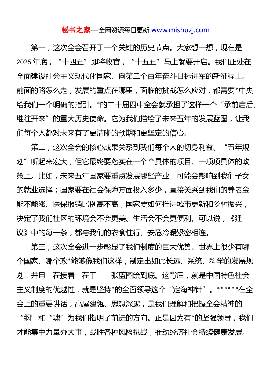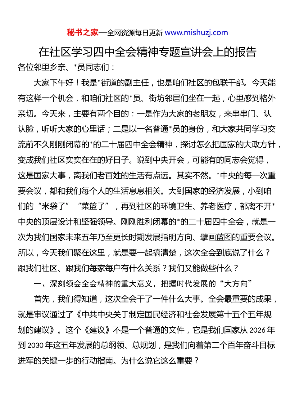 秘书之家—全网资源每日更新 www.mishuzj.com在社区学习四中全会精神专题宣讲会上的报告各位邻里乡亲、*员同志们:大家下午好!我是*街道的副主任,也是咱们社区的包联干部。今天能有这样一个机会,和咱们社区的*员、街坊邻居们坐在一起,心里感到格外亲切。今天来,主要有两个目的:一是作为大家的老朋友,来串串门、认认脸,听听大家的心里话;二是以一名普通*员的身份,和大家共同学习交流前不久刚刚闭幕的*的二十届四中全会精神,探讨怎么把国家的大政方针,变成我们社区实实在在的好日子。说到中央开会,可能有的同志会觉得,这是国家大事,离我们老百姓的生活有点远。其实不然。*中央的每一次重要会议,都和我们每个人的生活息息相关。大到国家的经济发展,小到咱们的“米袋子”“菜篮子”,再到社区的环境卫生、养老医疗,都离不开*中央的顶层设计和坚强领导。刚刚胜利闭幕的*的二十届四中全会,就是一次为我们国家未来五年乃至更长时期发展指明方向、擘画蓝图的重要会议。所以,今天我们聚在这里,就是要一起搞清楚,这次全会到底说了什么?跟我们社区、跟我们每家每户有什么关系?我们又能做些什么?一、深刻领会全会精神的重大意义,把握时代发展的“大方向”首先,我们得知道,这次全会干了一件什么大事。全会最重要的成果,就是审议通过了《中共中央关于制定国民经济和社会发展第十五个五年规划的建议》。这个《建议》不是一个普通的文件,它是我们国家从 2026 年到 2030 年这五年发展的总纲领、总规划,是我们向着第二个百年奋斗目标进军的关键一步的行动指南。为什么说它这么重要?秘书之家—全网资源每日更新 www.mishuzj.com第一,这次全会召开于一个关键的历史节点。大家想一想,现在是2025 年底,“十四五”即将收官,“十五五”马上就要开启。我们正处在全面建设社会主义现代化国家、向第二个百年奋斗目标进军的新征程上。前面的路怎么走,发展的重点在哪里,面临的挑战怎么应对,都需要*中央给我们一个明确的指引。*的二十届四中全会就承担了这样一个“承前启后、继往开来”的重大历史使命。它为我们描绘了未来五年的发展蓝图,让我们每个人都对未来有了更清晰的预期和更坚定的信心。第二,这次全会的核心成果关系到我们每个人的切身利益。“五年规划”听起来宏大,但它最终要落实在一个个具体的项目、一项项具体的政策上。比如,未来五年国家要重点发展哪些产业,可能会影响到我们子女的就业选择;国家要在社会保障方面投入多少,直接关系到我们的养老金能不能涨、医保报销比例高不高;国家要如何推进城市更新和乡村振兴,决定了我们社区的环境会不会更美、生活会不会更便利。可以说,《建议》中的每一条,都与我们的衣食住行、安危冷暖紧密相连。第三,这次全会进一步彰显了我们制度的巨大优势。世界上很少有哪个国家、哪个政*能够像我们这样,制定出如此长远、系统、科学的发展规划,并且一茬接着一茬干,一张蓝图绘到底。这背后,就是中国特色社会主义制度的优越性,就是坚持*的全面领导这个“定海神针”。******在全会上的重要讲话,高屋建瓴、思想深邃,是我们理解和把握全会精神的“纲”和“魂”为我们指明了前进的方向。正是因为有*的坚强领导,我们才能集中力量办大事,战胜各种风险挑战,推动经济社会持续健康发展。秘书之家—全网资源每日更新 www.mishuzj.com所以说,学习*的二十届四中全会精神,绝不是一句空话,而是帮助我们看清大势、明确方向,把我们个人的奋斗、社区的发展,融入国家发展的宏伟蓝图之中,让我们走得更稳、更有劲。二、深入解读全会精神的核心要义,明确未来发展的“路线图”搞清楚了全会的重大意义,我们再来一起看看,《建议》这份“路线图”里,到底画了些什么,和我们社区的发展有什么紧密的联系。虽然《建议》全文内容非常丰富,但我们可以从几个和我们基层感受最深的方面来理解。(一)高质量发展是首要任务,为社区繁荣注入新动能。全会《建议》肯定会继续强调,发展是硬道理,但新时代的发展,必须是高质量的发展。这意味着不能再走过去那种粗放式增长的老路,而是要依靠科技创新、绿色发展。这和我们社区有...