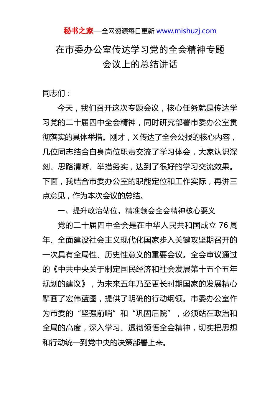 秘书之家—全网资源每日更新 www.mishuzj.com在市委办公室传达学习党的全会精神专题会议上的总结讲话 同志们:今天,我们召开这次专题会议,核心任务就是传达学习党的二十届四中全会精神,同时研究部署市委办公室贯彻落实的具体举措。刚才,X 传达了全会公报的核心内容,几位同志结合自身岗位职责交流了学习体会,大家认识深刻、思路清晰、举措务实,达到了很好的学习交流效果。下面,我结合市委办公室的职能定位和工作实际,再讲三点意见,作为本次会议的总结。一、提升政治站位,精准领会全会精神核心要义党的二十届四中全会是在中华人民共和国成立 76 周年、全面建设社会主义现代化国家步入关键攻坚期召开的一次具有全局性、历史性意义的重要会议。全会审议通过的《中共中央关于制定国民经济和社会发展第十五个五年规划的建议》,为未来五年乃至更长时期国家的发展精心擘画了宏伟蓝图,提供了明确的行动纲领。市委办公室作为市委的“坚强前哨”和“巩固后院”,必须站在政治和全局的高度,深入学习、透彻领悟全会精神,切实把思想和行动统一到党中央的决策部署上来。秘书之家—全网资源每日更新 www.mishuzj.com(一)深刻把握“十五五”时期重大历史方位。全会明确指出,“十五五”时期是基本实现社会主义现代化的关键阶段,是承前启后、继往开来的重要五年。这一重大判断,既精准标定了时代坐标,也清晰明确了历史使命。对于 XX 市而言,这五年是突破发展瓶颈、实现转型升级的攻坚期,是补齐民生短板、提升城市能级的机遇期。市委办公室全体干部要深刻把握这一历史方位,增强使命感和责任感,主动将办公室工作置于国家发展大局、全市发展全局中去谋划、去推进。以“时时放心不下”的责任感和“事事落实到位”的执行力,为全市高质量发展提供坚实保障。(二)深刻领会高质量发展核心任务。全会将“坚持高质量发展”作为首要任务,着重强调要加快构建新发展格局、发展新质生产力、建设现代化产业体系。这为我们明确了发展的主攻方向。具体到 XX 市,就是要着力破解产业结构不优、创新动能不足、区域发展不均等突出问题,推动经济实现质的有效提升和量的合理增长。市委办公室要精准把握这一核心要求,围绕科技创新、产业升级、区域协调、深化改革等重大部署,找准工作切入点,为市委推动高质量发展提供有力支持。(三)深刻领悟以人民为中心发展思想。全会始终贯秘书之家—全网资源每日更新 www.mishuzj.com穿“人民至上”的价值追求,强调要扎实推进共同富裕、提高人民生活品质,在就业、教育、医疗、养老等领域推出了一系列民生举措。市委办公室作为服务市委、联系群众的桥梁纽带,必须把为民情怀融入“三服务”工作的全过程,始终将群众急难愁盼问题放在心上、抓在手上,推动市委各项民生决策落地见效,让发展成果更多更公平地惠及全体市民。二、强化责任担当,全力推动全会精神贯彻落实学习贯彻全会精神,关键在于落实到具体行动中,体现在工作成效上。市委办公室要充分发挥职能作用,强化责任担当,以务实的举措推动全会精神在市委办公室落地生根。(一)加强统筹协调,凝聚工作合力。市委办公室要充分发挥统筹协调的职能作用,加强与各部门、各单位的沟通协作,形成工作合力。要围绕全会确定的目标任务,加强对各项工作的统筹谋划和协调推进,确保各项工作有序开展。要建立健全工作协调机制,及时解决工作中出现的问题,确保各项任务按时完成。(二)提升参谋水平,为市委决策提供有力支持。市委办公室要充分发挥参谋助手作用,围绕全会精神和市委中心工作,深入开展调查研究,为市委决策提供科学依秘书之家—全网资源每日更新 www.mishuzj.com据。要加强对经济社会发展中的重大问题、热点问题的研究分析,提出有针对性、可操作性的意见和建议。要及时收集、整理、报送各类信息,为市委了解情况、科学决策提供及时准确的信息支持。(三)加强督查督办,确保工作落实。市委办公室要加强对全会精神贯彻落实情况的督查督办,确保各项决策部署落到实处。要建立健全督查督办工作机制,明确督查督办的重点内容、工作流程和责任分工。要加强对重点工作、重大项目的跟...