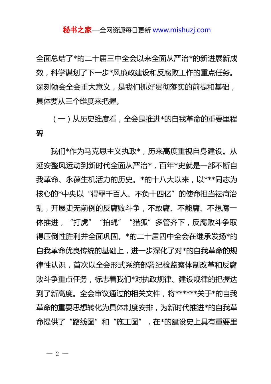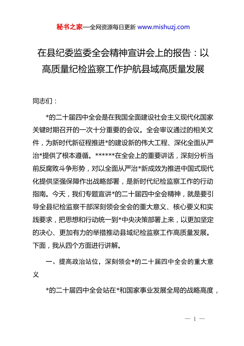 秘书之家—全网资源每日更新 www.mishuzj.com在县纪委监委全会精神宣讲会上的报告:以高质量纪检监察工作护航县域高质量发展同志们:*的二十届四中全会是在我国全面建设社会主义现代化国家关键时期召开的一次十分重要的会议。全会审议通过的相关文件,为新时代新征程推进*的建设新的伟大工程、深化全面从严治*提供了根本遵循。******在全会上的重要讲话,深刻分析当前反腐败斗争形势,对以全面从严治*新成效为推进中国式现代化提供坚强保障作出战略部署,是新时代纪检监察工作的行动指南。今天,我们专题宣讲*的二十届四中全会精神,就是要引导全县纪检监察干部深刻领会全会的重大意义、核心要义和实践要求,把思想和行动统一到*中央决策部署上来,以更加坚定的决心、更加有力的举措推动县域纪检监察工作高质量发展。下面,我从四个方面进行讲解。一、提高政治站位,深刻领会*的二十届四中全会的重大意义*的二十届四中全会站在*和国家事业发展全局的战略高度,— 1 —秘书之家—全网资源每日更新 www.mishuzj.com全面总结了*的二十届三中全会以来全面从严治*的新进展新成效,科学谋划了下一步*风廉政建设和反腐败工作的重点任务。深刻领会全会重大意义,是我们抓好贯彻落实的前提和基础,具体要从三个维度来把握。(一)从历史维度看,全会是推进*的自我革命的重要里程碑我们*作为马克思主义执政*,历来高度重视自身建设。从延安整风运动到新时代全面从严治*,百年*史就是一部不断自我革命、永葆生机活力的历史。*的十八大以来,以***同志为核心的*中央以“得罪千百人、不负十四亿”的使命担当祛疴治乱,开展史无前例的反腐败斗争,不敢腐、不能腐、不想腐一体推进,“打虎”“拍蝇”“猎狐”多管齐下,反腐败斗争取得压倒性胜利并全面巩固。*的二十届四中全会在继承发扬*的自我革命优良传统的基础上,进一步深化了对*的自我革命的规律性认识,首次以全会形式系统部署纪检监察体制改革和反腐败斗争重点任务,标志着我们*对执政规律、建设规律的把握达到了新高度。全会审议通过的相关文件,将******关于*的自我革命的重要思想转化为具体制度安排,为新时代推进*的自我革命提供了“路线图”和“施工图”,在*的建设史上具有重要里— 2 —秘书之家—全网资源每日更新 www.mishuzj.com程碑意义。对于县域层面而言,我们处在*的执政根基最前沿,直接面对基层群众。全会精神为我们破解基层*风廉政建设难题、巩固*的执政根基提供了根本遵循。近年来,我县纪检监察机关查处了一批基层腐败和作风问题,群众满意度持续提升,但基层反腐败斗争形势依然严峻复杂。全会的召开,让我们更加清晰地认识到,只有持续深化自我革命,才能不断清除基层*组织和*员干部中的“害群之马”,确保*的执政根基在基层坚如磐石。(二)从理论维度看,全会丰富发展了**************思想**************思想是当代中国马克思主义、二十一世纪马克思主义,是中华文化和中国精神的时代精华。*的二十届四中全会最重大的理论成果,就是进一步丰富发展了******关于*的自我革命的重要思想。全会深刻阐述了*的自我革命的科学内涵、核心要义、实践要求,明确提出“九个以”的实践路径,即:以坚持和加强*中央集中统一领导为根本保证,以引领伟大社会革命为根本目的,以***********思想为根本遵循,以跳出历史周期率为战略目标,以解决大*独有难题为主攻方向,以健全全面从严治*体系为有效途径,以锻造坚强组织、建设过硬队— 3 —秘书之家—全网资源每日更新 www.mishuzj.com伍为重要着力点,以正风肃纪反腐为重要抓手,以自我净化、自我完善、自我革新、自我提高为核心要求。这“九个以”相互联系、有机统一,构成了逻辑严密、系统完备的思想体系,是对马克思主义建*学说的原创性贡献。******关于*的自我革命的重要思想,是纪检监察工作的思想旗帜和行动指南。全会将这一重要思想与纪检监察体制改革、反腐败斗争具体实践相结合,提出了一系列新思想新观点新论断。比如,在政治监督方面,提出“具体化、精准化、常态化”的明确要求;在纪律建设方面,强调“学纪、知纪、明纪、守纪”常态化长效化;在反腐败斗争方...