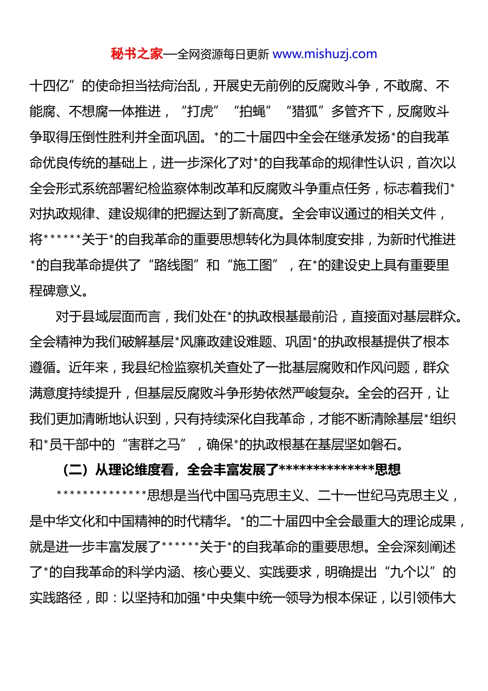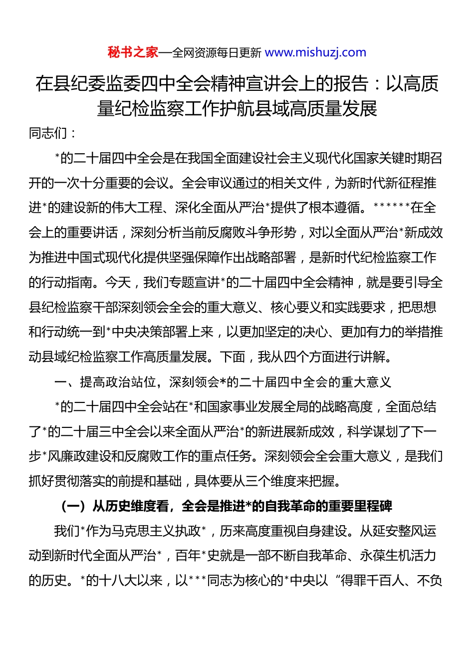 秘书之家—全网资源每日更新 www.mishuzj.com在县纪委监委四中全会精神宣讲会上的报告:以高质量纪检监察工作护航县域高质量发展同志们:*的二十届四中全会是在我国全面建设社会主义现代化国家关键时期召开的一次十分重要的会议。全会审议通过的相关文件,为新时代新征程推进*的建设新的伟大工程、深化全面从严治*提供了根本遵循。******在全会上的重要讲话,深刻分析当前反腐败斗争形势,对以全面从严治*新成效为推进中国式现代化提供坚强保障作出战略部署,是新时代纪检监察工作的行动指南。今天,我们专题宣讲*的二十届四中全会精神,就是要引导全县纪检监察干部深刻领会全会的重大意义、核心要义和实践要求,把思想和行动统一到*中央决策部署上来,以更加坚定的决心、更加有力的举措推动县域纪检监察工作高质量发展。下面,我从四个方面进行讲解。一、提高政治站位,深刻领会*的二十届四中全会的重大意义*的二十届四中全会站在*和国家事业发展全局的战略高度,全面总结了*的二十届三中全会以来全面从严治*的新进展新成效,科学谋划了下一步*风廉政建设和反腐败工作的重点任务。深刻领会全会重大意义,是我们抓好贯彻落实的前提和基础,具体要从三个维度来把握。(一)从历史维度看,全会是推进*的自我革命的重要里程碑我们*作为马克思主义执政*,历来高度重视自身建设。从延安整风运动到新时代全面从严治*,百年*史就是一部不断自我革命、永葆生机活力的历史。*的十八大以来,以***同志为核心的*中央以“得罪千百人、不负秘书之家—全网资源每日更新 www.mishuzj.com十四亿”的使命担当祛疴治乱,开展史无前例的反腐败斗争,不敢腐、不能腐、不想腐一体推进,“打虎”“拍蝇”“猎狐”多管齐下,反腐败斗争取得压倒性胜利并全面巩固。*的二十届四中全会在继承发扬*的自我革命优良传统的基础上,进一步深化了对*的自我革命的规律性认识,首次以全会形式系统部署纪检监察体制改革和反腐败斗争重点任务,标志着我们*对执政规律、建设规律的把握达到了新高度。全会审议通过的相关文件,将******关于*的自我革命的重要思想转化为具体制度安排,为新时代推进*的自我革命提供了“路线图”和“施工图”,在*的建设史上具有重要里程碑意义。对于县域层面而言,我们处在*的执政根基最前沿,直接面对基层群众。全会精神为我们破解基层*风廉政建设难题、巩固*的执政根基提供了根本遵循。近年来,我县纪检监察机关查处了一批基层腐败和作风问题,群众满意度持续提升,但基层反腐败斗争形势依然严峻复杂。全会的召开,让我们更加清晰地认识到,只有持续深化自我革命,才能不断清除基层*组织和*员干部中的“害群之马”,确保*的执政根基在基层坚如磐石。(二)从理论维度看,全会丰富发展了**************思想**************思想是当代中国马克思主义、二十一世纪马克思主义,是中华文化和中国精神的时代精华。*的二十届四中全会最重大的理论成果,就是进一步丰富发展了******关于*的自我革命的重要思想。全会深刻阐述了*的自我革命的科学内涵、核心要义、实践要求,明确提出“九个以”的实践路径,即:以坚持和加强*中央集中统一领导为根本保证,以引领伟大秘书之家—全网资源每日更新 www.mishuzj.com社会革命为根本目的,以***********思想为根本遵循,以跳出历史周期率为战略目标,以解决大*独有难题为主攻方向,以健全全面从严治*体系为有效途径,以锻造坚强组织、建设过硬队伍为重要着力点,以正风肃纪反腐为重要抓手,以自我净化、自我完善、自我革新、自我提高为核心要求。这“九个以”相互联系、有机统一,构成了逻辑严密、系统完备的思想体系,是对马克思主义建*学说的原创性贡献。******关于*的自我革命的重要思想,是纪检监察工作的思想旗帜和行动指南。全会将这一重要思想与纪检监察体制改革、反腐败斗争具体实践相结合,提出了一系列新思想新观点新论断。比如,在政治监督方面,提出“具体化、精准化、常态化”的明确要求;在纪律建设方面,强调“学纪、知纪、明纪、守纪”常态化长效化;在反腐败斗争方面,明确“深化重点领域腐败治理”的主攻方向。这些重要论述,为我们做...