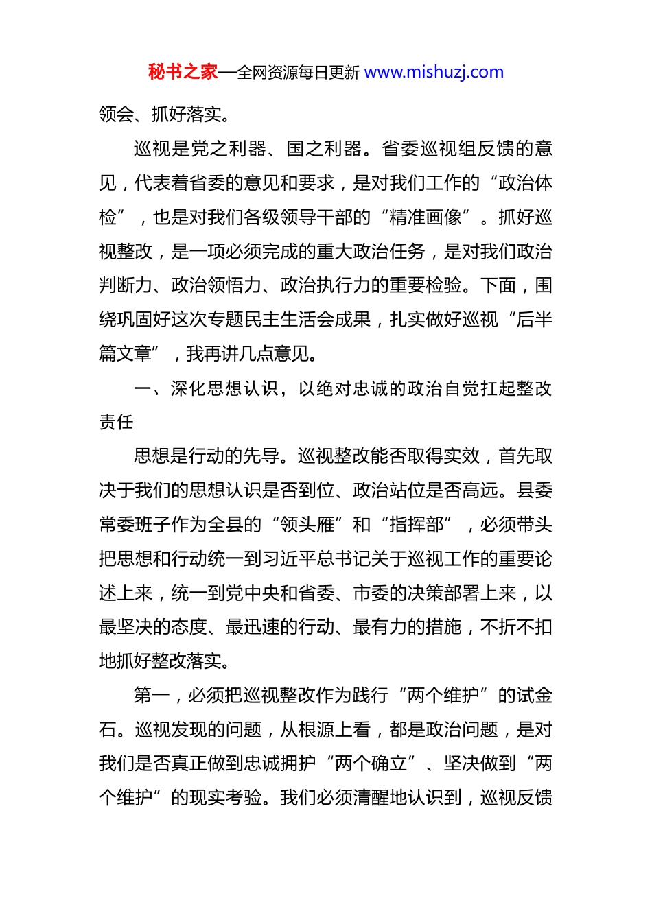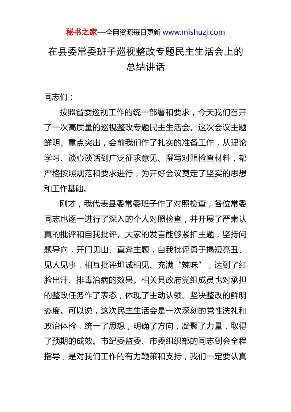 秘书之家—全网资源每日更新 www.mishuzj.com在县委常委班子巡视整改专题民主生活会上的总结讲话 同志们:按照省委巡视工作的统一部署和要求,今天我们召开了一次高质量的巡视整改专题民主生活会。这次会议主题鲜明、重点突出,会前我们作了扎实的准备工作,从理论学习、谈心谈话到广泛征求意见、撰写对照检查材料,都严格按照规范和要求进行,为开好会议奠定了坚实的思想和工作基础。刚才,我代表县委常委班子作了对照检查,各位常委同志也逐一进行了深入的个人对照检查,并开展了严肃认真的批评和自我批评。大家的发言能够紧扣主题,坚持问题导向,开门见山、直奔主题,自我批评勇于揭短亮丑、见人见事,相互批评坦诚相见、充满“辣味”,达到了红脸出汗、排毒治病的效果。相关县政府党组成员也对承担的整改任务作了表态,体现了主动认领、坚决整改的鲜明态度。可以说,这次民主生活会是一次深刻的党性洗礼和政治体检,统一了思想,明确了方向,凝聚了力量,取得了预期的成效。市纪委监委、市委组织部的同志到会全程指导,是对我们工作的有力鞭策和支持,我们一定要认真秘书之家—全网资源每日更新 www.mishuzj.com领会、抓好落实。巡视是党之利器、国之利器。省委巡视组反馈的意见,代表着省委的意见和要求,是对我们工作的“政治体检”,也是对我们各级领导干部的“精准画像”。抓好巡视整改,是一项必须完成的重大政治任务,是对我们政治判断力、政治领悟力、政治执行力的重要检验。下面,围绕巩固好这次专题民主生活会成果,扎实做好巡视“后半篇文章”,我再讲几点意见。一、深化思想认识,以绝对忠诚的政治自觉扛起整改责任思想是行动的先导。巡视整改能否取得实效,首先取决于我们的思想认识是否到位、政治站位是否高远。县委常委班子作为全县的“领头雁”和“指挥部”,必须带头把思想和行动统一到习近平总书记关于巡视工作的重要论述上来,统一到党中央和省委、市委的决策部署上来,以最坚决的态度、最迅速的行动、最有力的措施,不折不扣地抓好整改落实。第一,必须把巡视整改作为践行“两个维护”的试金石。巡视发现的问题,从根源上看,都是政治问题,是对我们是否真正做到忠诚拥护“两个确立”、坚决做到“两个维护”的现实考验。我们必须清醒地认识到,巡视反馈秘书之家—全网资源每日更新 www.mishuzj.com的每一个问题,都不是小事,都关系到党的形象、关系到发展大局、关系到民心向背。我们绝不能有“过关”思想,认为开了会、作了检查就万事大吉;更不能有“侥幸”心理,认为有些问题是“老问题”,可以拖一拖、放一放。班子成员要带头从政治上看问题、查根源、抓整改,把问题整改作为捍卫“两个确立”、做到“两个维护”的具体行动,主动认领、诚恳接受,以动真碰硬的决心和刀刃向内的勇气,确保所有问题清仓见底、全部销号。第二,必须把巡视整改作为推进全面从严治党的有力抓手。巡视是全面从严治党的战略性制度安排。巡视发现的问题,集中反映了我们在管党治党方面存在的短板和弱项。我们必须深刻认识到,抓好巡视整改的过程,就是推动全面从严治党向纵深发展的过程。必须坚决扛起管党治党政治责任,把严的基调、严的措施、严的氛围长期坚持下去。要以此次整改为契机,深入推进干部纪律作风集中整顿,持续深化党风廉政建设和反腐败斗争,层层传导压力,逐级压实责任,推动管党治党从“宽松软”走向“严紧硬”,不断修复和净化我县的政治生态。第三,必须把巡视整改作为推动高质量发展的强大动力。发展是解决一切问题的基础和关键。巡视反馈的问秘书之家—全网资源每日更新 www.mishuzj.com题,既有党的建设方面的,也有经济社会发展方面的,这些问题相互交织、相互影响,许多都已成为制约我县高质量发展的堵点和痛点。我们必须坚持系统观念,把巡视整改与贯彻落实上级各项安排部署一体统筹落实,将整改过程转化为破解发展难题、提升治理能力、推动工作落实的过程。要通过整改,破除思想观念的束缚,扫清体制机制的障碍,激发干事创业的活力,真正把巡视整改的成效体现到推动产业转型、促进乡村振兴、增进民生福祉的实际成果上来,以高质量整改引领和保...