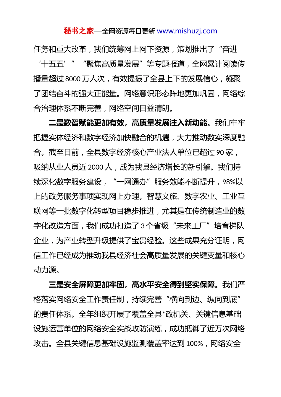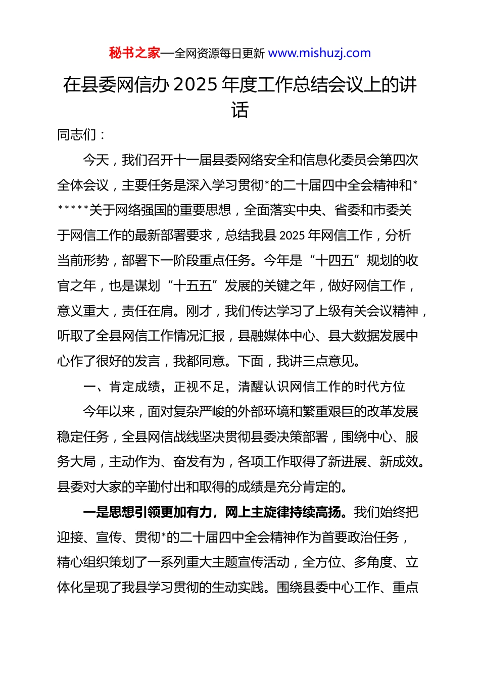 秘书之家—全网资源每日更新 www.mishuzj.com在县委网信办 2025 年度工作总结会议上的讲话同志们:今天,我们召开十一届县委网络安全和信息化委员会第四次全体会议,主要任务是深入学习贯彻*的二十届四中全会精神和******关于网络强国的重要思想,全面落实中央、省委和市委关于网信工作的最新部署要求,总结我县 2025 年网信工作,分析当前形势,部署下一阶段重点任务。今年是“十四五”规划的收官之年,也是谋划“十五五”发展的关键之年,做好网信工作,意义重大,责任在肩。刚才,我们传达学习了上级有关会议精神,听取了全县网信工作情况汇报,县融媒体中心、县大数据发展中心作了很好的发言,我都同意。下面,我讲三点意见。一、肯定成绩,正视不足,清醒认识网信工作的时代方位今年以来,面对复杂严峻的外部环境和繁重艰巨的改革发展稳定任务,全县网信战线坚决贯彻县委决策部署,围绕中心、服务大局,主动作为、奋发有为,各项工作取得了新进展、新成效。县委对大家的辛勤付出和取得的成绩是充分肯定的。一是思想引领更加有力,网上主旋律持续高扬。我们始终把迎接、宣传、贯彻*的二十届四中全会精神作为首要政治任务,精心组织策划了一系列重大主题宣传活动,全方位、多角度、立体化呈现了我县学习贯彻的生动实践。围绕县委中心工作、重点秘书之家—全网资源每日更新 www.mishuzj.com任务和重大改革,我们统筹网上网下资源,策划推出了“奋进‘十五五’”“聚焦高质量发展”等专题报道,全网累计阅读传播量超过 8000 万人次,有效提振了全县上下的发展信心,凝聚了团结奋斗的强大正能量。网络意识形态阵地更加巩固,网络综合治理体系不断完善,网络空间日益清朗。二是数智赋能更加有效,高质量发展注入新动能。我们牢牢把握实体经济和数字经济加快融合的机遇,大力推动数实深度融合。截至目前,全县数字经济核心产业法人单位已超过 90 家,吸纳从业人员近 2000 人,成为我县经济增长的新引擎。我们持续深化数字服务建设,“一网通办”服务效能不断提升,98%以上的政务服务事项实现网上办理。智慧文旅、数字农业、工业互联网等一批数字化转型项目稳步推进,尤其是在传统制造业的数字化改造方面,我们成功打造了 3 个省级“未来工厂”培育梯队企业,为产业转型升级提供了宝贵经验。这些成果充分证明,网信工作已经成为推动我县经济社会高质量发展的关键变量和核心动力源。三是安全屏障更加牢固,高水平安全得到坚实保障。我们严格落实网络安全工作责任制,持续完善“横向到边、纵向到底”的责任体系。全年组织开展了覆盖全县*政机关、关键信息基础设施运营单位的网络安全实战攻防演练,成功抵御了近万次网络攻击。全县关键信息基础设施监测覆盖率达到 100%,网络安全秘书之家—全网资源每日更新 www.mishuzj.com风险漏洞隐患处置率达到 96%以上,重要信息系统安全等级保护测评整改完成率保持高位。网络安全宣传周活动形式新颖、内容丰富,群众的网络安全意识和防护技能得到显著提升,全社会共筑网络安全防线的氛围日益浓厚。在肯定成绩的同时,我们必须清醒地看到,对标******“十个坚持”的重要原则,对标省委、市委的高标准严要求,对标我县高质量发展的迫切需要,我们的工作还存在一些短板和不足。比如,网络安全人才队伍结构性短缺问题依然存在,高层次、实战型人才尤为紧缺;部分传统企业对数字化转型的认识还不够深刻,主动性不强,“不愿转、不敢转、不会转”的问题依然突出;数据孤岛现象尚未彻底根除,跨部门、跨层级的数据共享和业务协同还有待进一步加强;网络安全防护体系仍有薄弱环节,应对新型网络攻击和有组织网络犯罪的能力仍需提升。对于这些问题,我们必须高度重视,采取有力措施,切实加以解决。二、把握大势,抢抓机遇,深刻领会网信工作的使命任务同志们,网信事业代表着新的生产力和新的发展方向。我们必须胸怀“国之大者”,深刻认识和把握网信工作面临的新形势新挑战,在服务大局中找准定位、明确方向。第一,必须从践行“两个维护”的政治高度,深刻把握网信工作的根本原则。做好网信工作,首要的是讲政治。******关于网络强国的...