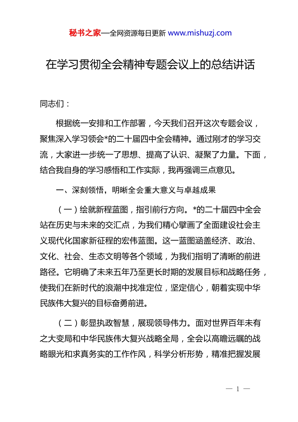 秘书之家—全网资源每日更新 www.mishuzj.com在学习贯彻全会精神专题会议上的总结讲话同志们:根据统一安排和工作部署,今天我们召开这次专题会议,聚焦深入学习领会*的二十届四中全会精神。通过刚才的学习交流,大家进一步统一了思想、提高了认识、凝聚了力量。下面,结合我自身的学习感悟和工作实际,我再强调三点意见。一、深刻领悟,明晰全会重大意义与卓越成果(一)绘就新程蓝图,指引前行方向。*的二十届四中全会站在历史与未来的交汇点,为我们精心擘画了全面建设社会主义现代化国家新征程的宏伟蓝图。这一蓝图涵盖经济、政治、文化、社会、生态文明等各个领域,为我们指明了清晰的前进路径。它明确了未来五年乃至更长时期的发展目标和战略任务,使我们在新时代的浪潮中找准定位,坚定信心,朝着实现中华民族伟大复兴的目标奋勇前进。(二)彰显执政智慧,展现领导伟力。面对世界百年未有之大变局和中华民族伟大复兴战略全局,全会以高瞻远瞩的战略眼光和求真务实的工作作风,科学分析形势,精准把握发展— 1 —秘书之家—全网资源每日更新 www.mishuzj.com大势。提出了一系列具有全局性、战略性、前瞻性的行动纲领,充分彰显了*的执政智慧和领导力量。在复杂多变的国际环境中,*始终保持清醒头脑,带领全国人民沉着应对各种风险挑战,为国家的稳定和发展奠定了坚实基础。(三)凝聚团结力量,激发奋进豪情。全会的胜利召开,凝聚了全*全国各族人民团结奋斗的磅礴力量。通过深入学习全会精神,广大*员干部和群众进一步增强了对*的信任和拥护,坚定了听*话、跟*走的决心。在*的坚强领导下,全国人民心往一处想、劲往一处使,形成了推动国家发展的强大合力。这种团结一心、众志成城的精神,将激励我们在新的征程上不断创造新的辉煌。二、精准把握,领会全会精神核心要义与丰富内涵(一)聚焦高质发展,筑牢强国根基。全会着重强调,高质量发展是全面建设社会主义现代化国家的首要任务。我们必须完整、准确、全面贯彻新发展理念,全力推动经济实现质的有效提升和量的合理增长。具体而言,要加快构建现代化经济体系,着力提高全要素生产率,增强产业链供应链的韧性和安全水平。在推动创新发展方面,要持续加大科技研发投入,强化企业在科技创新中的主体地位,集中力量开展关键核心技术— 2 —秘书之家—全网资源每日更新 www.mishuzj.com攻关,实现高水平科技自立自强。在促进区域协调发展方面,要深入实施区域协调发展战略和区域重大战略,构建优势互补、协同共进的区域经济发展格局。(二)领悟本质要求,推进现代征程。深刻理解中国式现代化的本质要求,是我们贯彻全会精神的重要内容。中国式现代化是人口规模巨大的现代化、是全体人民共同富裕的现代化、是物质文明和精神文明相协调的现代化、是人与自然和谐共生的现代化、是走和平发展道路的现代化。我们要立足国情,把握规律,坚定不移地走中国特色社会主义现代化道路,不断推进和拓展中国式现代化。(三)践行人民至上,增进民生福祉。全会始终坚持以人民为中心的发展思想,把增进民生福祉、提高人民生活品质作为发展的出发点和落脚点。我们要着力解决好人民群众关心的就业、教育、医疗、养老等实际问题,加强社会保障和服务体系建设,提高基本公共服务均等化水平。要巩固拓展脱贫攻坚成果,全面推进乡村振兴,促进农业高质高效、农村宜居宜业、农民富裕富足。(四)贯彻治*方针,永葆先进纯洁。全面从严治*是*永葆生机活力、走好新的赶考之路的必由之路。我们要深刻领会全— 3 —秘书之家—全网资源每日更新 www.mishuzj.com面从严治*的战略方针,坚持严的主基调不动摇,加强*的政治建设,严守*的政治纪律和政治规矩。要加强干部队伍建设,培养造就忠诚干净担当的高素质干部队伍。要持续推进*风廉政建设和反腐败斗争,坚决整治群众身边的不正之风和腐败问题,营造风清气正的政治生态。三、狠抓落实,转化全会精神为工作强大动力(一)深化理论武装,筑牢思想根基。把学习贯彻全会精神作为当前和今后一个时期的重要政治任务,精心组织学习培训,广泛开展宣传宣讲。领导干部要以身作则、率先垂范,通过*委理论...