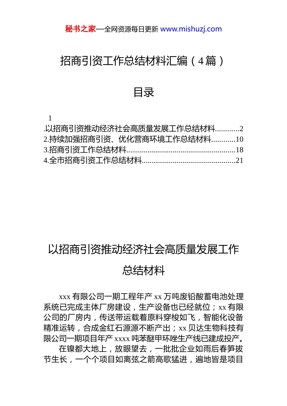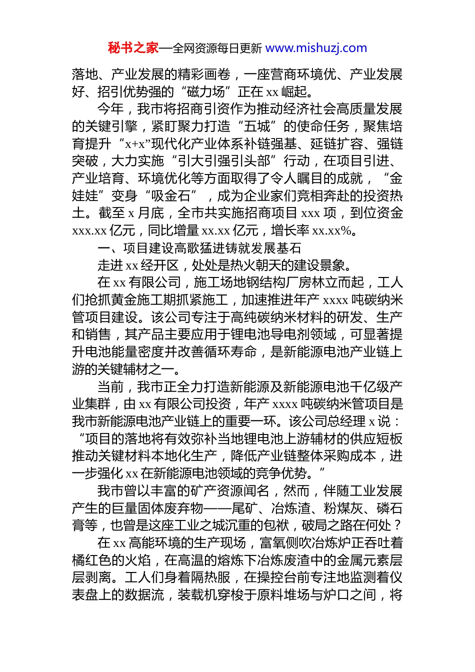 秘书之家—全网资源每日更新 www.mishuzj.com招商引资工作总结材料汇编(4 篇)目录1.以招商引资推动经济社会高质量发展工作总结材料............22.持续加强招商引资、优化营商环境工作总结材料............103.招商引资工作总结材料........................................................184.全市招商引资工作总结材料................................................21以招商引资推动经济社会高质量发展工作总结材料xxx 有限公司一期工程年产 xx 万吨废铅酸蓄电池处理系统已完成主体厂房建设,生产设备也已经就位;xx 有限公司的厂房内,传送带运载着原料穿梭如飞,智能化设备精准运转,合成金红石源源不断产出;xx 贝达生物科技有限公司一期项目年产 xxxx 吨苯醚甲环唑生产线已建成投产。在镍都大地上,放眼望去,一批批企业如雨后春笋拔节生长,一个个项目如离弦之箭高歌猛进,遍地皆是项目秘书之家—全网资源每日更新 www.mishuzj.com落地、产业发展的精彩画卷,一座营商环境优、产业发展好、招引优势强的“磁力场”正在 xx 崛起。今年,我市将招商引资作为推动经济社会高质量发展的关键引擎,紧盯聚力打造“五城”的使命任务,聚焦培育提升“x+x”现代化产业体系补链强基、延链扩容、强链突破,大力实施“引大引强引头部”行动,在项目引进、产业培育、环境优化等方面取得了令人瞩目的成就,“金娃娃”变身“吸金石”,成为企业家们竞相奔赴的投资热土。截至 x 月底,全市共实施招商项目 xxx 项,到位资金xxx.xx 亿元,同比增量 xx.xx 亿元,增长率 xx.xx%。一、项目建设高歌猛进铸就发展基石走进 xx 经开区,处处是热火朝天的建设景象。在 xx 有限公司,施工场地钢结构厂房林立而起,工人们抢抓黄金施工期抓紧施工,加速推进年产 xxxx 吨碳纳米管项目建设。该公司专注于高纯碳纳米材料的研发、生产和销售,其产品主要应用于锂电池导电剂领域,可显著提升电池能量密度并改善循环寿命,是新能源电池产业链上游的关键辅材之一。当前,我市正全力打造新能源及新能源电池千亿级产业集群,由 xx 有限公司投资,年产 xxxx 吨碳纳米管项目是我市新能源电池产业链上的重要一环。该公司总经理 x 说:“项目的落地将有效弥补当地锂电池上游辅材的供应短板推动关键材料本地化生产,降低产业链整体采购成本,进一步强化 xx 在新能源电池领域的竞争优势。”我市曾以丰富的矿产资源闻名,然而,伴随工业发展产生的巨量固体废弃物——尾矿、冶炼渣、粉煤灰、磷石膏等,也曾是这座工业之城沉重的包袱,破局之路在何处?在 xx 高能环境的生产现场,富氧侧吹冶炼炉正吞吐着橘红色的火焰,在高温的熔炼下冶炼废渣中的金属元素层层剥离。工人们身着隔热服,在操控台前专注地监测着仪表盘上的数据流,装载机穿梭于原料堆场与炉口之间,将秘书之家—全网资源每日更新 www.mishuzj.comxx 集团送来的低镍高硫阳极泥源源不断地投入生产。xx 有限公司总经理助理 xx 介绍说:“我们采用火法富集与湿法精炼结合的工艺,就像给固危废做‘精密手术’——先通过高温熔炼让金、银、铂、钯等贵金属析出,再用湿法技术逐个提纯。这些黑褐色的废渣,经过生产线解析,最终能变成高纯度的金属锭。2024 年,公司完成营业收入 x.xx 亿元,净利润 xxxx 万元,利税 xxx 万元。”近年来,我市积极融入全省“七地一屏一通道”建设,市企一体推动创新链和产业链深度融合,具有 xx 特色和优势的现代化产业体系加速构建。x 个千亿产业集群成势、蝶变升级。有色金属新材料产业迈上千亿级规模,xx 有色金属集群入选国家先进制造业集群、镍铜钴新材料产业集群被认定为省级先进制造业集群,全国镍铜钴有色金属新材料现代制造业基地加快打造。新能源及新能源电池产业加快迈向千亿级规模,成为 xx 最大的新能源电池及材料供应基地、全省最大的新能源电池制造基地,正在打造全国重要的新能源电池和电池材料供应基地。x 个百亿产业蹄疾步稳、多点开花。数字经济产业加速拓链,紫金云大数据中心达到国际 tx 标准和 xa 绿色等级,西部首家网络货运产业园建成运营,...
