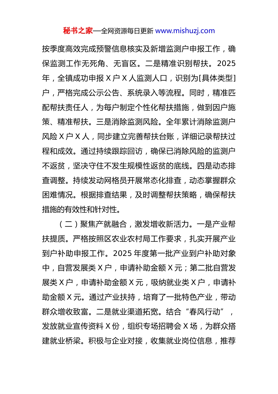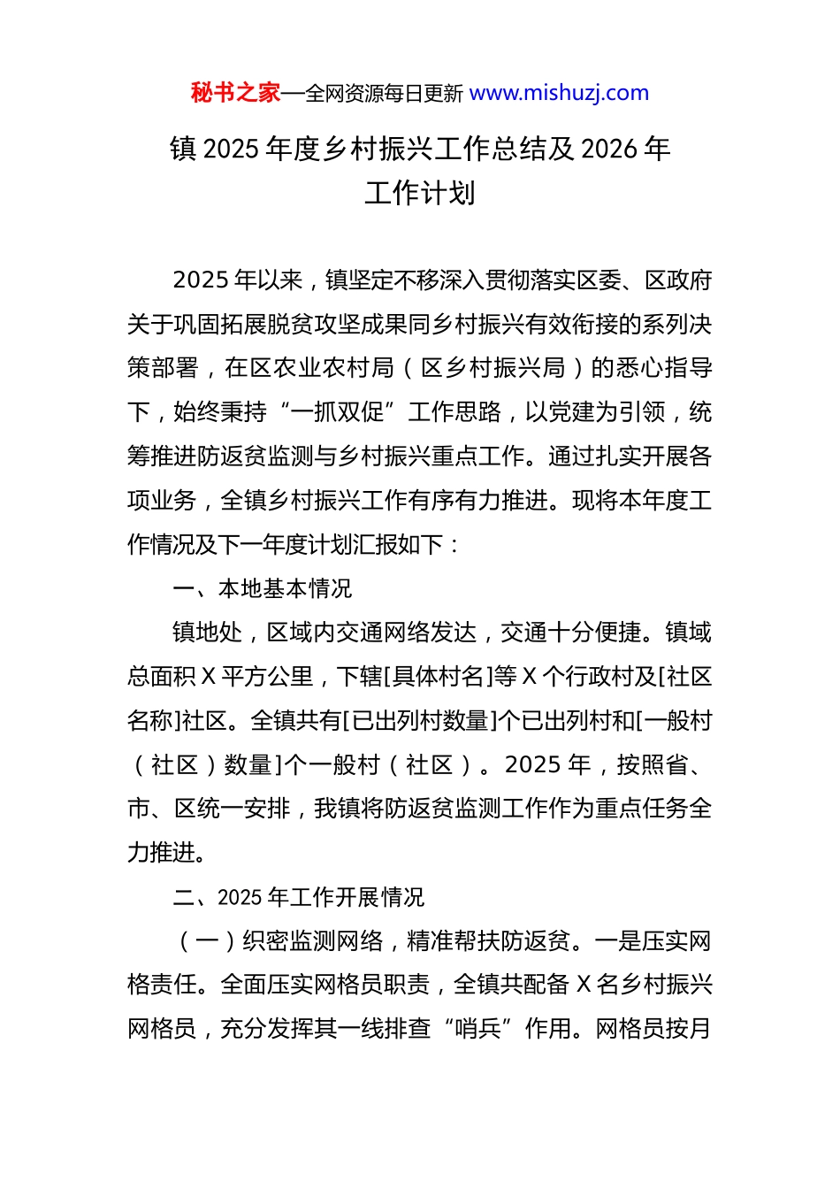 秘书之家—全网资源每日更新 www.mishuzj.com镇 2025 年度乡村振兴工作总结及 2026 年工作计划 2025 年以来,镇坚定不移深入贯彻落实区委、区政府关于巩固拓展脱贫攻坚成果同乡村振兴有效衔接的系列决策部署,在区农业农村局(区乡村振兴局)的悉心指导下,始终秉持“一抓双促”工作思路,以党建为引领,统筹推进防返贫监测与乡村振兴重点工作。通过扎实开展各项业务,全镇乡村振兴工作有序有力推进。现将本年度工作情况及下一年度计划汇报如下:一、本地基本情况镇地处,区域内交通网络发达,交通十分便捷。镇域总面积 X 平方公里,下辖[具体村名]等 X 个行政村及[社区名称]社区。全镇共有[已出列村数量]个已出列村和[一般村(社区)数量]个一般村(社区)。2025 年,按照省、市、区统一安排,我镇将防返贫监测工作作为重点任务全力推进。二、2025 年工作开展情况(一)织密监测网络,精准帮扶防返贫。一是压实网格责任。全面压实网格员职责,全镇共配备 X 名乡村振兴网格员,充分发挥其一线排查“哨兵”作用。网格员按月秘书之家—全网资源每日更新 www.mishuzj.com按季度高效完成预警信息核实及新增监测户申报工作,确保监测工作无死角、无盲区。二是精准识别帮扶。2025年,全镇成功申报 X 户 X 人监测人口,识别为[具体类型]户,严格完成公示公告、系统录入等流程。同时,精准匹配帮扶责任人,为每户制定个性化帮扶措施,做到因户施策、精准帮扶。三是消除监测风险。全年累计消除监测户风险 X 户 X 人,同步建立完善帮扶台账,详细记录帮扶过程和成效。通过持续跟踪回访,确保已消除风险的监测户不返贫,坚决守住不发生规模性返贫的底线。四是动态排查调整。持续发动网格员开展常态化排查,动态掌握群众困难情况。根据排查结果,及时调整帮扶策略,确保帮扶措施的有效性和针对性。(二)聚焦产就融合,激发增收新活力。一是产业帮扶提质。严格按照区农业农村局工作要求,扎实开展产业到户补助申报工作。2025 年度第一批产业到户补助对象中,自营发展类 X 户,申请补助金额 X 元;第二批自营发展类 X 户,申请补助金额 X 元,吸纳就业类 X 户,申请补助金额 X 元。通过产业扶持,培育了一批特色产业,带动群众增收致富。二是就业渠道拓宽。结合“春风行动”,发放就业宣传资料 X 份,组织专场招聘会 X 场,为群众搭建就业桥梁。积极与企业对接,收集就业岗位信息,推荐秘书之家—全网资源每日更新 www.mishuzj.com脱贫户和监测户就业。对省外务工的脱贫户和监测户给予交通补贴,每人 X 元,全年累计发放 X 人,发放金额 X元。三是信贷管理强化。每月按时上报小额信贷风险监测表,密切跟踪贷款户生产经营状况,确保其良性运营并按期还款。积极宣传脱贫人口小额信贷政策,协助符合条件的脱贫户规范申报。截至 2025 年 10 月 14 日,全镇年度累计完成贷款 X 户,发放贷款金额 X 元,其中[户贷户用数量]户户贷户用,[抱团发展数量]户与[经营主体数量]家经营主体抱团发展。(三)优化乡村环境,打造宜居新家园。一是基础设施建设。加大农村基础设施建设投入,改善农村生产生活条件。新建和改造农村道路 X 公里,解决了群众出行难问题;实施农村饮水安全巩固提升工程,保障了群众饮水安全;推进农村电网改造升级,提高了供电可靠性。二是人居环境整治。深入开展农村人居环境整治行动,加强农村垃圾、污水治理,推进厕所革命。全镇新建和改造农村卫生厕所 X 户,农村卫生厕所普及率达到 X%;建设农村污水处理设施 X 处,农村生活污水治理率达到 X%;建立健全农村垃圾收运处置体系,农村垃圾无害化处理率达到 X%。三是生态环境保护。加强农村生态环境保护,推进山水林田湖草系统治理。开展植树造林活动,新增造林面积 X 亩;秘书之家—全网资源每日更新 www.mishuzj.com加强对农村饮用水水源地的保护,确保水质安全;加强对农业面源污染的治理,减少化肥、农药使用量。(四)强化文化建设,培育文明新风尚。一是文化设施完善。加大农村文化设施建设投入,完善农村公共文化服务体系。新建和改造农村文化活动室 X...