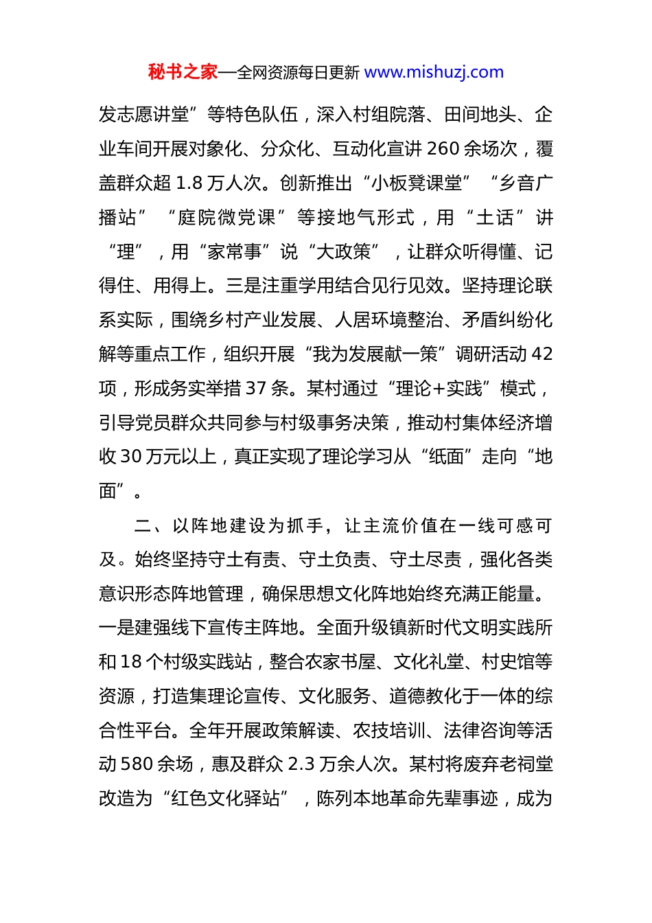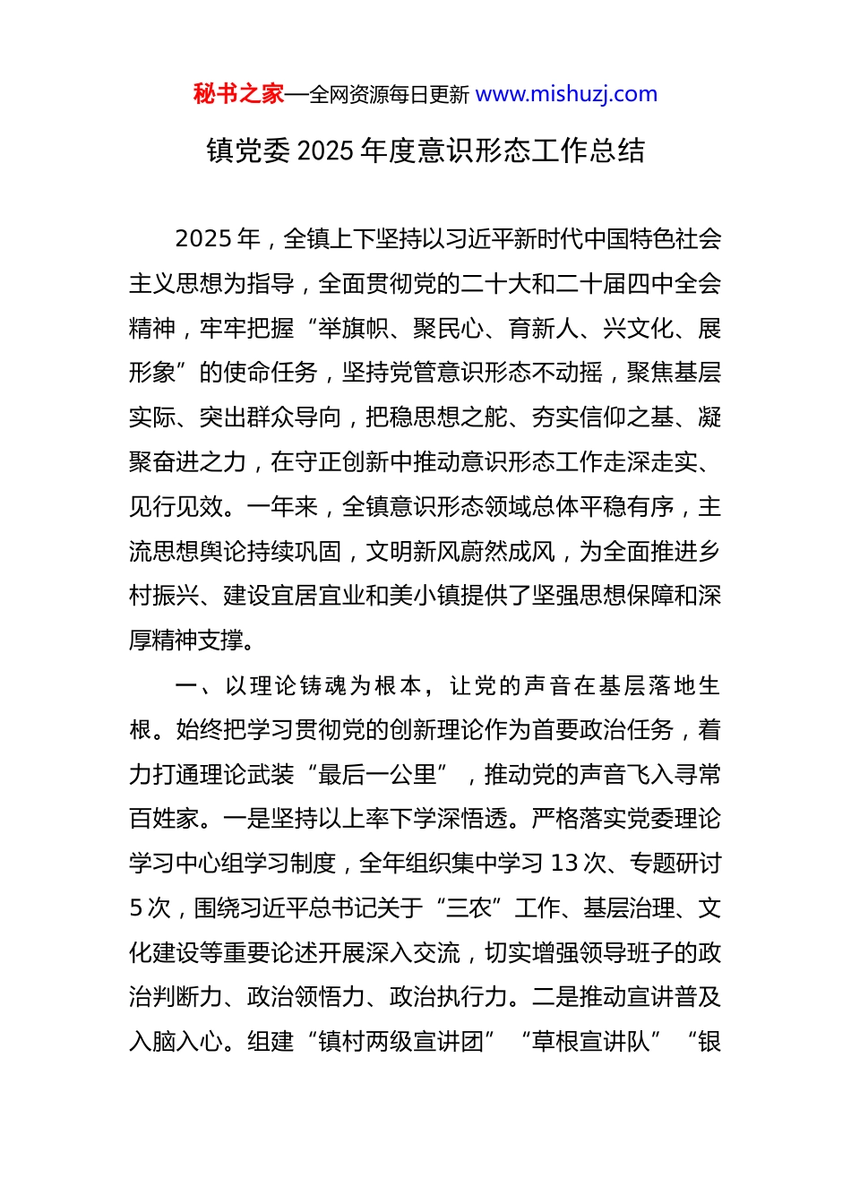 秘书之家—全网资源每日更新 www.mishuzj.com镇党委 2025 年度意识形态工作总结 2025 年,全镇上下坚持以习近平新时代中国特色社会主义思想为指导,全面贯彻党的二十大和二十届四中全会精神,牢牢把握“举旗帜、聚民心、育新人、兴文化、展形象”的使命任务,坚持党管意识形态不动摇,聚焦基层实际、突出群众导向,把稳思想之舵、夯实信仰之基、凝聚奋进之力,在守正创新中推动意识形态工作走深走实、见行见效。一年来,全镇意识形态领域总体平稳有序,主流思想舆论持续巩固,文明新风蔚然成风,为全面推进乡村振兴、建设宜居宜业和美小镇提供了坚强思想保障和深厚精神支撑。一、以理论铸魂为根本,让党的声音在基层落地生根。始终把学习贯彻党的创新理论作为首要政治任务,着力打通理论武装“最后一公里”,推动党的声音飞入寻常百姓家。一是坚持以上率下学深悟透。严格落实党委理论学习中心组学习制度,全年组织集中学习 13 次、专题研讨5 次,围绕习近平总书记关于“三农”工作、基层治理、文化建设等重要论述开展深入交流,切实增强领导班子的政治判断力、政治领悟力、政治执行力。二是推动宣讲普及入脑入心。组建“镇村两级宣讲团”“草根宣讲队”“银秘书之家—全网资源每日更新 www.mishuzj.com发志愿讲堂”等特色队伍,深入村组院落、田间地头、企业车间开展对象化、分众化、互动化宣讲 260 余场次,覆盖群众超 1.8 万人次。创新推出“小板凳课堂”“乡音广播站”“庭院微党课”等接地气形式,用“土话”讲“理”,用“家常事”说“大政策”,让群众听得懂、记得住、用得上。三是注重学用结合见行见效。坚持理论联系实际,围绕乡村产业发展、人居环境整治、矛盾纠纷化解等重点工作,组织开展“我为发展献一策”调研活动 42项,形成务实举措 37 条。某村通过“理论+实践”模式,引导党员群众共同参与村级事务决策,推动村集体经济增收 30 万元以上,真正实现了理论学习从“纸面”走向“地面”。二、以阵地建设为抓手,让主流价值在一线可感可及。始终坚持守土有责、守土负责、守土尽责,强化各类意识形态阵地管理,确保思想文化阵地始终充满正能量。一是建强线下宣传主阵地。全面升级镇新时代文明实践所和 18 个村级实践站,整合农家书屋、文化礼堂、村史馆等资源,打造集理论宣传、文化服务、道德教化于一体的综合性平台。全年开展政策解读、农技培训、法律咨询等活动 580 余场,惠及群众 2.3 万余人次。某村将废弃老祠堂改造为“红色文化驿站”,陈列本地革命先辈事迹,成为秘书之家—全网资源每日更新 www.mishuzj.com村民缅怀先烈、接受教育的热门打卡点。二是管好线上舆论新空间。严格落实网络意识形态工作责任制,加强对镇政府网站、微信公众号、村居微信群等平台的内容审核与动态监管,全年发布权威信息 1900 余条,实行“三审三校”全覆盖,未发生一起负面舆情事件。建立镇村两级网络舆情响应机制,配备专兼职信息员 56 名,及时回应群众关切,妥善处置苗头性问题 21 起,有效维护清朗网络环境。三是规范活动场所管理。对全镇报告会、讲座讲坛、文艺演出等实行备案审批制,严把内容关、人员关、流程关,全年审批各类活动 138 场,确保活动导向正确、健康向上。加强对宗教活动场所的监督管理,坚决防范非法宗教渗透,筑牢基层思想防线。三、以典型引领为牵引,让榜样力量在身边温暖人心。坚持用身边事教育身边人,大力弘扬社会主义核心价值观,营造崇德向善、见贤思齐的良好风尚。一是精心选树先进典型。深入开展“最美人物”系列评选活动,推选出“最美村干部”“最美家庭”“最美志愿者”“最美孝子”等基层榜样 62 名,通过张榜公示、巡回宣讲、媒体推介等方式广泛宣传其感人事迹。82 岁的老党员李桂芳十余年如一日义务清扫村道、调解邻里纠纷,被群众亲切称为“不退休的支书”,其故事经镇微信公众号推送后引发热秘书之家—全网资源每日更新 www.mishuzj.com烈反响,阅读量突破 3 万次。二是讲好百姓奋斗故事。策划推出《小镇面孔》《我家这十年》等主题栏目,以图文、短视频等形式记录普通群众在乡村振兴中的点滴变化与...