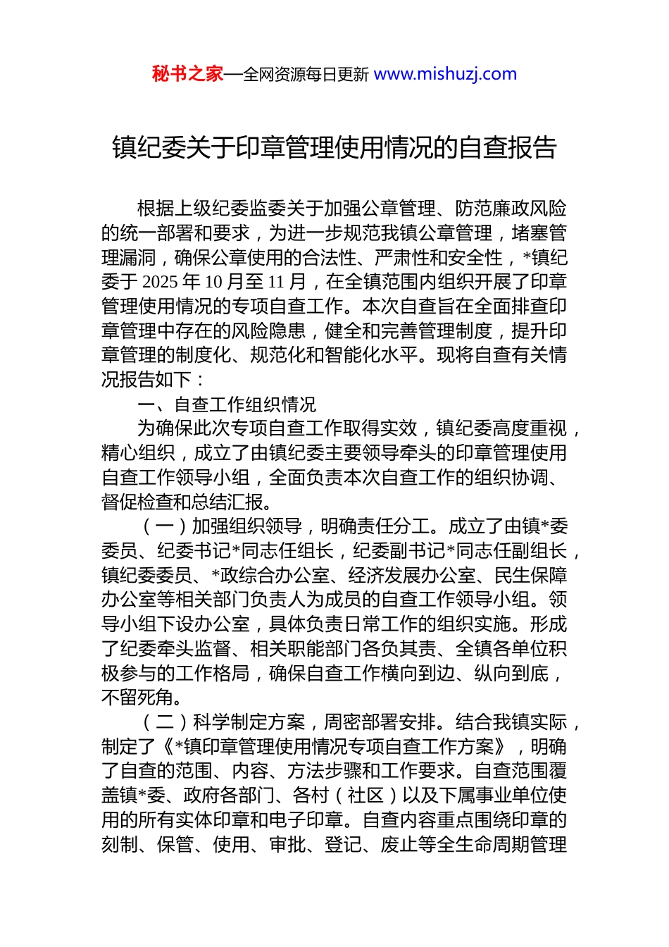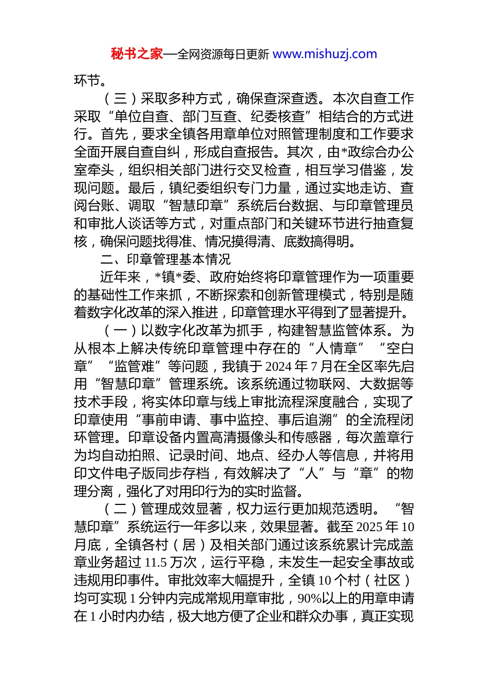 秘书之家—全网资源每日更新 www.mishuzj.com镇纪委关于印章管理使用情况的自查报告根据上级纪委监委关于加强公章管理、防范廉政风险的统一部署和要求,为进一步规范我镇公章管理,堵塞管理漏洞,确保公章使用的合法性、严肃性和安全性,*镇纪委于 2025 年 10 月至 11 月,在全镇范围内组织开展了印章管理使用情况的专项自查工作。本次自查旨在全面排查印章管理中存在的风险隐患,健全和完善管理制度,提升印章管理的制度化、规范化和智能化水平。现将自查有关情况报告如下:一、自查工作组织情况为确保此次专项自查工作取得实效,镇纪委高度重视,精心组织,成立了由镇纪委主要领导牵头的印章管理使用自查工作领导小组,全面负责本次自查工作的组织协调、督促检查和总结汇报。(一)加强组织领导,明确责任分工。成立了由镇*委委员、纪委书记*同志任组长,纪委副书记*同志任副组长,镇纪委委员、*政综合办公室、经济发展办公室、民生保障办公室等相关部门负责人为成员的自查工作领导小组。领导小组下设办公室,具体负责日常工作的组织实施。形成了纪委牵头监督、相关职能部门各负其责、全镇各单位积极参与的工作格局,确保自查工作横向到边、纵向到底,不留死角。(二)科学制定方案,周密部署安排。结合我镇实际,制定了《*镇印章管理使用情况专项自查工作方案》,明确了自查的范围、内容、方法步骤和工作要求。自查范围覆盖镇*委、政府各部门、各村(社区)以及下属事业单位使用的所有实体印章和电子印章。自查内容重点围绕印章的刻制、保管、使用、审批、登记、废止等全生命周期管理秘书之家—全网资源每日更新 www.mishuzj.com环节。(三)采取多种方式,确保查深查透。本次自查工作采取“单位自查、部门互查、纪委核查”相结合的方式进行。首先,要求全镇各用章单位对照管理制度和工作要求全面开展自查自纠,形成自查报告。其次,由*政综合办公室牵头,组织相关部门进行交叉检查,相互学习借鉴,发现问题。最后,镇纪委组织专门力量,通过实地走访、查阅台账、调取“智慧印章”系统后台数据、与印章管理员和审批人谈话等方式,对重点部门和关键环节进行抽查复核,确保问题找得准、情况摸得清、底数搞得明。二、印章管理基本情况近年来,*镇*委、政府始终将印章管理作为一项重要的基础性工作来抓,不断探索和创新管理模式,特别是随着数字化改革的深入推进,印章管理水平得到了显著提升。(一)以数字化改革为抓手,构建智慧监管体系。为从根本上解决传统印章管理中存在的“人情章”“空白章”“监管难”等问题,我镇于 2024 年 7 月在全区率先启用“智慧印章”管理系统。该系统通过物联网、大数据等技术手段,将实体印章与线上审批流程深度融合,实现了印章使用“事前申请、事中监控、事后追溯”的全流程闭环管理。印章设备内置高清摄像头和传感器,每次盖章行为均自动拍照、记录时间、地点、经办人等信息,并将用印文件电子版同步存档,有效解决了“人”与“章”的物理分离,强化了对用印行为的实时监督。(二)管理成效显著,权力运行更加规范透明。“智慧印章”系统运行一年多以来,效果显著。截至 2025 年 10月底,全镇各村(居)及相关部门通过该系统累计完成盖章业务超过 11.5 万次,运行平稳,未发生一起安全事故或违规用印事件。审批效率大幅提升,全镇 10 个村(社区)均可实现 1 分钟内完成常规用章审批,90%以上的用章申请在 1 小时内办结,极大地方便了企业和群众办事,真正实现秘书之家—全网资源每日更新 www.mishuzj.com了“数据多跑路,群众少跑腿”。通过技术赋能,权力运行的轨迹清晰可见,监管部门可随时通过后台数据进行监督核查,有效杜绝了违规用印的现象。自系统启用以来,镇纪委未再收到任何关于乱用章、违规用章的信访举报,基层治理效能和群众满意度得到双重提升。(三)制度体系初步健全,管理责任得到落实。我镇初步建立了以《*镇人民政府印章管理办法》为核心的制度体系,对各类印章的刻制申请、启用备案、保管交接、使用审批、停用封存及销毁等环节作出了明确规定。全镇现有在用印章共计 38 枚,均按照规定明确了印...