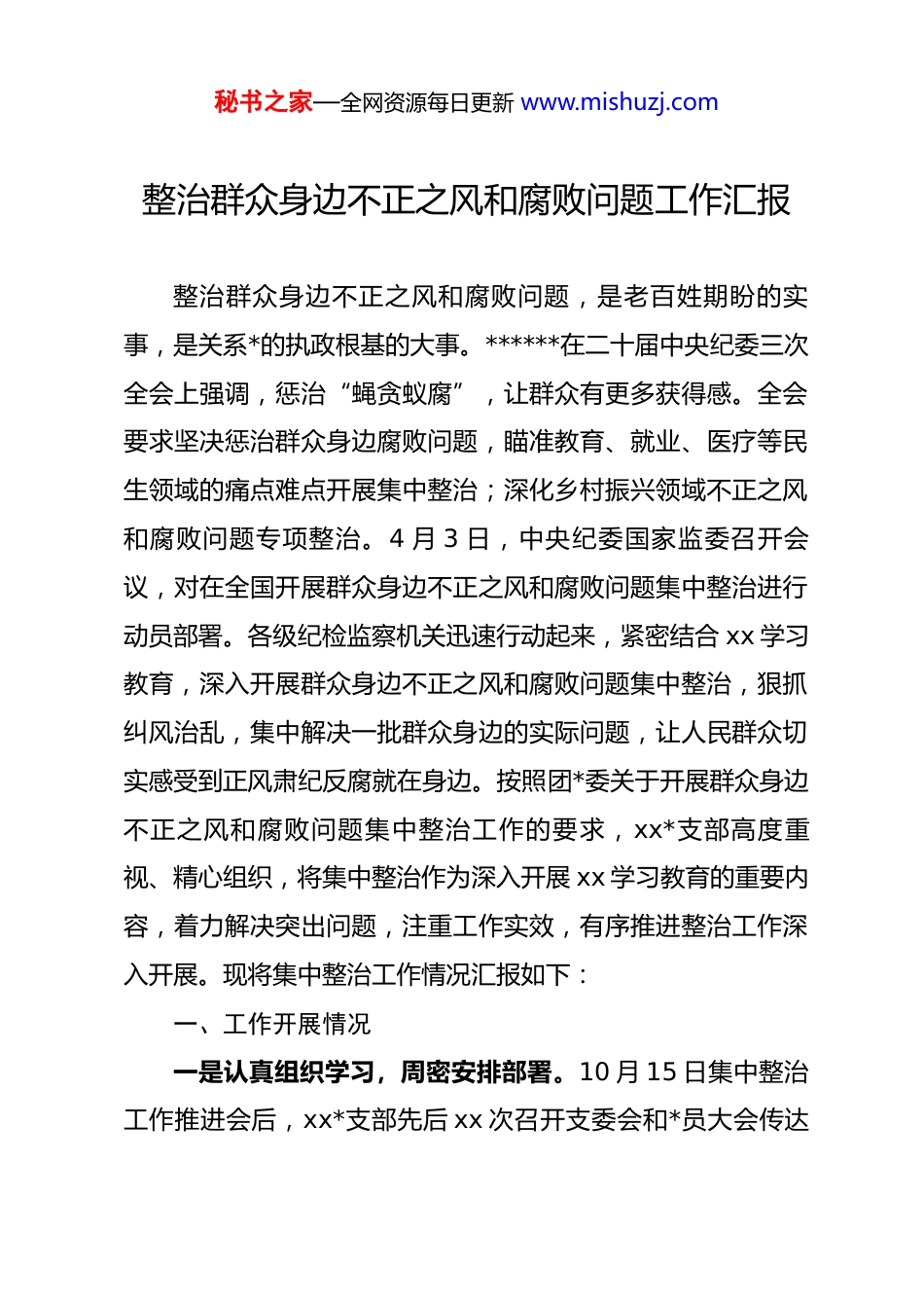 秘书之家—全网资源每日更新 www.mishuzj.com整治群众身边不正之风和腐败问题工作汇报整治群众身边不正之风和腐败问题,是老百姓期盼的实事,是关系*的执政根基的大事。******在二十届中央纪委三次全会上强调,惩治“蝇贪蚁腐”,让群众有更多获得感。全会要求坚决惩治群众身边腐败问题,瞄准教育、就业、医疗等民生领域的痛点难点开展集中整治;深化乡村振兴领域不正之风和腐败问题专项整治。4 月 3 日,中央纪委国家监委召开会议,对在全国开展群众身边不正之风和腐败问题集中整治进行动员部署。各级纪检监察机关迅速行动起来,紧密结合 xx 学习教育,深入开展群众身边不正之风和腐败问题集中整治,狠抓纠风治乱,集中解决一批群众身边的实际问题,让人民群众切实感受到正风肃纪反腐就在身边。按照团*委关于开展群众身边不正之风和腐败问题集中整治工作的要求,xx*支部高度重视、精心组织,将集中整治作为深入开展 xx 学习教育的重要内容,着力解决突出问题,注重工作实效,有序推进整治工作深入开展。现将集中整治工作情况汇报如下:一、工作开展情况一是认真组织学习,周密安排部署。10 月 15 日集中整治工作推进会后,xx*支部先后 xx 次召开支委会和*员大会传达秘书之家—全网资源每日更新 www.mishuzj.com学习各级集中整治会议精神和《超常规大纵深推进 jzzz 工作的具体措施》,压紧压实责任,扎实开展集中整治工作,第一时间公示了集中整治工作重点内容、举报电话,同时设立举报信箱。组织连队“两委”分片区入户走访,和职工群众面对面交流,向职工群众宣传宣讲开展群众身边不正之风和腐败问题集中整治的重大意义和集中整治的重点内容,告知职工群众可以完全打消思想顾虑,反映客观真实情况,表达困难诉求,所有两委成员将严格遵守工作纪律,遵守**规定,做好信息**工作。同时,“两委”成员入户走访进一步掌握基层工作情况,了解职工群众的困难诉求,解决一批民生领域问题,全面摸排问题线索,为 xx 名困难群众办理了临时救助,累计发现问题xx 个,推动整改落实 xx 个。二是强化组织领导,明确责任分工。xx*支部始终把集中整治工作摆在突出位置,当作首要工作去思考谋划、推进落实,以实际行动推动整治工作落地见效。充分发挥好支部书记牵头抓落实,书记带头执行工作纪律,带好班子队伍,拟定工作方案、安排推动集中整治工作,认真了解每个班子成员的履责情况,切实杜绝侵害群众利益问题的发生。严格要求“两委”班子成员按照工作分工,对所分管工作可能存在的苗头性问题,严格落实风险防控措施,做到责任到位、工作到位、服秘书之家—全网资源每日更新 www.mishuzj.com务群众到位,确保集中整治工作向纵深推进。同时,多措并举开展集中整治行动宣传活动,线上充分利用微信群等进行宣传,向广大群众最大限度地推送信息并动员*员干部积极转发,全面传递反腐最强音,累计受众 xx 人次,线下召开集中整治动员会,向群众传达整治工作的重要意义和目标,提高群众的知晓率和参与度,今年以来,受理信访举报 xx 次。三是坚持严查细纠,排查重点问题。持续开展“两委”工作作风整治行动,聚焦工作作风问题,每月对“两委”在职在岗和工作作风等方面开展不定期检查,通报相关情况,形成良好的工作氛围。就涉及的惠农补贴政策落实、土地流转等方面重点问题深入开展排查,发现问题立即整改。在惠农补贴政策落实方面,组织人员对补贴补助的公开透明、分配、发放等环节进行了深入细致的排查,经过排查和征求职工群众意见,共起底排查问题线索 xx 件。在土地流转方面,重点排查在土地流转中是否存在优亲厚友、违规操作等损害职工群众利益问题;在身份地流转中个人流转面积是否高于职工身份地面积 5 倍,农工合作社和龙头企业是否未经审批流转超过 2000 亩等超面积流转“垒大户”的情况;是否存在未经审核程序私下签订流转合同,口头约定未签订流转合同等私下流转行为;是否存在“两委”和承包“大户”间输送利益行为;在身份地流转、经秘书之家—全网资源每日更新 www.mishuzj.com营地竞拍过程中是否存在应竞拍不竞拍、搞虚假竞拍、竞拍过程不公开、不...