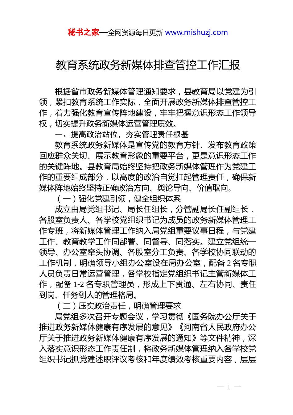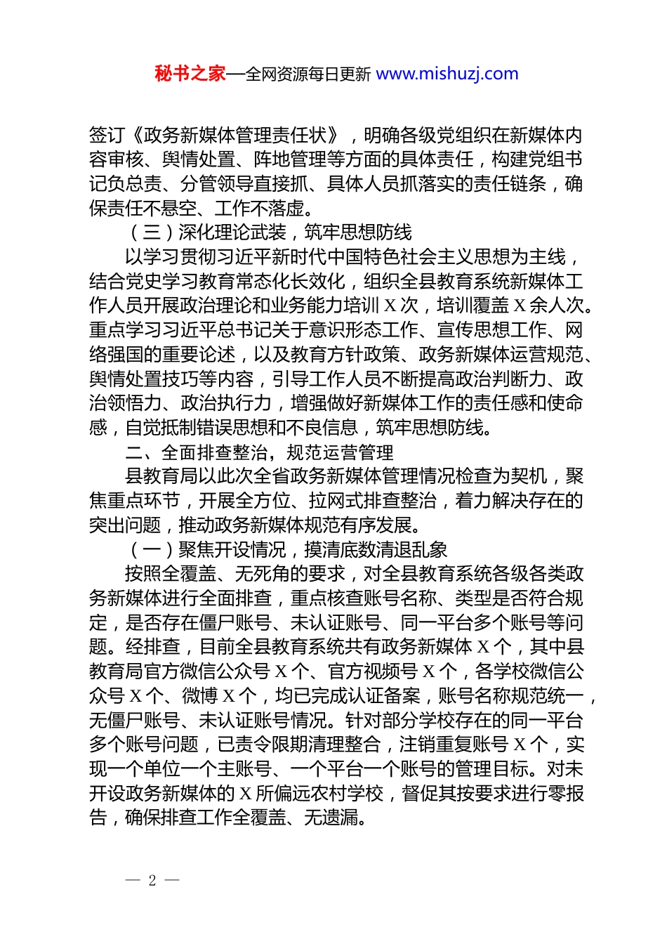 秘书之家—全网资源每日更新 www.mishuzj.com教育系统政务新媒体排查管控工作汇报根据省市政务新媒体管理通知要求,县教育局以党建为引领,紧扣教育系统工作实际,全面开展政务新媒体排查管控工作,着力强化教育宣传阵地建设,牢牢把握意识形态工作领导权,切实提升政务新媒体运营管理质效。一、提高政治站位,夯实管理责任根基教育系统政务新媒体是宣传党的教育方针、发布教育政策回应群众关切、展示教育形象的重要平台,更是意识形态工作的关键阵地。县教育局始终坚持把政务新媒体管理作为党建工作的重要组成部分,以高度的政治自觉扛起管理责任,确保新媒体阵地始终坚持正确政治方向、舆论导向、价值取向。(一)强化党建引领,健全组织体系成立由局党组书记、局长任组长,分管副局长任副组长,各股室负责人、各学校党组织书记为成员的政务新媒体管理工作专班,将新媒体管理工作纳入局党组重要议事日程,与党建工作、教育教学工作同部署、同督导、同落实。建立党组统一领导、办公室牵头协调、各股室分工负责、各学校协同联动的工作机制,明确领导小组办公室设在局办公室,配备 2 名专职人员负责日常运营管理,各学校指定党组织书记主管新媒体工作,配备 1-2 名专职管理员,形成上下贯通、左右协同、责任到岗、任务到人的管理格局。(二)压实政治责任,明确管理要求局党组多次召开专题会议,学习贯彻《国务院办公厅关于推进政务新媒体健康有序发展的意见》《河南省人民政府办公厅关于推进政务新媒体健康有序发展的通知》等文件精神,深入落实意识形态工作责任制,将政务新媒体管理纳入各学校党组织书记抓党建述职评议考核和年度绩效考核重要内容,层层— 1 —秘书之家—全网资源每日更新 www.mishuzj.com签订《政务新媒体管理责任状》,明确各级党组织在新媒体内容审核、舆情处置、阵地管理等方面的具体责任,构建党组书记负总责、分管领导直接抓、具体人员抓落实的责任链条,确保责任不悬空、工作不落虚。(三)深化理论武装,筑牢思想防线以学习贯彻习近平新时代中国特色社会主义思想为主线,结合党史学习教育常态化长效化,组织全县教育系统新媒体工作人员开展政治理论和业务能力培训 X 次,培训覆盖 X 余人次。重点学习习近平总书记关于意识形态工作、宣传思想工作、网络强国的重要论述,以及教育方针政策、政务新媒体运营规范、舆情处置技巧等内容,引导工作人员不断提高政治判断力、政治领悟力、政治执行力,增强做好新媒体工作的责任感和使命感,自觉抵制错误思想和不良信息,筑牢思想防线。二、全面排查整治,规范运营管理县教育局以此次全省政务新媒体管理情况检查为契机,聚焦重点环节,开展全方位、拉网式排查整治,着力解决存在的突出问题,推动政务新媒体规范有序发展。(一)聚焦开设情况,摸清底数清退乱象按照全覆盖、无死角的要求,对全县教育系统各级各类政务新媒体进行全面排查,重点核查账号名称、类型是否符合规定,是否存在僵尸账号、未认证账号、同一平台多个账号等问题。经排查,目前全县教育系统共有政务新媒体 X 个,其中县教育局官方微信公众号 X 个、官方视频号 X 个,各学校微信公众号 X 个、微博 X 个,均已完成认证备案,账号名称规范统一,无僵尸账号、未认证账号情况。针对部分学校存在的同一平台多个账号问题,已责令限期清理整合,注销重复账号 X 个,实现一个单位一个主账号、一个平台一个账号的管理目标。对未开设政务新媒体的 X 所偏远农村学校,督促其按要求进行零报告,确保排查工作全覆盖、无遗漏。— 2 —秘书之家—全网资源每日更新 www.mishuzj.com(二)聚焦监管环节,健全机制强化管控严格落实政务新媒体监管要求,将县教育局官方微信公众号、视频号及各学校政务新媒体全部录入全国政务新媒体信息报送系统和河南省省级政府网站统一技术平台新媒体管理系统,确保录入信息真实、准确、一致。建立账号信息动态更新机制,明确专人负责跟踪账号信息、运行状态变化,及时修改更新管理信息,全年累计更新账号信息 X 条。强化技术监管手段,运用新媒体管理平台对发布内容进行实时监测,设置关键词预警机...