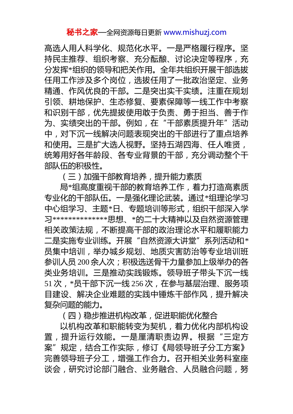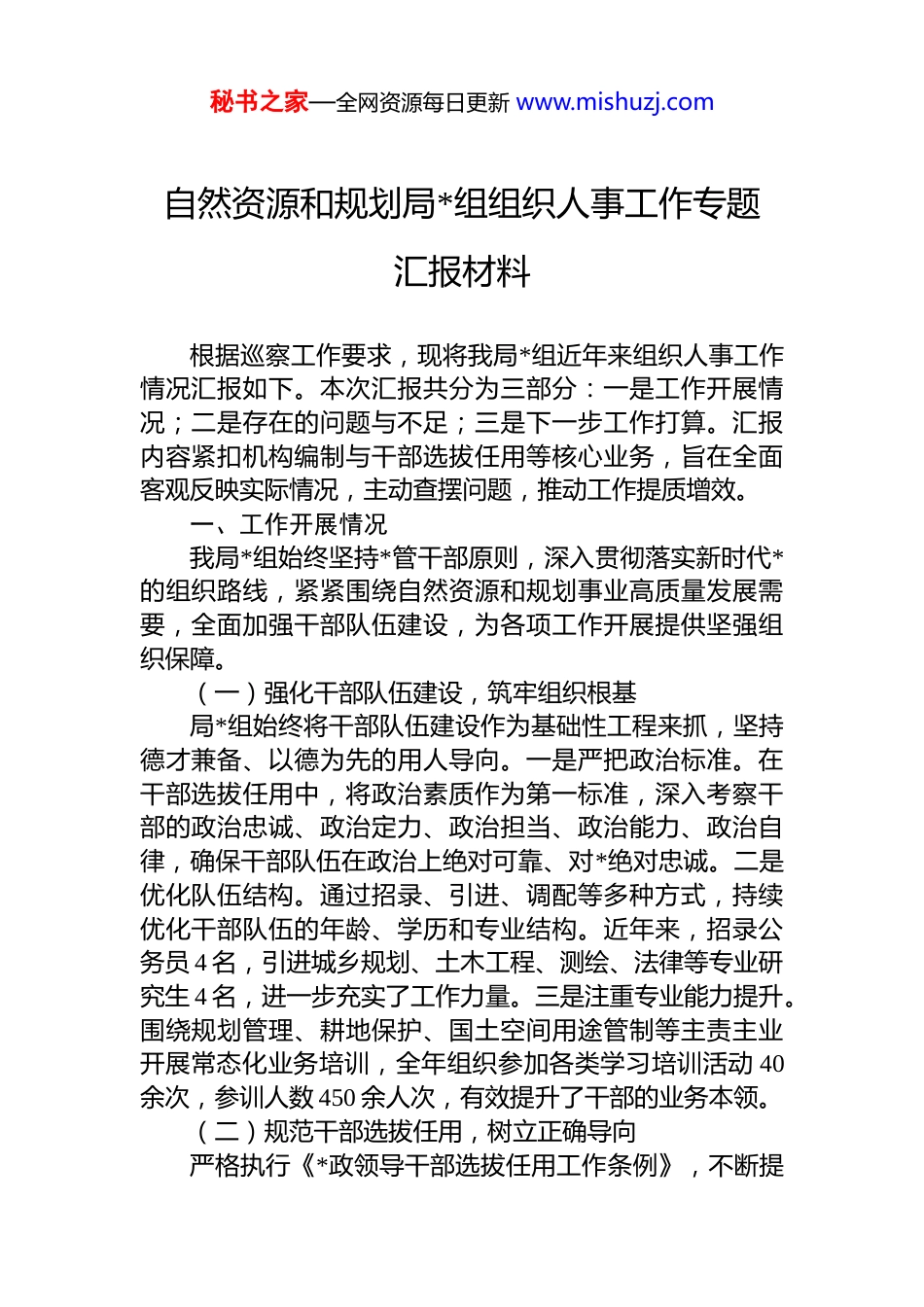 秘书之家—全网资源每日更新 www.mishuzj.com自然资源和规划局*组组织人事工作专题汇报材料根据巡察工作要求,现将我局*组近年来组织人事工作情况汇报如下。本次汇报共分为三部分:一是工作开展情况;二是存在的问题与不足;三是下一步工作打算。汇报内容紧扣机构编制与干部选拔任用等核心业务,旨在全面客观反映实际情况,主动查摆问题,推动工作提质增效。一、工作开展情况我局*组始终坚持*管干部原则,深入贯彻落实新时代*的组织路线,紧紧围绕自然资源和规划事业高质量发展需要,全面加强干部队伍建设,为各项工作开展提供坚强组织保障。(一)强化干部队伍建设,筑牢组织根基局*组始终将干部队伍建设作为基础性工程来抓,坚持德才兼备、以德为先的用人导向。一是严把政治标准。在干部选拔任用中,将政治素质作为第一标准,深入考察干部的政治忠诚、政治定力、政治担当、政治能力、政治自律,确保干部队伍在政治上绝对可靠、对*绝对忠诚。二是优化队伍结构。通过招录、引进、调配等多种方式,持续优化干部队伍的年龄、学历和专业结构。近年来,招录公务员 4 名,引进城乡规划、土木工程、测绘、法律等专业研究生 4 名,进一步充实了工作力量。三是注重专业能力提升。围绕规划管理、耕地保护、国土空间用途管制等主责主业开展常态化业务培训,全年组织参加各类学习培训活动 40余次,参训人数 450 余人次,有效提升了干部的业务本领。(二)规范干部选拔任用,树立正确导向严格执行《*政领导干部选拔任用工作条例》,不断提秘书之家—全网资源每日更新 www.mishuzj.com高选人用人科学化、规范化水平。一是严格履行程序。坚持民主推荐、组织考察、充分酝酿、讨论决定等程序,充分发挥*组织的领导和把关作用。全年共组织开展干部选拔任用工作涉及多个岗位,选拔任用了一批政治坚定、业务精通、作风优良的干部。二是突出实干实绩。注重在规划引领、耕地保护、生态修复、要素保障等一线工作中考察和识别干部,优先提拔使用敢于负责、勇于担当、善于作为、实绩突出的干部。例如,在“干部素质提升年”活动中,对下沉一线解决问题表现突出的干部进行了重点培养和使用。三是扩大选人视野。坚持五湖四海、任人唯贤,统筹用好各年龄段、各专业背景的干部,充分调动整个干部队伍的积极性。(三)加强干部教育培养,提升能力素质局*组高度重视干部的教育培养工作,着力打造高素质专业化的干部队伍。一是强化理论武装。通过*组理论学习中心组学习、主题*日、专题培训等形式,组织干部深入学习**************思想、*的二十大精神以及自然资源管理相关政策法规,不断提高干部的政治理论水平和履职能力二是实施专业训练。开展“自然资源大讲堂”系列活动和*员集中培训,举办城乡规划、地质灾害防治等专业培训班参训人员 200 余人次;积极选送骨干力量参加上级举办的各类业务培训。三是推动实践锻炼。领导班子带头下沉一线51 次,*员干部下沉一线 256 次,在参与基层治理、服务项目建设、解决企业难题的实践中锤炼干部作风,提升解决复杂问题的能力。(四)稳步推进机构改革,促进职能优化整合以机构改革和职能转变为契机,着力优化内部机构设置,提升运行效能。一是厘清职责边界。根据“三定方案”规定,结合工作实际,修订《局领导班子分工方案》完善领导班子分工,增强工作合力。召开相关业务科室座谈会,研究讨论部门融合、业务融合、人员融合问题,努秘书之家—全网资源每日更新 www.mishuzj.com力形成“化学反应”。二是优化资源配置。对内部科室职能进行梳理整合,努力解决职责交叉、分工不清等问题,确保机构设置更加科学,运行更加高效。例如,部分县局对年龄偏大、任职时间较长的科室负责人和基层所长进行了交流调整,并充实基层所工作力量。(五)加强监督管理,严明纪律规矩坚持严管与厚爱相结合,加强对干部的日常监督管理,营造风清气正的政治生态。一是落实全面从严治*责任。局*组认真履行主体责任,定期研究部署*风廉政建设工作,层层签订*风廉政建设责任书,开展廉政谈话,强化压力传导。二是强化日常监督。通过作风督查、廉政风险排查等方式,加强对干部特别是...