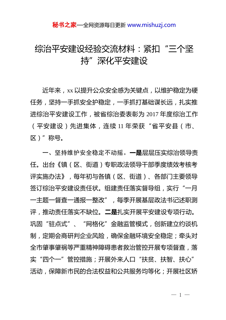 秘书之家—全网资源每日更新 www.mishuzj.com综治平安建设经验交流材料:紧扣“三个坚持”深化平安建设近年来,xx 以提升公众安全感为关键点,以维护稳定为硬任务,坚持一手抓安全护稳定,一手抓打基础谋长远,扎实推进综治平安建设工作,被省综治委表彰为 2017 年度综治工作(平安建设)先进集体,连续 11 年荣获“省平安县(市、区)”称号。一、坚持维护安全稳定不动摇。一是层层压实综治领导责任。出台《镇(区、街道)专职政法领导干部季度绩效考核考评实施办法》,每年初与各镇(区、街道)、各部门主要领导签订综治平安建设责任状。组建责任落实督导组,实行“一月一主题一督查一通报一整改”,每季开展基层政法书记述职测评,推动责任落实不缺位。二是扎实开展平安建设专项行动。巩固“驻点式”、“网格化”金融监管模式,创新建立约谈机制,定期会商研判企业风险,确保金融环境安全稳定;牵头对全市肇事肇祸等严重精神障碍患者救治管控开展专项督查,落实“四个一”管控措施;开展外来人口“扶贫、扶智、扶心”活动,保障新市民的合法权益和公共服务均等化;开展社区矫— 1 —秘书之家—全网资源每日更新 www.mishuzj.com正集中整治活动,社区服刑人员手机定位监控全覆盖;开展“无毒青春·健康生活”禁毒宣传教育系列活动,配齐社工,确保社区戒毒对象回归社会后第一时间有人接、管、帮。三是重点解决治安突出问题。建立行业综治警务调解室,组建专业处警队、纠纷调解队、治安巡逻队、外口管理队、志愿服务队“五彩”勤务队,壮大平安法治志愿者等群防群治力量,超前处置不稳定因素 159 条,抓获盗窃犯罪嫌疑人 4 名。公共安全监管不断强化,推动寄递企业“三个 100%”执行到位,强化《铁路安全常识十一条》宣传教育,化解铁路沿线矛盾纠纷 23件,整改安全隐患 15 处。二、坚持化解矛盾纠纷不松懈。一是探索形成多元化解机制。出台《关于进一步完善矛盾纠纷多元化解机制的实施意见》,举办以“有效化解农村矛盾纠纷”为主题的村(社区)书记大讲坛。创新“4+n”交通事故处理模式,全面建成公安派出所、基层人民法庭人民调解工作室,采用“四集中”管理模式提高矛盾纠纷化解效率。在市法学会、律师协会等设立法律诊所 22 家,对重大复杂纠纷进行及时会诊。二是健全完善分析研判机制。坚持市、镇矛盾纠纷日报告、周分析、月研判制度,定期编制《平安指数蓝黄红三色预警表》。健全镇村调委会-调— 2 —秘书之家—全网资源每日更新 www.mishuzj.com解小组-信息员三级调处网络,建立 500 户以上居民小区人民调解工作室 14 家,先后排查受理调处矛盾纠纷 4620 件,调处成功率达 99.5%。三是严格落实领导包案机制。严格落实市、镇、部门领导干部接访下访包案化解信访突出问题“五包”责任(包掌握情况、包解决问题、包教育稳控、包依法处置、包停诉息访),实现突出信访事项领导包案全覆盖。今年以来,该市未发生群众进京集访,进京集访量下降 100%;赴省上访同比下降 63.57%。国家信访局交办“四大重点”攻坚战事项 7 件,化解 5 件,化解率 71.43%。三、坚持夯实基层基础不止步。一是建强三级综治中心。投入 2000 余万元建成近 4800 平方米的省一级市级综治中心,综治办整体进驻并牵头组织工作,信访、矛盾调处中心等 10 部门 80 余人入驻实体化办公。11 个镇(区、街道)通过一级认定,84%村(社区)建设达标。综治信息系统应用实时化,纵向贯通 14 个镇(区、街道)、347 个村(社区)和驻镇相关部门,横向覆盖 47 个综治成员单位。在三级综治中心设立便民服务大厅,实行“前台受理、后台交办、及时处理、跟踪反馈”的服务机制,形成了“四个一”运行模式。二是创新基层治理模式。探索形成“三活”“四清”“五必报”网格化基层社会治理新— 3 —秘书之家—全网资源每日更新 www.mishuzj.com模式。以民生为导向,创新建立以法治约束人、以自治规范人、以德治引导人的多元综治新模式。如城街道新民社区建立“社情民意工作室”,重大决策、重大项目、重大投入听取居民代表的意见。xx 镇文峰社区创建“相邻工作室”,社...
