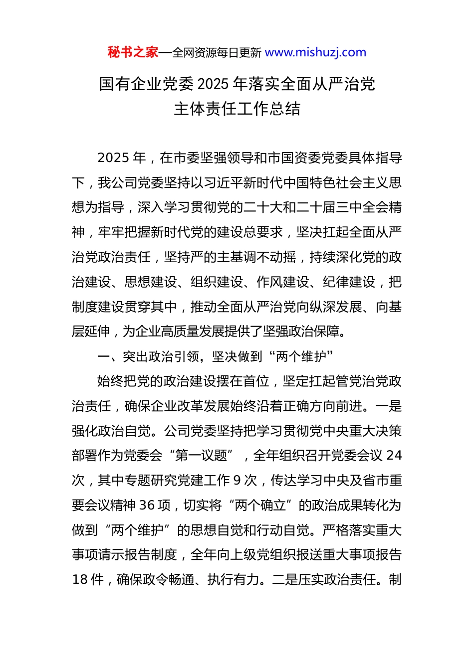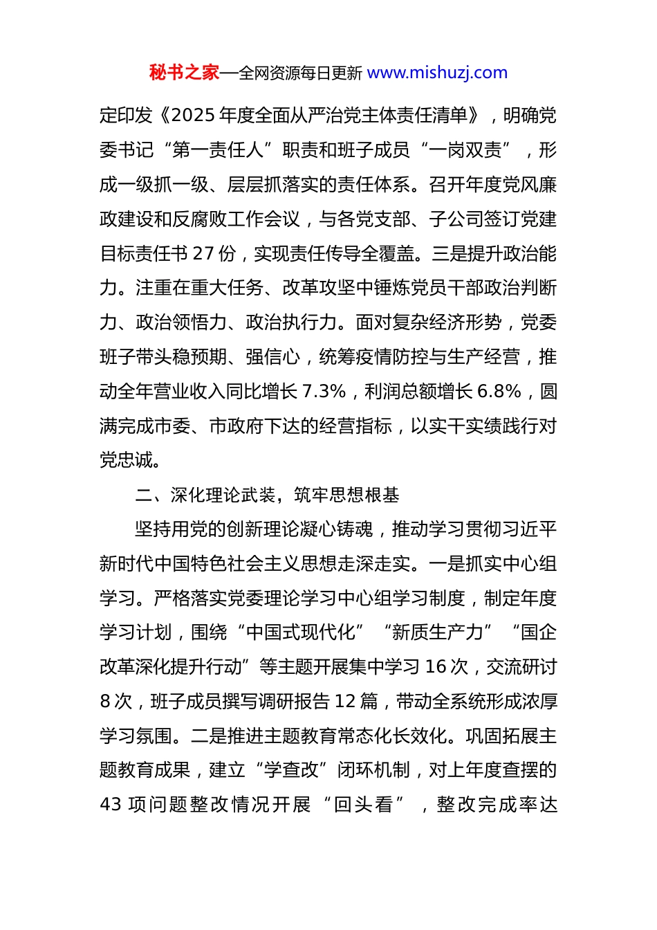秘书之家—全网资源每日更新 www.mishuzj.com国有企业党委 2025 年落实全面从严治党主体责任工作总结 2025 年,在市委坚强领导和市国资委党委具体指导下,我公司党委坚持以习近平新时代中国特色社会主义思想为指导,深入学习贯彻党的二十大和二十届三中全会精神,牢牢把握新时代党的建设总要求,坚决扛起全面从严治党政治责任,坚持严的主基调不动摇,持续深化党的政治建设、思想建设、组织建设、作风建设、纪律建设,把制度建设贯穿其中,推动全面从严治党向纵深发展、向基层延伸,为企业高质量发展提供了坚强政治保障。一、突出政治引领,坚决做到“两个维护”始终把党的政治建设摆在首位,坚定扛起管党治党政治责任,确保企业改革发展始终沿着正确方向前进。一是强化政治自觉。公司党委坚持把学习贯彻党中央重大决策部署作为党委会“第一议题”,全年组织召开党委会议 24次,其中专题研究党建工作 9 次,传达学习中央及省市重要会议精神 36 项,切实将“两个确立”的政治成果转化为做到“两个维护”的思想自觉和行动自觉。严格落实重大事项请示报告制度,全年向上级党组织报送重大事项报告18 件,确保政令畅通、执行有力。二是压实政治责任。制秘书之家—全网资源每日更新 www.mishuzj.com定印发《2025 年度全面从严治党主体责任清单》,明确党委书记“第一责任人”职责和班子成员“一岗双责”,形成一级抓一级、层层抓落实的责任体系。召开年度党风廉政建设和反腐败工作会议,与各党支部、子公司签订党建目标责任书 27 份,实现责任传导全覆盖。三是提升政治能力。注重在重大任务、改革攻坚中锤炼党员干部政治判断力、政治领悟力、政治执行力。面对复杂经济形势,党委班子带头稳预期、强信心,统筹疫情防控与生产经营,推动全年营业收入同比增长 7.3%,利润总额增长 6.8%,圆满完成市委、市政府下达的经营指标,以实干实绩践行对党忠诚。二、深化理论武装,筑牢思想根基坚持用党的创新理论凝心铸魂,推动学习贯彻习近平新时代中国特色社会主义思想走深走实。一是抓实中心组学习。严格落实党委理论学习中心组学习制度,制定年度学习计划,围绕“中国式现代化”“新质生产力”“国企改革深化提升行动”等主题开展集中学习 16 次,交流研讨8 次,班子成员撰写调研报告 12 篇,带动全系统形成浓厚学习氛围。二是推进主题教育常态化长效化。巩固拓展主题教育成果,建立“学查改”闭环机制,对上年度查摆的43 项 问 题 整 改 情 况 开 展 “ 回 头 看 ” , 整 改 完 成 率 达秘书之家—全网资源每日更新 www.mishuzj.com100%。组织开展“重温入党誓词、重忆初心使命”主题党日活动,覆盖党员 1200 余人次,进一步增强身份意识和责任意识。三是加强宣传思想工作。依托企业内刊、微信公众号、宣传栏等阵地,开设“党建引领·奋进有我”专栏,刊发先进典型事迹 48 期,讲好身边人、身边事。组织“劳模宣讲团”进车间、进班组开展巡回宣讲 15 场,受众超2000 人次,激发广大职工爱岗敬业、争先创优的热情。特别是在重点项目建设一线,设立“党员先锋岗”“红旗责任区”62 个,让党旗在攻坚前沿高高飘扬。三、夯实基层基础,建强战斗堡垒牢固树立大抓基层鲜明导向,持续推进党支部标准化规范化建设,不断增强党组织政治功能和组织功能。一是优化组织设置。根据企业重组整合实际,及时调整基层党组织架构,新成立党支部 5 个,撤销合并 3 个,选优配强支部书记 18 名,其中具有中级以上职称或管理经验的占比达 85%。严格落实“三会一课”、组织生活会、民主评议党员等制度,全年开展主题党日活动 286 次,党员参与率保持在 95%以上。二是强化队伍建设。举办党务干部专题培训班 3 期,培训基层党务工作者 156 人次,提升履职能力。严格党员发展程序,全年新发展党员 32 名,其中生产一线和技术骨干占比达 78%,党员队伍结构持续优化。建秘书之家—全网资源每日更新 www.mishuzj.com立困难党员帮扶机制,走访慰问老党员、困难党员 47 人次,发放慰问金 12.6 万元,传递组织温暖。三是推动党建与业务深度融合。实...