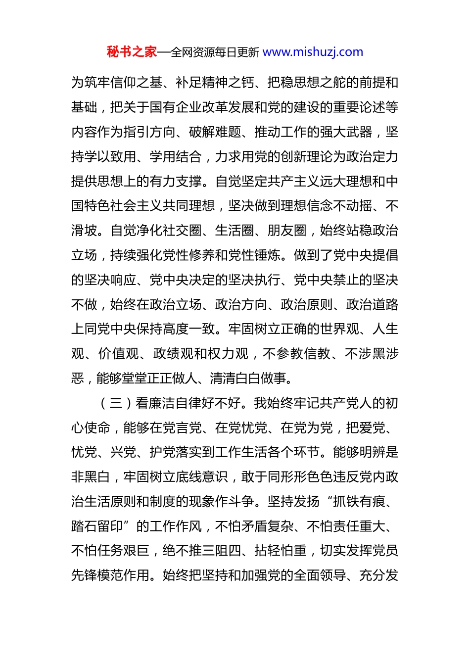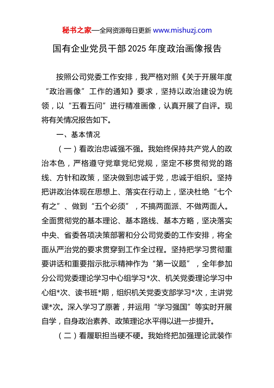 秘书之家—全网资源每日更新 www.mishuzj.com国有企业党员干部 2025 年度政治画像报告 按照公司党委工作安排,我严格对照《关于开展年度“政治画像”工作的通知》要求,坚持以政治建设为统领,以“五看五问”进行精准画像,认真开展了自评。现将有关情况报告如下。一、基本情况(一)看政治忠诚强不强。我始终保持共产党人的政治本色,严格遵守党章党纪党规,坚定不移贯彻党的路线、方针和政策,坚决做到忠诚于党,忠诚于组织。坚持把讲政治体现在思想上、落实在行动上,坚决杜绝“七个有之”、做到“五个必须”,不搞两面派、不做两面人。全面贯彻党的基本理论、基本路线、基本方略,坚决落实中央、省委各项决策部署和分公司党委的工作安排,将全面从严治党的要求贯穿到工作全过程。坚持把学习贯彻重要讲话和重要指示批示精神作为“第一议题”,全年参加分公司党委理论学习中心组学习*次、机关党委理论学习中心组*次、读书班*期,组织机关党委支部学习*次,主讲党课*次。深入学习了原著,并运用“学习强国”等实时开展自学,自身政治素养、政策理论水平得以进一步提升。(二)看履职担当硬不硬。我始终把加强理论武装作秘书之家—全网资源每日更新 www.mishuzj.com为筑牢信仰之基、补足精神之钙、把稳思想之舵的前提和基础,把关于国有企业改革发展和党的建设的重要论述等内容作为指引方向、破解难题、推动工作的强大武器,坚持学以致用、学用结合,力求用党的创新理论为政治定力提供思想上的有力支撑。自觉坚定共产主义远大理想和中国特色社会主义共同理想,坚决做到理想信念不动摇、不滑坡。自觉净化社交圈、生活圈、朋友圈,始终站稳政治立场,持续强化党性修养和党性锤炼。做到了党中央提倡的坚决响应、党中央决定的坚决执行、党中央禁止的坚决不做,始终在政治立场、政治方向、政治原则、政治道路上同党中央保持高度一致。牢固树立正确的世界观、人生观、价值观、政绩观和权力观,不参教信教、不涉黑涉恶,能够堂堂正正做人、清清白白做事。(三)看廉洁自律好不好。我始终牢记共产党人的初心使命,能够在党言党、在党忧党、在党为党,把爱党、忧党、兴党、护党落实到工作生活各个环节。能够明辨是非黑白,牢固树立底线意识,敢于同形形色色违反党内政治生活原则和制度的现象作斗争。坚持发扬“抓铁有痕、踏石留印”的工作作风,不怕矛盾复杂、不怕责任重大、不怕任务艰巨,绝不推三阻四、拈轻怕重,切实发挥党员先锋模范作用。始终把坚持和加强党的全面领导、充分发秘书之家—全网资源每日更新 www.mishuzj.com挥党组织的政治功能,作为履职尽责的出发点和落脚点。面对疫情冲击、党建理论创新、基层基础薄弱等重大挑战,我时刻对标、党中央和省委、分公司党委部署要求,牵头起草制定分公司党委会议事规则、全面从严治党主体责任清单、党务公开实施办法等十几项制度办法,着力推动和发挥分公司两级党组织党建独特优势,助力分公司实现全年经营目标。在落实意识形态工作责任制方面,从管好部门群开始,随时强调、定期检查,全年未发生任何与意识形态有关的问题。(四)看工作作风正不正。作为分公司机关党委负责人,我养成了凡事都站在分公司党委角度,从政治站位和政治立场去思考、定位、布局的习惯,能够正确处理局部与全部、个人与整体、当前与长远的利益关系。能够坚持用立场、观点、方法谋划推进基层党建工作。坚持以身作则、以身示范,积极参加机关党委民主生活会和机关党委党支部的组织生活会。能够带头严肃开展批评和自我批评,做到了在会上知无不言言无不尽,充分发表意见;在会后坚决贯彻执行,狠抓落实,全力营造风清气正的良好政治生态,不存在作风霸道、独断专行等问题。(五)看党内生活严不严。能够长期坚持把严守政治纪律和政治规矩作为践行“两个维护”的首要任务,作为秘书之家—全网资源每日更新 www.mishuzj.com工作生活的准绳和标尺,坚决维护政治纪律的严肃性和权威性。自觉树牢底线思维,严守党的“六大纪律”,始终敬畏纪律,心悬明镜、手握戒尺,在任何时候任何情况下,都能够做到不越雷池半步。带头增强政治自制力,时刻对照党章党规党纪、...