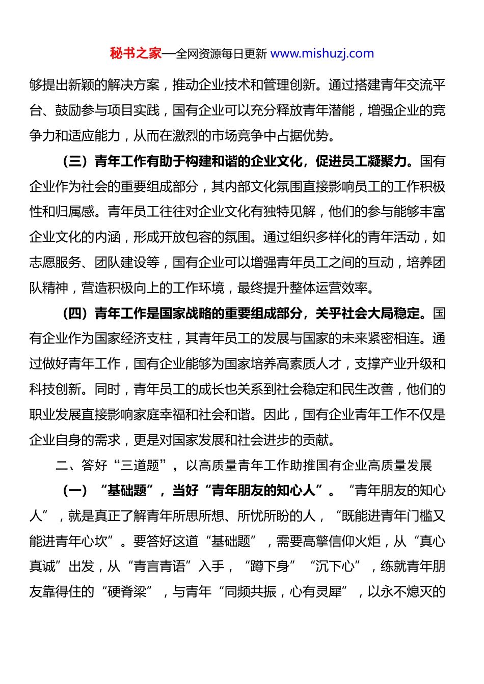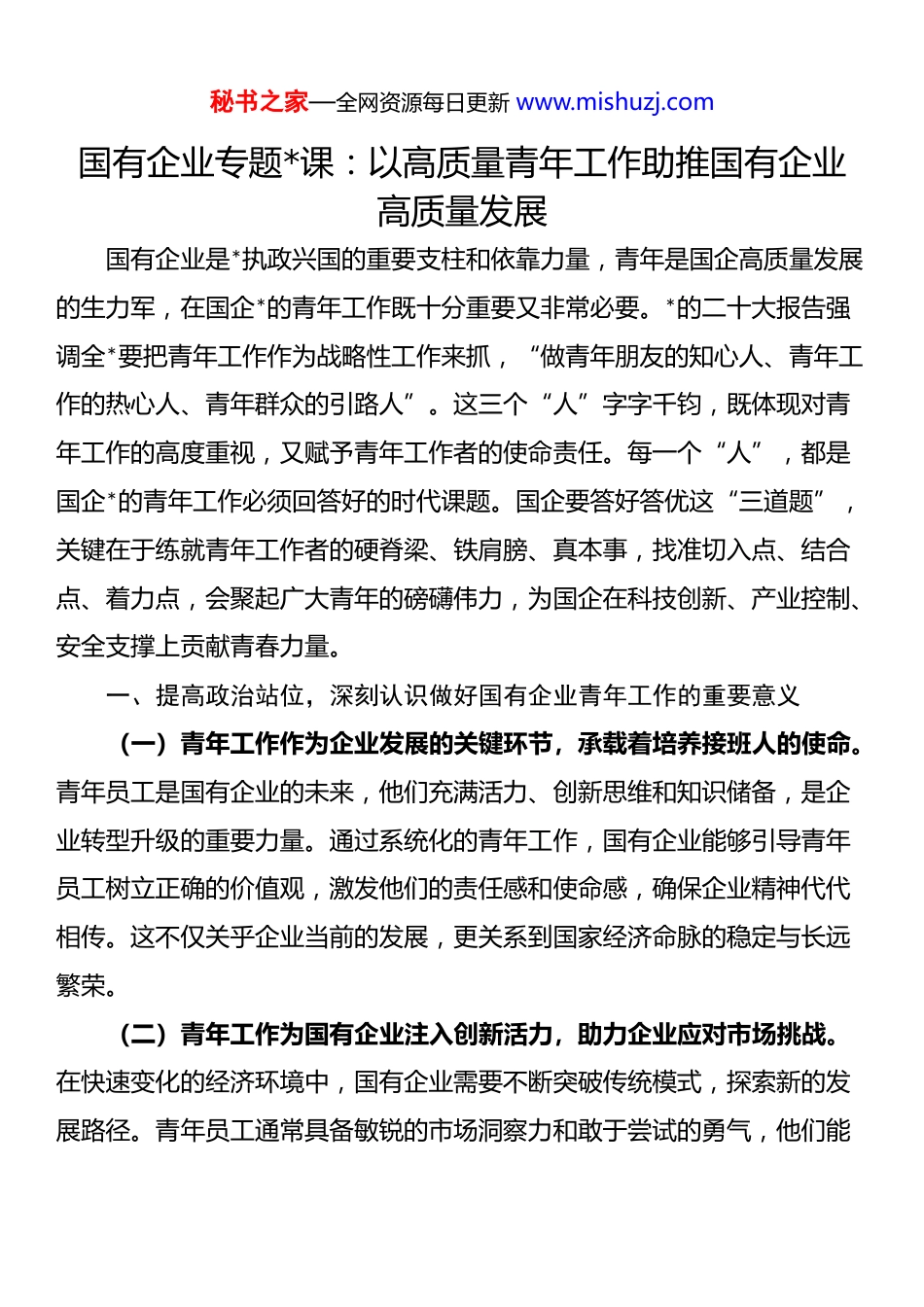秘书之家—全网资源每日更新 www.mishuzj.com国有企业专题*课:以高质量青年工作助推国有企业高质量发展国有企业是*执政兴国的重要支柱和依靠力量,青年是国企高质量发展的生力军,在国企*的青年工作既十分重要又非常必要。*的二十大报告强调全*要把青年工作作为战略性工作来抓,“做青年朋友的知心人、青年工作的热心人、青年群众的引路人”。这三个“人”字字千钧,既体现对青年工作的高度重视,又赋予青年工作者的使命责任。每一个“人”,都是国企*的青年工作必须回答好的时代课题。国企要答好答优这“三道题”,关键在于练就青年工作者的硬脊梁、铁肩膀、真本事,找准切入点、结合点、着力点,会聚起广大青年的磅礴伟力,为国企在科技创新、产业控制、安全支撑上贡献青春力量。一、提高政治站位,深刻认识做好国有企业青年工作的重要意义(一)青年工作作为企业发展的关键环节,承载着培养接班人的使命。青年员工是国有企业的未来,他们充满活力、创新思维和知识储备,是企业转型升级的重要力量。通过系统化的青年工作,国有企业能够引导青年员工树立正确的价值观,激发他们的责任感和使命感,确保企业精神代代相传。这不仅关乎企业当前的发展,更关系到国家经济命脉的稳定与长远繁荣。(二)青年工作为国有企业注入创新活力,助力企业应对市场挑战。在快速变化的经济环境中,国有企业需要不断突破传统模式,探索新的发展路径。青年员工通常具备敏锐的市场洞察力和敢于尝试的勇气,他们能秘书之家—全网资源每日更新 www.mishuzj.com够提出新颖的解决方案,推动企业技术和管理创新。通过搭建青年交流平台、鼓励参与项目实践,国有企业可以充分释放青年潜能,增强企业的竞争力和适应能力,从而在激烈的市场竞争中占据优势。(三)青年工作有助于构建和谐的企业文化,促进员工凝聚力。国有企业作为社会的重要组成部分,其内部文化氛围直接影响员工的工作积极性和归属感。青年员工往往对企业文化有独特见解,他们的参与能够丰富企业文化的内涵,形成开放包容的氛围。通过组织多样化的青年活动,如志愿服务、团队建设等,国有企业可以增强青年员工之间的互动,培养团队精神,营造积极向上的工作环境,最终提升整体运营效率。(四)青年工作是国家战略的重要组成部分,关乎社会大局稳定。国有企业作为国家经济支柱,其青年员工的发展与国家的未来紧密相连。通过做好青年工作,国有企业能够为国家培养高素质人才,支撑产业升级和科技创新。同时,青年员工的成长也关系到社会稳定和民生改善,他们的职业发展直接影响家庭幸福和社会和谐。因此,国有企业青年工作不仅是企业自身的需求,更是对国家发展和社会进步的贡献。二、答好“三道题”,以高质量青年工作助推国有企业高质量发展(一)“基础题”,当好“青年朋友的知心人”。“青年朋友的知心人”,就是真正了解青年所思所想、所忧所盼的人,“既能进青年门槛又能进青年心坎”。要答好这道“基础题”,需要高擎信仰火炬,从“真心真诚”出发,从“青言青语”入手,“蹲下身”“沉下心”,练就青年朋友靠得住的“硬脊梁”,与青年“同频共振,心有灵犀”,以永不熄灭的秘书之家—全网资源每日更新 www.mishuzj.com火热心态和永不懈怠的新境界,撸起袖子加油干,在国企高质量发展中实现人生价值。一是既要了解青年,又要理解青年。酒逢知己千杯少,话不投机半句多。只有能与青年接上话、谈得来、有默契,才能与青年聊到一起、说到一块、打成一片。只有被认为信得过、靠得住、能托付,青年才愿意讲心里话、真心话、悄悄话。只有充分了解青年所思所想所盼,才能既把青年的温度如实报告*,又把*的温暖充分传递给青年。既要做青年的“心灵大树洞”,又要做青年的“心灵充电宝”。工作中,在开展“交心交友”“谈心谈话”等活动时,要谨记“兼听则明,偏听则暗”,既要倾听青年顺耳话又要记下青年逆耳言,既要“原原本本,原汁原味”记又要“听话听声,锣鼓听音”辨,意会“言外之意”、听懂“弦外之音”、明白“话中有话”,真正把广大青年的思想脉搏摸清。二是既要身入青年,又要心入青年。情与青年越亲,心距青年越近。要和青年“...