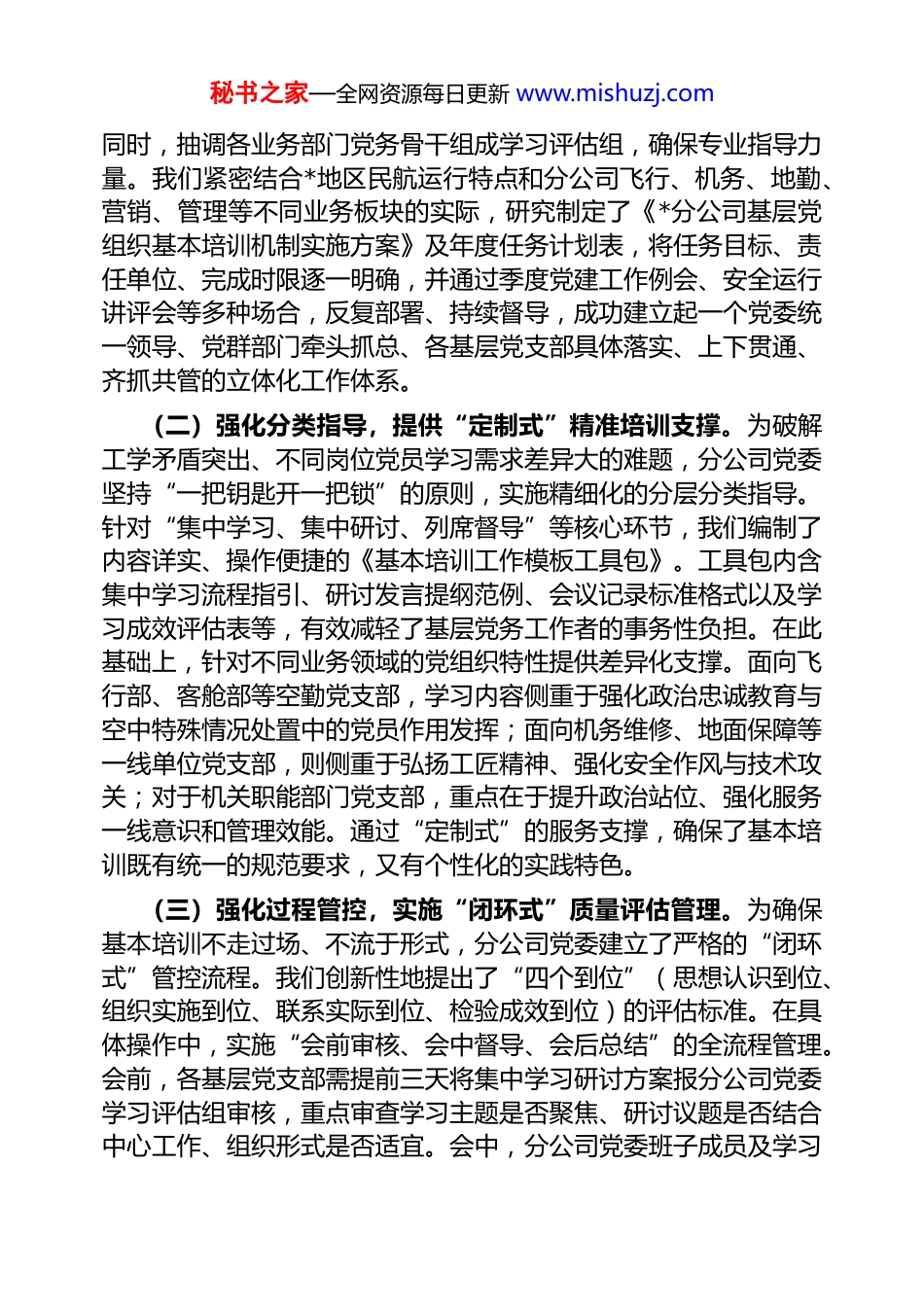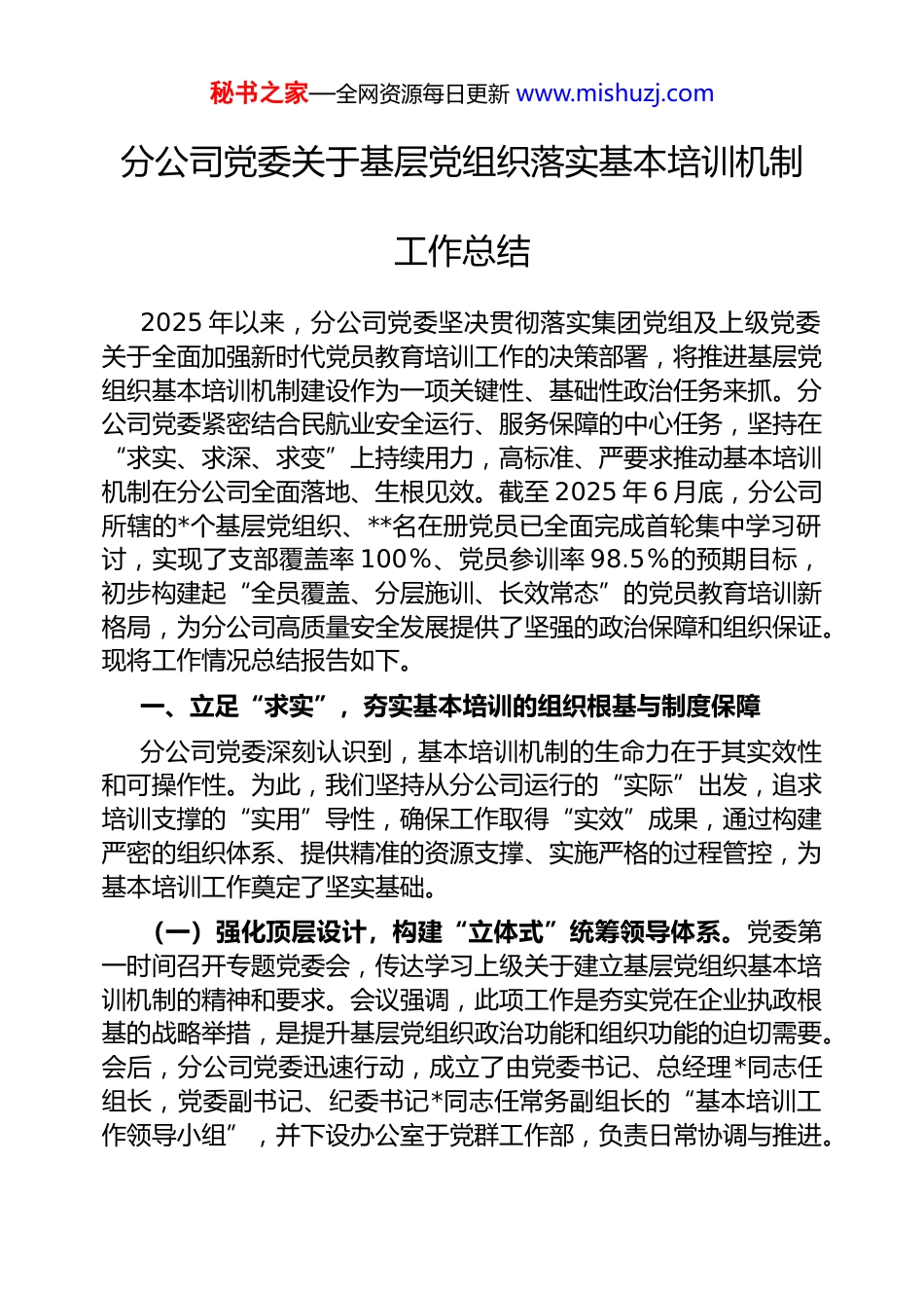 秘书之家—全网资源每日更新 www.mishuzj.com分公司党委关于基层党组织落实基本培训机制工作总结2025 年以来,分公司党委坚决贯彻落实集团党组及上级党委关于全面加强新时代党员教育培训工作的决策部署,将推进基层党组织基本培训机制建设作为一项关键性、基础性政治任务来抓。分公司党委紧密结合民航业安全运行、服务保障的中心任务,坚持在“求实、求深、求变”上持续用力,高标准、严要求推动基本培训机制在分公司全面落地、生根见效。截至 2025 年 6 月底,分公司所辖的*个基层党组织、**名在册党员已全面完成首轮集中学习研讨,实现了支部覆盖率 100%、党员参训率 98.5%的预期目标,初步构建起“全员覆盖、分层施训、长效常态”的党员教育培训新格局,为分公司高质量安全发展提供了坚强的政治保障和组织保证。现将工作情况总结报告如下。一、立足“求实”,夯实基本培训的组织根基与制度保障分公司党委深刻认识到,基本培训机制的生命力在于其实效性和可操作性。为此,我们坚持从分公司运行的“实际”出发,追求培训支撑的“实用”导性,确保工作取得“实效”成果,通过构建严密的组织体系、提供精准的资源支撑、实施严格的过程管控,为基本培训工作奠定了坚实基础。(一)强化顶层设计,构建“立体式”统筹领导体系。党委第一时间召开专题党委会,传达学习上级关于建立基层党组织基本培训机制的精神和要求。会议强调,此项工作是夯实党在企业执政根基的战略举措,是提升基层党组织政治功能和组织功能的迫切需要。会后,分公司党委迅速行动,成立了由党委书记、总经理*同志任组长,党委副书记、纪委书记*同志任常务副组长的“基本培训工作领导小组”,并下设办公室于党群工作部,负责日常协调与推进。秘书之家—全网资源每日更新 www.mishuzj.com同时,抽调各业务部门党务骨干组成学习评估组,确保专业指导力量。我们紧密结合*地区民航运行特点和分公司飞行、机务、地勤、营销、管理等不同业务板块的实际,研究制定了《*分公司基层党组织基本培训机制实施方案》及年度任务计划表,将任务目标、责任单位、完成时限逐一明确,并通过季度党建工作例会、安全运行讲评会等多种场合,反复部署、持续督导,成功建立起一个党委统一领导、党群部门牵头抓总、各基层党支部具体落实、上下贯通、齐抓共管的立体化工作体系。(二)强化分类指导,提供“定制式”精准培训支撑。为破解工学矛盾突出、不同岗位党员学习需求差异大的难题,分公司党委坚持“一把钥匙开一把锁”的原则,实施精细化的分层分类指导。针对“集中学习、集中研讨、列席督导”等核心环节,我们编制了内容详实、操作便捷的《基本培训工作模板工具包》。工具包内含集中学习流程指引、研讨发言提纲范例、会议记录标准格式以及学习成效评估表等,有效减轻了基层党务工作者的事务性负担。在此基础上,针对不同业务领域的党组织特性提供差异化支撑。面向飞行部、客舱部等空勤党支部,学习内容侧重于强化政治忠诚教育与空中特殊情况处置中的党员作用发挥;面向机务维修、地面保障等一线单位党支部,则侧重于弘扬工匠精神、强化安全作风与技术攻关;对于机关职能部门党支部,重点在于提升政治站位、强化服务一线意识和管理效能。通过“定制式”的服务支撑,确保了基本培训既有统一的规范要求,又有个性化的实践特色。(三)强化过程管控,实施“闭环式”质量评估管理。为确保基本培训不走过场、不流于形式,分公司党委建立了严格的“闭环式”管控流程。我们创新性地提出了“四个到位”(思想认识到位、组织实施到位、联系实际到位、检验成效到位)的评估标准。在具体操作中,实施“会前审核、会中督导、会后总结”的全流程管理。会前,各基层党支部需提前三天将集中学习研讨方案报分公司党委学习评估组审核,重点审查学习主题是否聚焦、研讨议题是否结合中心工作、组织形式是否适宜。会中,分公司党委班子成员及学习秘书之家—全网资源每日更新 www.mishuzj.com评估组成员按照分工,全年计划列席督导基层党支部集中学习研讨不少于 50 场次。上半年已完成 28 场次的列席督导,覆盖了所有二级单位党组织,现场对学...