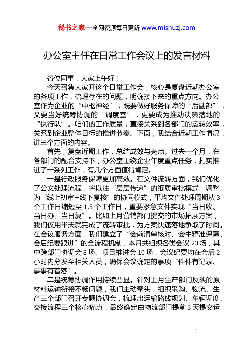秘书之家—全网资源每日更新 www.mishuzj.com办公室主任在日常工作会议上的发言材料各位同事,大家上午好!今天召集大家开这个日常工作会,核心是复盘近期办公室的各项工作,梳理存在的问题,明确接下来的重点方向。办公室作为企业的“中枢神经”,既要做好服务保障的“后勤部”,又要当好统筹协调的“调度室”,更要成为推动决策落地的“执行队”。咱们的工作质量,直接关系到各部门的运转效率,关系到企业整体目标的推进节奏。下面,我结合近期工作情况,讲三个方面的内容。首先,复盘近期工作,总结成效与亮点。过去一个月,在各部门的配合支持下,办公室围绕企业年度重点任务,扎实推进了一系列工作,有几个方面值得肯定。一是行政服务保障更加高效。在文件流转方面,我们优化了公文处理流程,将以往“层层传递”的纸质审批模式,调整为“线上初审+线下复核”的协同模式,平均文件处理周期从 3个工作日缩短至 1.5 个工作日,重要紧急文件实现“当日收、当日办、当日复”。比如上月营销部门提交的市场拓展方案,我们仅用半天就完成了流转审批,为方案快速落地争取了时间。在会议服务方面,我们建立了“会前清单核对、会中精准保障、会后纪要跟进”的全流程机制,本月共组织各类会议 23 场,其中跨部门协调会 8 场、项目推进会 10 场,会议纪要均在会后 2小时内分发至相关人员,确保会议确定的事项“件件有记录、事事有着落”。二是统筹协调作用持续凸显。针对上月生产部门反映的原材料运输衔接不畅问题,我们主动牵头,组织采购、物流、生产三个部门召开专题协调会,梳理出运输路线规划、车辆调度、交接流程三个核心痛点,最终确定由物流部门提前 3 天提交运— 1 —秘书之家—全网资源每日更新 www.mishuzj.com输计划,办公室同步协调各环节衔接,目前原材料按时到货率从 82%提升至 95%,有效保障了生产进度。在跨部门项目协作中,我们建立了“项目台账+定期督办”机制,对今年重点推进的智能生产线升级项目,每周收集各参与部门的进展情况,及时协调解决设备采购与场地改造不同步的问题,目前项目已完成总进度的 40%,符合既定时间节点要求。三是后勤保障服务不断优化。员工关怀方面,我们收集了各部门对食堂的意见建议,调整了菜品结构,增加了杂粮主食和特色窗口,推出“每周菜品投票”活动,食堂满意度调查评分从 78 分提升至 89 分;针对部分员工反映的通勤不便问题,我们优化了班车路线,新增 2 个停靠点,覆盖了更多员工的居住区域,班车上座率提升了 30%。办公保障方面,我们完成了2 号办公楼的设备检修,更换老化空调 12 台、办公电脑 8 台,对会议室的投影、音响设备进行了升级,确保办公环境稳定舒适;同时规范了办公用品采购与发放流程,实行“按需申领、季度盘点”,有效降低了耗材浪费,本月办公用品支出较上月减少 12%。四是督办落实工作扎实推进。围绕企业季度工作会议确定的 18 项重点任务,我们逐一分解责任部门、明确完成时限,建立了“周提醒、月通报”的督办机制。通过实地走访、电话跟进等方式,对任务推进情况进行全程跟踪,目前已有 10 项任务按计划完成,6 项任务稳步推进,2 项进度滞后的任务,我们已与责任部门沟通,分析了滞后原因并调整了推进方案,确保季度目标顺利达成。在肯定成绩的同时,我们更要清醒地看到工作中存在的问题和不足。结合近期的工作反馈和自查情况,主要有以下几个突出问题。第一,流程衔接存在“中梗阻”。部分跨部门工作中,存在“边界模糊、责任推诿”的情况。比如上月行政采购的办公— 2 —秘书之家—全网资源每日更新 www.mishuzj.com家具,因未提前与后勤部门明确安装时间,导致家具到货后闲置 3 天才能安排安装,影响了新入职员工的办公使用。还有部分文件流转中,个别部门存在“压件”现象,明明是本部门职责范围内的审批,却拖延办理,导致整体流程滞后。这说明我们的流程梳理还不够细致,部门间的权责划分还不够清晰,协调联动的效率有待提升。第二,服务保障存在“温差感”。虽然我们做了不少后勤保障工作,但仍有部分员工反映“需求响应不及时”。比如有员工反映办公...