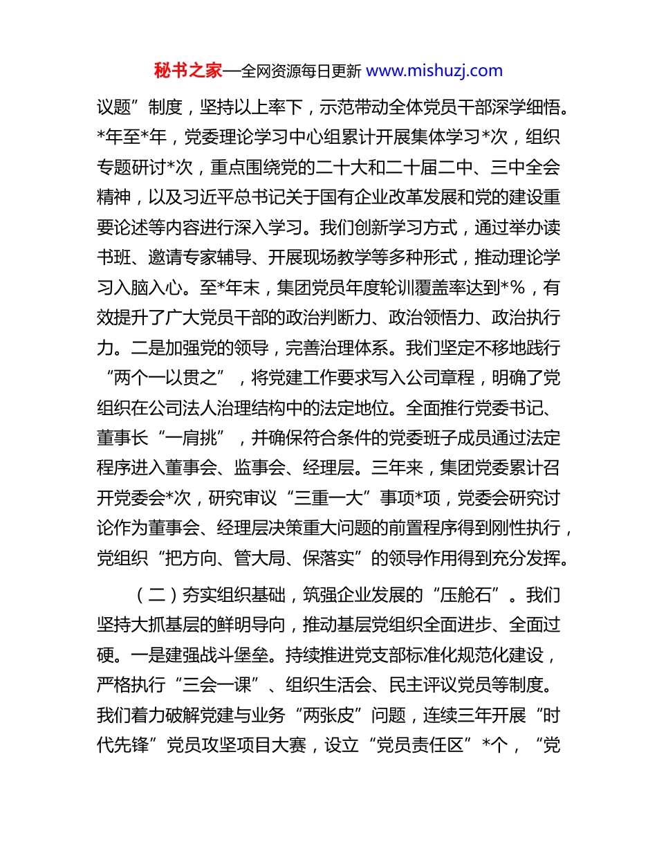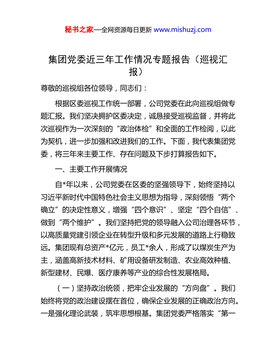 秘书之家—全网资源每日更新 www.mishuzj.com集团党委近三年工作情况专题报告(巡视汇报)尊敬的巡视组各位领导,同志们:根据区委巡视工作统一部署,公司党委在此向巡视组做专题汇报。我们坚决拥护区委决定,诚恳接受巡视监督,并将此次巡视作为一次深刻的“政治体检”和全面的工作检阅,以此为契机,进一步加强和改进我们的工作。下面,我代表集团党委,将三年来主要工作、存在问题及下步打算报告如下。一、主要工作开展情况自*年以来,公司党委在区委的坚强领导下,始终坚持以习近平新时代中国特色社会主义思想为指导,深刻领悟“两个确立”的决定性意义,增强“四个意识”、坚定“四个自信”、做到“两个维护”。我们坚持把党的领导融入公司治理各环节,以高质量党建引领企业在转型升级和多元发展的道路上行稳致远。集团现有总资产*亿元,员工*余人,形成了以煤炭生产为主,涵盖高新技术材料、矿用设备研发制造、农业高效种植、新型建材、民爆、医疗康养等产业的综合性发展格局。(一)坚持政治统领,把牢企业发展的“方向盘”。我们始终将党的政治建设摆在首位,确保企业发展的正确政治方向。一是强化理论武装,筑牢思想根基。集团党委严格落实“第一秘书之家—全网资源每日更新 www.mishuzj.com议题”制度,坚持以上率下,示范带动全体党员干部深学细悟。*年至*年,党委理论学习中心组累计开展集体学习*次,组织专题研讨*次,重点围绕党的二十大和二十届二中、三中全会精神,以及习近平总书记关于国有企业改革发展和党的建设重要论述等内容进行深入学习。我们创新学习方式,通过举办读书班、邀请专家辅导、开展现场教学等多种形式,推动理论学习入脑入心。至*年末,集团党员年度轮训覆盖率达到*%,有效提升了广大党员干部的政治判断力、政治领悟力、政治执行力。二是加强党的领导,完善治理体系。我们坚定不移地践行“两个一以贯之”,将党建工作要求写入公司章程,明确了党组织在公司法人治理结构中的法定地位。全面推行党委书记、董事长“一肩挑”,并确保符合条件的党委班子成员通过法定程序进入董事会、监事会、经理层。三年来,集团党委累计召开党委会*次,研究审议“三重一大”事项*项,党委会研究讨论作为董事会、经理层决策重大问题的前置程序得到刚性执行,党组织“把方向、管大局、保落实”的领导作用得到充分发挥。(二)夯实组织基础,筑强企业发展的“压舱石”。我们坚持大抓基层的鲜明导向,推动基层党组织全面进步、全面过硬。一是建强战斗堡垒。持续推进党支部标准化规范化建设,严格执行“三会一课”、组织生活会、民主评议党员等制度。我们着力破解党建与业务“两张皮”问题,连续三年开展“时代先锋”党员攻坚项目大赛,设立“党员责任区”*个,“党秘书之家—全网资源每日更新 www.mishuzj.com员先锋岗”*个。在*煤矿智能化工作面建设、新材料公司技术攻关等急难险重任务中,党员干部冲锋在前,先后有*个基层党组织、*余名党员因此受到集团及以上表彰,党组织的战斗堡垒作用和党员的先锋模范作用在生产经营一线熠熠生辉。二是锻造过硬队伍。坚持党管干部、党管人才原则,树立重实干、重实绩、重担当的选人用人导向。近三年来,我们选拔任用中层干部*人,其中*%以上来自生产一线和关键技术岗位。同时,加大年轻干部培养力度,建立后备干部库,对*名优秀年轻干部实行“导师制”培养,为企业长远发展储备了有生力量。(三)深化正风肃纪,筑牢企业发展的“防火墙”。我们坚定不移推进全面从严治党,持续营造风清气正的政治生态。一是压实“两个责任”。集团党委切实担负起主体责任,每年至少两次专题研究党风廉政建设工作,制定年度责任清单,层层传导压力。集团纪委聚焦主责主业,履行监督责任,运用“四种形态”处理*人次,其中第一、第二种形态占比超过*%,做到了抓早抓小、防微杜渐。二是深化廉洁教育。我们坚持教育在先、预防为主,组织关键岗位人员、新提任干部等到我区廉政教育基地接受警示教育*余场次,观看警示教育片*余部。组织全体中层以上管理人员签订《廉洁从业承诺书》超过*份,基本实现了关键岗位人员廉洁教育和承诺全覆盖。三是严抓...