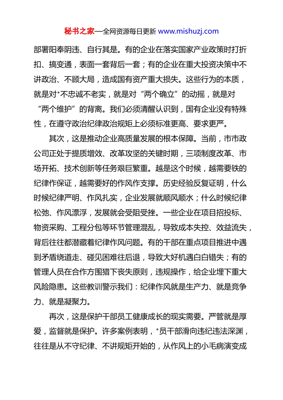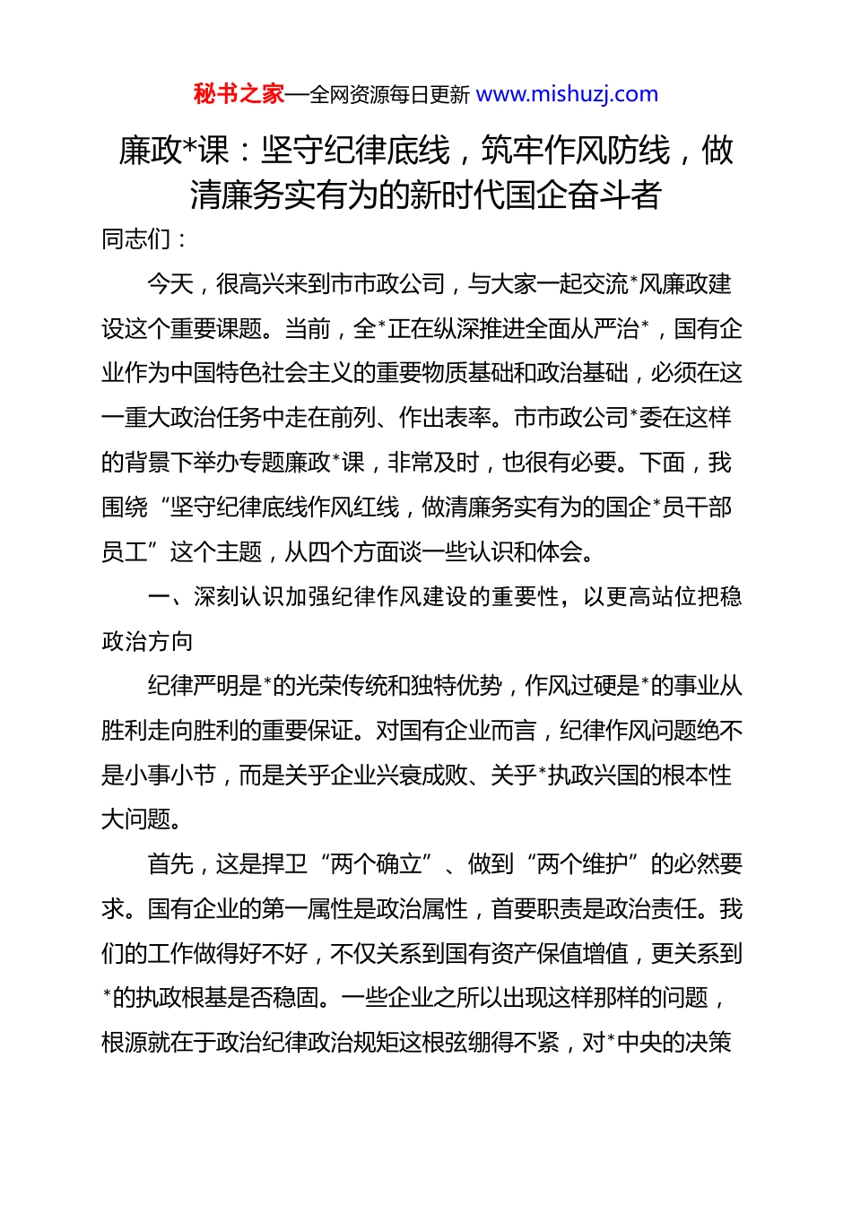 秘书之家—全网资源每日更新 www.mishuzj.com廉政*课:坚守纪律底线,筑牢作风防线,做清廉务实有为的新时代国企奋斗者同志们:今天,很高兴来到市市政公司,与大家一起交流*风廉政建设这个重要课题。当前,全*正在纵深推进全面从严治*,国有企业作为中国特色社会主义的重要物质基础和政治基础,必须在这一重大政治任务中走在前列、作出表率。市市政公司*委在这样的背景下举办专题廉政*课,非常及时,也很有必要。下面,我围绕“坚守纪律底线作风红线,做清廉务实有为的国企*员干部员工”这个主题,从四个方面谈一些认识和体会。一、深刻认识加强纪律作风建设的重要性,以更高站位把稳政治方向纪律严明是*的光荣传统和独特优势,作风过硬是*的事业从胜利走向胜利的重要保证。对国有企业而言,纪律作风问题绝不是小事小节,而是关乎企业兴衰成败、关乎*执政兴国的根本性大问题。首先,这是捍卫“两个确立”、做到“两个维护”的必然要求。国有企业的第一属性是政治属性,首要职责是政治责任。我们的工作做得好不好,不仅关系到国有资产保值增值,更关系到*的执政根基是否稳固。一些企业之所以出现这样那样的问题,根源就在于政治纪律政治规矩这根弦绷得不紧,对*中央的决策秘书之家—全网资源每日更新 www.mishuzj.com部署阳奉阴违、自行其是。有的企业在落实国家产业政策时打折扣、搞变通,表面一套背后一套;有的企业在重大投资决策中不讲政治、不顾大局,造成国有资产重大损失。这些行为的本质,就是对*不忠诚不老实,就是对“两个确立”的动摇,就是对“两个维护”的背离。我们必须清醒认识到,国有企业没有特殊性,在遵守政治纪律政治规矩上必须标准更高、要求更严。其次,这是推动企业高质量发展的根本保障。当前,市市政公司正处于提质增效、改革攻坚的关键时期,三项制度改革、市场开拓、技术创新等任务艰巨繁重。越是这个时候,越需要铁的纪律作保证,越需要好的作风作支撑。历史经验反复证明,什么时候纪律严明、作风扎实,企业发展就顺风顺水;什么时候纪律松弛、作风漂浮,发展就会受阻受挫。一些企业在项目招投标、物资采购、工程分包等环节管理混乱,导致成本失控、效益流失,背后往往都潜藏着纪律作风问题。有的干部在重点项目推进中遇到矛盾绕道走、碰见困难往后退,导致大好机遇白白错失;有的管理人员在合作方围猎下丧失原则,违规操作,给企业埋下重大风险隐患。这些教训警示我们:纪律作风就是生产力、就是竞争力、就是凝聚力。再次,这是保护干部员工健康成长的现实需要。严管就是厚爱,监督就是保护。许多案例表明,*员干部滑向违纪违法深渊,往往是从不守纪律、不讲规矩开始的,从作风上的小毛病演变成秘书之家—全网资源每日更新 www.mishuzj.com大问题。有的干部起初只是接受一点小礼品、参加一些不当宴请,认为人之常情无伤大雅,但久而久之就放松了警惕,最终越陷越深无法自拔。组织上加强纪律作风建设,看似约束多了、要求严了,实则是对大家最大的关心和爱护。这既是对企业负责,也是对干部员工本人负责,更是对干部员工的家庭负责。我们宁可听到大家现在对严格要求有抱怨,也不愿看到明天因违纪违法而流泪后悔。二、清醒把握当前反腐败斗争形势的复杂性,以更准研判保持政治警觉*的十八大以来,以***同志为核心的*中央以前所未有的勇气和定力推进*风廉政建设和反腐败斗争,取得了历史性、开创性成就。但我们要清醒认识到,反腐败斗争形势依然严峻复杂,国有企业绝非净土,必须以永远在路上的坚韧和执着,将全面从严治*进行到底。从全国层面看,腐败和反腐败较量还在激烈进行,并呈现出一些新的阶段性特征。一些腐败分子手段更加隐蔽,从赤裸裸的权钱交易转向“期权腐败”“影子腐败”,通过亲属经商、与企业主结成利益同盟等方式变相敛财。有的腐败问题与金融、资本、资源等要素交织,涉及金额巨大,危害后果严重。这些新情况新特点,给我们的监督执纪工作带来更大挑战。从国资国企领域看,我们面临的形势同样不容乐观。近年来,秘书之家—全网资源每日更新 www.mishuzj.com国资系统查处了一批违纪违法案件,暴露出的问题触目惊心。有的企业领导...