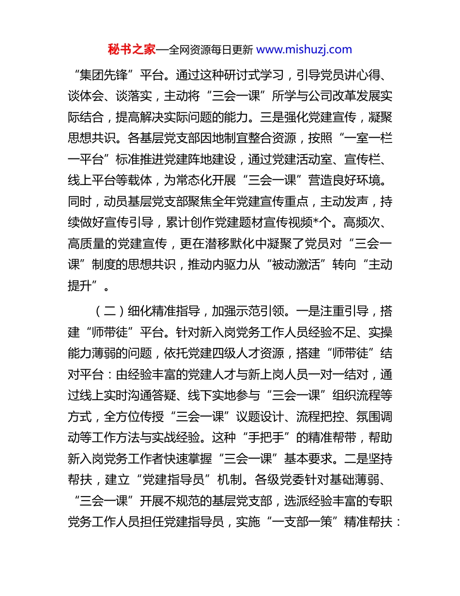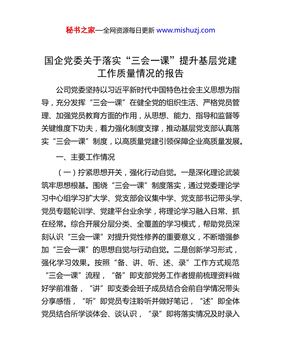 秘书之家—全网资源每日更新 www.mishuzj.com国企党委关于落实“三会一课”提升基层党建工作质量情况的报告公司党委坚持以习近平新时代中国特色社会主义思想为指导,充分发挥“三会一课”在健全党的组织生活、严格党员管理、加强党员教育方面的作用,从思想、能力、指导和监督等关键维度下功夫,着力强化制度支撑,推动基层党支部认真落实“三会一课”制度,以高质量党建引领保障企业高质量发展。一、主要工作情况(一)拧紧思想开关,强化行动自觉。一是深化理论武装筑牢思想根基。围绕“三会一课”制度落实,通过党委理论学习中心组学习扩大学、党支部会议集中学、党支部书记带头学、党员专题轮训学、党建平台业余学,将理论学习融入日常、抓在经常。综合开展分层分类、全覆盖的学习模式,帮助党员深刻认识“三会一课”对提升党性修养的重要意义,不断增强参加“三会一课”的思想自觉与行动自觉。二是创新学习形式,强化学习效果。按照“备、讲、听、述、录”工作方式规范“三会一课”流程,“备”即支部党务工作者提前梳理资料做好学前准备,“讲”即支委会班子成员结合会前自学情况带头分享感悟,“听”即党员专注聆听并做好笔记,“述”即全体党员结合所学谈体会、谈认识,“录”即将落实情况及时录入秘书之家—全网资源每日更新 www.mishuzj.com“集团先锋”平台。通过这种研讨式学习,引导党员讲心得、谈体会、谈落实,主动将“三会一课”所学与公司改革发展实际结合,提高解决实际问题的能力。三是强化党建宣传,凝聚思想共识。各基层党支部因地制宜整合资源,按照“一室一栏一平台”标准推进党建阵地建设,通过党建活动室、宣传栏、线上平台等载体,为常态化开展“三会一课”营造良好环境。同时,动员基层党支部聚焦全年党建宣传重点,主动发声,持续做好宣传引导,累计创作党建题材宣传视频*个。高频次、高质量的党建宣传,更在潜移默化中凝聚了党员对“三会一课”制度的思想共识,推动内驱力从“被动激活”转向“主动提升”。(二)细化精准指导,加强示范引领。一是注重引导,搭建“师带徒”平台。针对新入岗党务工作人员经验不足、实操能力薄弱的问题,依托党建四级人才资源,搭建“师带徒”结对平台:由经验丰富的党建人才与新上岗人员一对一结对,通过线上实时沟通答疑、线下实地参与“三会一课”组织流程等方式,全方位传授“三会一课”议题设计、流程把控、氛围调动等工作方法与实战经验。这种“手把手”的精准帮带,帮助新入岗党务工作者快速掌握“三会一课”基本要求。二是坚持帮扶,建立“党建指导员”机制。各级党委针对基础薄弱、“三会一课”开展不规范的基层党支部,选派经验丰富的专职党务工作人员担任党建指导员,实施“一支部一策”精准帮扶:秘书之家—全网资源每日更新 www.mishuzj.com首先深入调研实际情况,结合不同党支部的行业特点、党员构成、阶段工作重点,制定细致规范的帮扶计划;再全程参与党支部“三会一课”筹备与开展,从议题确定、内容设计到流程执行进行全过程指导,确保“三会一课”既不偏离党建工作核心,又不脱离党支部工作实际,以精准指导提升薄弱党支部基础。三是严格标准,制定党建指导手册。围绕“三会一课”全流程规范化需求,系统梳理会议通知、议题准备、会议记录、资料归档等各环节的操作要点,编制《党建工作指导手册》,既明确“三会一课”开展的规范要求,又提供可直接参考的实操范例,让基层党支部在组织“三会一课”时“有章可循、有据可依”,以标准化指导为“三会一课”常态化、规范化开展提供坚实支撑。四是强化引领,选树支部建设标杆。实施“标杆党支部”培育工程,发挥领导班子所在党支部的“头雁”作用,在基层党支部中筛选“三会一课”组织规范、内容鲜活、成效显著的党支部,培育为“标杆党支部”,通过拍摄专题案例视频、组织现场观摩会、开展经验交流会等方式,宣传推广其先进做法和经验。以先进典型引领激发基层党支部的内生动力,营造“比规范、学标杆、赶先进、超优秀”的浓厚氛围,以标杆示范带动全面辐射。(三)注重队伍建设,提升落实质量。一是严格标准,选优配强“关键少数”。坚持把政治标准...