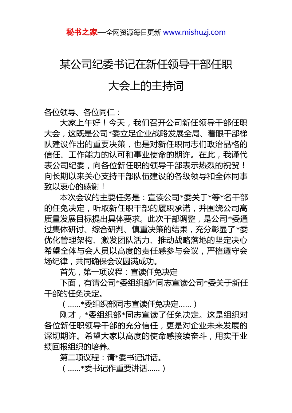 秘书之家—全网资源每日更新 www.mishuzj.com某公司纪委书记在新任领导干部任职大会上的主持词各位领导、各位同仁:大家上午好!今天,我们召开公司新任领导干部任职大会,这既是公司*委立足企业战略发展全局、着眼干部梯队建设作出的重要决策,也是对新任职同志们政治品格的信任、工作能力的认可和事业使命的期许。在此,我谨代表公司纪委,向各位新任职的领导干部表示热烈的祝贺!向长期以来关心支持干部队伍建设的各级领导和全体同事致以衷心的感谢!本次会议的主要任务是:宣读公司*委关于*等*名干部的任免决定,听取新任职干部的履职承诺,并围绕公司高质量发展目标提出具体要求。此次干部调整,是公司*委通过集体研讨、综合研判、慎重决策的结果,充分彰显了*委优化管理架构、激发团队活力、推动战略落地的坚定决心希望全体与会人员以高度的责任感参与会议,严格遵守会场纪律,共同确保会议圆满成功。首先,第一项议程:宣读任免决定下面,有请公司*委组织部*同志宣读公司*委关于新任干部的任免决定。(……*委组织部同志宣读任免决定……)刚才,*委组织部*同志宣读了任免决定。这是组织对各位新任职领导干部的充分信任,更是对企业未来发展的深切期许。希望大家以高度的使命感接续奋斗,用实干业绩回报组织的培养。第二项议程:请*委书记讲话。(……*委书记作重要讲话……)秘书之家—全网资源每日更新 www.mishuzj.com刚才,*委书记的讲话站位高远、内涵深刻,既提出了廉洁从业的刚性要求,又明确了服务发展的战略导向,具有很强的思想性、指导性和实操性。希望大家深入学习领会,将讲话精神转化为推动企业高质量发展的具体行动。会后,各部门要迅速组织传达学习,确保讲话精神落地见效。第三项议程:新任职干部代表表态发言新的岗位意味着新的责任,新的征程呼唤新的作为。下面,请新任职*干部代表作表态发言,大家掌声欢迎!(……新任职干部代表作表态发言……)刚才,3 位代表的发言情真意切、掷地有声,充分展现了大家勇担使命、开拓进取的决心。从发言中,我们感受到了新任干部立足新起点、破解新难题、创造新价值的信心与担当。希望全体新任职干部将承诺转化为行动,以过硬作风推动企业高质量发展。同志们,此次干部调整是公司*委围绕“十四五”战略规划、深化改革创新作出的重要部署。新任职的同志将肩负新的使命,开启新的征程。在此,我代表公司纪委,向大家提出五点期望,与各位共勉:一、锤炼政治品格,铸就忠诚之魂。政治建设是企业发展的根本保证。新任职干部要始终把讲政治放在首位,深入学习贯彻*的创新理论,深刻领悟“两个确立”的决定性意义,增强“四个意识”、坚定“四个自信”、做到“两个维护”。要严守政治纪律和政治规矩,在重大原则问题上立场坚定,在贯彻执行公司决策部署时令行禁止,确保企业发展方向与国家战略同频共振。二、勇担发展重任,彰显实干之效。为官一任,当造福一方。新任职干部要牢记职责使命,以“功成不必在我”的境界和“功成必定有我”的担当,全身心投入工作要坚持问题导向,聚焦市场开拓、技术创新、管理提升等重点任务,真抓实干、攻坚克难。要发扬斗争精神,在破秘书之家—全网资源每日更新 www.mishuzj.com解发展瓶颈中当先锋,在应对风险挑战中打头阵,用实绩诠释责任担当。三、严守廉洁底线,永葆清廉本色。清正廉洁是企业干部的生命线。新任职干部要时刻绷紧纪律这根弦,严格遵守 dj 企规,自觉接受监督,做到心有所畏、言有所戒、行有所止。要正确行使权力,坚持公私分明、依法用权,坚决反对任何形式的“微腐败”。要加强家风建设,以良好家风涵养清正作风,为企业营造风清气正的发展环境。四、凝聚团队合力,共筑发展之基。团结就是战斗力。新任职干部要牢固树立大局意识,自觉维护班子团结,加强沟通协作,形成“心往一处想、劲往一处使”的强大合力。要坚持民主集中制原则,充分听取意见,科学民主决策。要坚决反对“山头主义”“圈子文化”,以事业为重以大局为重,共同推动企业各项事业迈上新台阶。五、树立标杆形象,引领文明新风。领导干部的言行是企业文化的风向标。新任职干部要时刻注意自身形象...