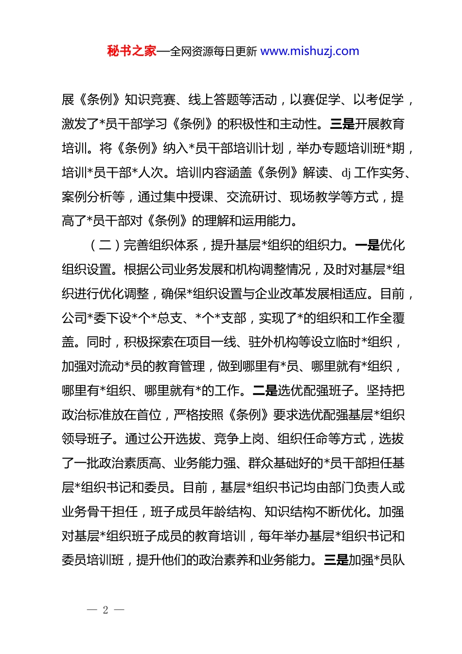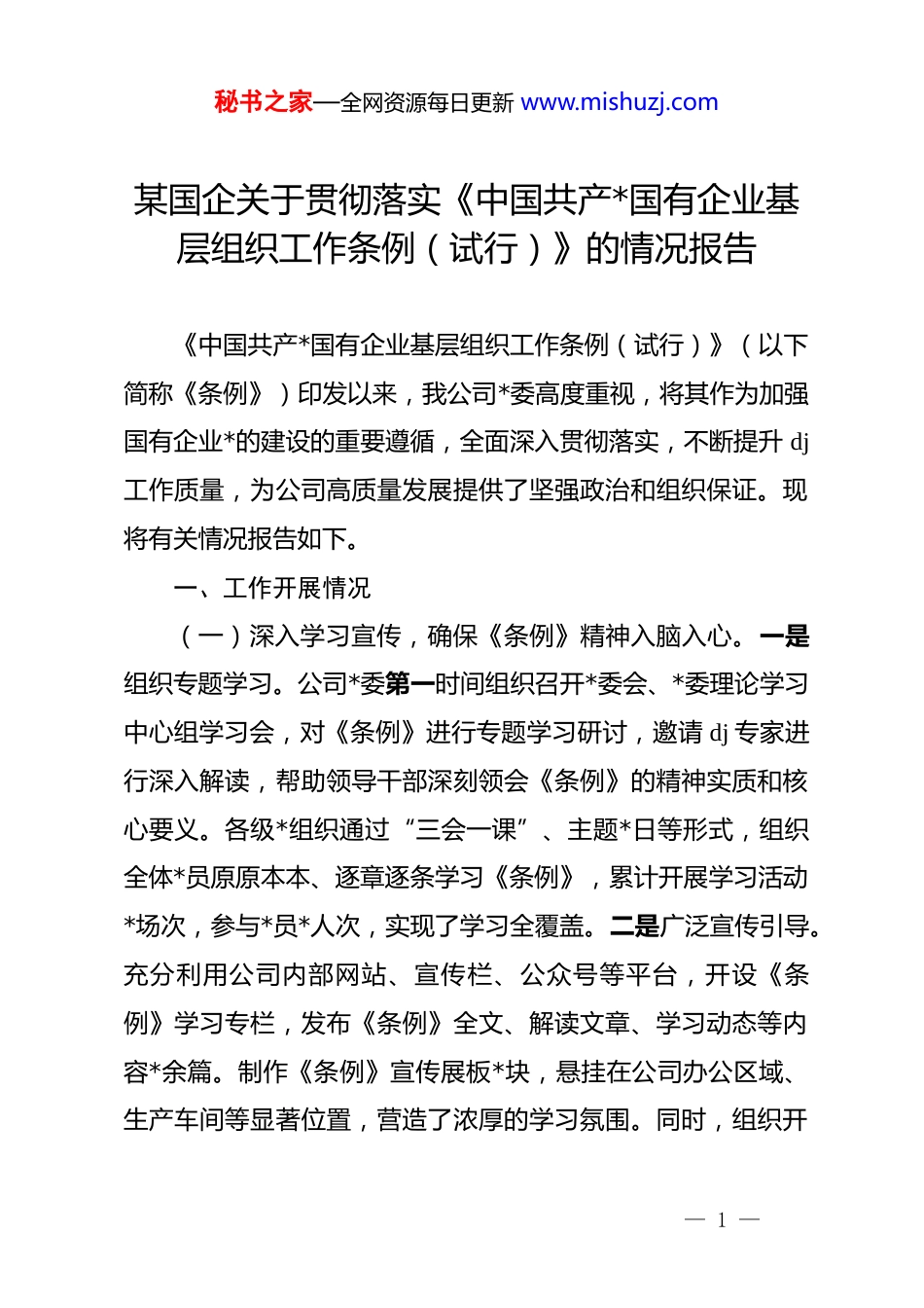 秘书之家—全网资源每日更新 www.mishuzj.com某国企关于贯彻落实《中国共产*国有企业基层组织工作条例(试行)》的情况报告《中国共产*国有企业基层组织工作条例(试行)》(以下简称《条例》)印发以来,我公司*委高度重视,将其作为加强国有企业*的建设的重要遵循,全面深入贯彻落实,不断提升 dj工作质量,为公司高质量发展提供了坚强政治和组织保证。现将有关情况报告如下。一、工作开展情况(一)深入学习宣传,确保《条例》精神入脑入心。一是组织专题学习。公司*委第一时间组织召开*委会、*委理论学习中心组学习会,对《条例》进行专题学习研讨,邀请 dj 专家进行深入解读,帮助领导干部深刻领会《条例》的精神实质和核心要义。各级*组织通过“三会一课”、主题*日等形式,组织全体*员原原本本、逐章逐条学习《条例》,累计开展学习活动*场次,参与*员*人次,实现了学习全覆盖。二是广泛宣传引导。充分利用公司内部网站、宣传栏、公众号等平台,开设《条例》学习专栏,发布《条例》全文、解读文章、学习动态等内容*余篇。制作《条例》宣传展板*块,悬挂在公司办公区域、生产车间等显著位置,营造了浓厚的学习氛围。同时,组织开— 1 —秘书之家—全网资源每日更新 www.mishuzj.com展《条例》知识竞赛、线上答题等活动,以赛促学、以考促学,激发了*员干部学习《条例》的积极性和主动性。三是开展教育培训。将《条例》纳入*员干部培训计划,举办专题培训班*期,培训*员干部*人次。培训内容涵盖《条例》解读、dj 工作实务、案例分析等,通过集中授课、交流研讨、现场教学等方式,提高了*员干部对《条例》的理解和运用能力。(二)完善组织体系,提升基层*组织的组织力。一是优化组织设置。根据公司业务发展和机构调整情况,及时对基层*组织进行优化调整,确保*组织设置与企业改革发展相适应。目前,公司*委下设*个*总支、*个*支部,实现了*的组织和工作全覆盖。同时,积极探索在项目一线、驻外机构等设立临时*组织,加强对流动*员的教育管理,做到哪里有*员、哪里就有*组织,哪里有*组织、哪里就有*的工作。二是选优配强班子。坚持把政治标准放在首位,严格按照《条例》要求选优配强基层*组织领导班子。通过公开选拔、竞争上岗、组织任命等方式,选拔了一批政治素质高、业务能力强、群众基础好的*员干部担任基层*组织书记和委员。目前,基层*组织书记均由部门负责人或业务骨干担任,班子成员年龄结构、知识结构不断优化。加强对基层*组织班子成员的教育培训,每年举办基层*组织书记和委员培训班,提升他们的政治素养和业务能力。三是加强*员队— 2 —秘书之家—全网资源每日更新 www.mishuzj.com伍建设。严格按照*员发展工作流程,做好*员发展工作,注重从生产经营一线、青年职工和高知识群体中发展*员,不断优化*员队伍结构。近年来,共发展*员*名,其中生产经营一线*员占比*%以上。加强*员教育管理,通过“三会一课”、主题*日、*员教育培训等活动,加强*员的理想信念教育和*性锻炼,提高*员的政治素质和业务能力。建立健全*员激励关怀帮扶机制,对困难*员进行帮扶慰问,增强*员的归属感和荣誉感。(三)强化制度建设,提升基层*组织的执行力。一是完善dj 工作制度体系。对照《条例》要求,对公司现有 dj 工作制度进行全面梳理,修订完善了《*委会议事规则》《*支部工作制度》《*员教育管理制度》《*风廉政建设责任制实施办法》等*项制度,进一步明确了 dj 工作的目标任务、工作流程和责任分工,使 dj 工作有章可循、有据可依。二是严格落实“三重一大”决策制度。坚持和完善民主集中制,严格落实“三重一大”事项集体决策制度,明确了*委、董事会、经理层的职责权限和决策程序。重大经营管理事项必须经*委前置研究讨论,充分发挥*委把方向、管大局、保落实的领导作用。加强对“三重一大”决策制度执行情况的监督检查,确保决策的科学性和民主性。三是建立健全 dj 工作考核评价机制。制定了《dj 工作考核评价办法》,将 dj 工作纳入对基层*组织和*员干部的年度考— 3 —秘书之家—全网资源每日更新 www.mishuzj.com核内容,明确考核指标和评分标...