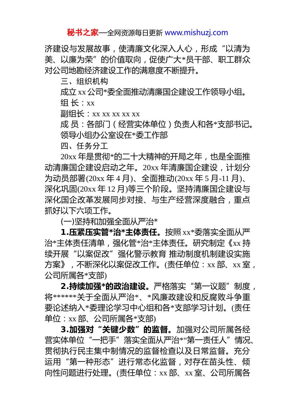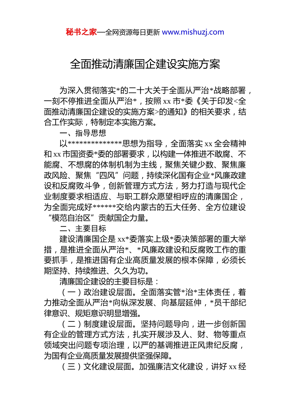秘书之家—全网资源每日更新 www.mishuzj.com全面推动清廉国企建设实施方案为深入贯彻落实*的二十大关于全面从严治*战略部署,一刻不停推进全面从严治*,按照 xx 市*委《关于印发<全面推动清廉国企建设的实施方案>的通知》的相关要求,结合工作实际,特制定本实施方案。一、指导思想以**************思想为指导,全面落实 xx 全会精神和 xx 市国资委*委的部署要求,以构建一体推进不敢腐、不能腐、不想腐的体制机制为主线,聚焦关键少数、聚焦廉政风险、聚焦“四风”问题,持续深化国有企业*风廉政建设和反腐败斗争,创新管理方式方法,努力打造与现代企业制度要求相适应、与职工群众愿望相呼应的清廉国企,为全面完成好******交给内蒙古的五大任务、全方位建设“模范自治区”贡献国企力量。二、主要目标建设清廉国企是 xx*委落实上级*委决策部署的重大举措,是推进全面从严治*、*风廉政建设和反腐败工作的重要抓手,是推进国有企业高质量发展的根本保障,必须长期坚持、持续推进、久久为功。清廉国企建设的主要目标是:(一)政治建设层面。全面落实管*治*主体责任,着力推动全面从严治*向纵深发展、向基层延伸,*员干部纪律意识、规矩意识明显增强。(二)制度建设层面。坚持问题导向,进一步创新国有企业的管理方式方法,扎实开展涉及人、财、物等重点领域突出问题专项治理,以严的基调推进正风肃纪反腐,为国有企业高质量发展提供坚强保障。(三)文化建设层面。加强廉洁文化建设,讲好 xx 经秘书之家—全网资源每日更新 www.mishuzj.com济建设与发展故事,使清廉文化深入人心,形成“以清为美、以廉为荣”的价值取向,促使广大*员干部、职工群众对公司地勘经济建设工作的满意度不断提升。三、组织机构成立 xx 公司*委全面推动清廉国企建设工作领导小组。组 长:xx副组长:xx xx xx xx xx成 员:各部门(经营实体单位)负责人和各*支部书记。领导小组办公室设在*委工作部四、任务分工20xx 年是贯彻*的二十大精神的开局之年,也是全面推动清廉国企建设启动之年。20xx 年清廉国企建设,计划分为动员部署(20xx 年 4 月)、全面推动(20xx 年 5 月-11 月)、深化巩固(20xx 年 12 月)等三个阶段。坚持清廉国企建设与深化国企改革发展同步对接、与生产经营深度融合,重点抓好以下六项工作。(一)坚持和加强全面从严治*1.压紧压实管*治*主体责任。按照 xx*委落实全面从严治*主体责任清单,强化管*治*主体责任。研究制定《xx 持续开展“以案促改”强化警示教育 推动制度机制建设实施方案》,不断深化以案促改工作。(责任单位:xx 部、xx 室,公司所属各*支部)2.持续加强*的政治建设。严格落实“第一议题”制度,将******关于全面从严治*、*风廉政建设和反腐败斗争重要论述纳入*委理论学习中心组和各*支部学习计划。(责任单位:xx 部、公司所属各*支部)3.加强对“关键少数”的监督。加强对公司所属各经营实体单位“一把手”落实全面从严治*“第一责任人”情况、贯彻执行民主集中制情况的监督检查以及日常监督。充分运用“第一种形态”进行常态化监督,对存在苗头性、倾向性问题进行处理。(责任单位:xx 部、xx 室、公司所属各秘书之家—全网资源每日更新 www.mishuzj.com*支部)(二)落实和完善现代企业制度4.优化国企运行机制。严格执行《xx*委前置研究事项清单(试行)》《xx*委会议事项决策规则》和《xx“三重一大”事项议事决策实施细则》等各类管理工作制度,推动企业建立规范高效、管理科学的现代企业管理体制。(责任单位:xx 部、公司所属各*支部)(三)坚持创新国资监管方式方法5.着力增强国企监管效能。进一步加强专业化、体系化、法治化监管,以有力有效的监管工作更好保障和服务xx 高质量发展。不断巩固完善业务监督、综合监督、责任追究“三位一体”监督工作体系,提升监督及时性和有效性。不断优化监管方式,统筹用好财务监管、考核激励等手段,强化监管协同。(责任单位:xx 部、xx 部、xx 部、公司所属各*支部)6.强化企业合规管理。按照《xx<全面风险管理制度>实施细则》的相关要求,以有效防控违规风险为目的,以提升依法合规经营...