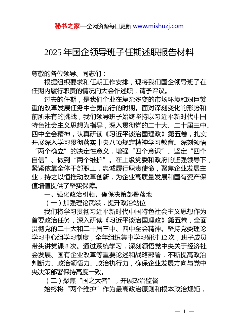 秘书之家—全网资源每日更新 www.mishuzj.com2025 年国企领导班子任期述职报告材料尊敬的各位领导、同志们:根据组织要求和任期工作安排,现将我们国企领导班子在任期内履行职责的情况向大会作述职,请予评议。过去的任期,是我们企业在复杂多变的市场环境和艰巨繁重的改革发展任务中奋勇前行的时期。面对深刻变化的形势和前所未有的挑战,我们领导班子始终坚持以习近平新时代中国特色社会主义思想为指导,深入贯彻党的二十大、二十届三中、四中全会精神,认真研读《习近平谈治国理政》第五卷,扎实开展深入学习贯彻落实中央八项规定精神学习教育。深刻领悟“两个确立”的决定性意义,增强“四个意识”、坚定“四个自信”、做到“两个维护”。在上级党委和政府的坚强领导下,紧紧依靠全体干部职工,忠诚履行职责使命,聚焦企业发展主业,持之以恒推动改革创新,为企业高质量发展和国有资产保值增值提供了坚实保障。一、强化政治引领,确保决策部署落地(一)加强理论武装,提升政治站位我们将学习贯彻习近平新时代中国特色社会主义思想作为首要政治任务,深入研读《习近平谈治国理政》第五卷,全面贯彻党的二十大和二十届三中、四中全会精神。坚持党委理论学习中心组学习制度,全年组织集中学习研讨 12 次,班子成员带头讲党课 8 次。通过系统学习,深刻领悟党中央关于经济社会发展、国有企业改革等重要论述和战略部署,不断提高政治判断力、政治领悟力、政治执行力,确保企业发展方向与党中央决策部署保持高度一致。(二)聚焦“国之大者”,开展政治监督始终将“两个维护”作为最高政治原则和根本政治规矩,— 1 —秘书之家—全网资源每日更新 www.mishuzj.com围绕党中央提出的“国之大者”,结合企业实际,精准开展政治监督。建立政治监督清单,重点加强对企业贯彻落实“三新一高”要求、服务国家重大战略、深化国企改革、防范化解重大风险等情况的监督检查。在推动中央巡视、上级督导检查反馈问题整改落实的监督中,坚持问题导向,压实整改主体责任,形成“监督-反馈-整改-再监督”的闭环,确保党中央决策部署在企业落地生根。二、聚焦主责主业,推动企业高质量发展(一)明确战略方向,优化产业布局立足企业实际和市场需求,制定并实施“十四五”发展战略规划,明确主责主业发展方向。加大对核心业务的投入,淘汰低效无效资产,优化产业布局。推动传统产业转型升级,培育新兴产业,提高企业核心竞争力。任期内,企业核心业务收入占比从 X%提高到 X%,产业结构得到明显优化。(二)强化创新驱动,提升发展动能高度重视科技创新,加大研发投入,任期内研发投入年均增长 X%。建立产学研合作机制,与高校、科研院所合作开展技术攻关,取得多项关键技术突破。推动数字化转型,建设智能化工厂和数字化管理平台,提高生产效率和管理水平。通过创新驱动,企业新产品销售收入占比从 X%提高到 X%,发展动能显著增强。(三)加强市场拓展,提高市场份额积极拓展市场,加强市场营销和品牌建设。加大国内市场开拓力度,巩固现有市场份额,拓展新兴市场。同时,积极实施“走出去”战略,参与国际市场竞争。任期内,企业国内市场销售额年均增长 X%,国际市场销售额占比从 X%提高到 X%。三、深化改革创新,激发企业活力(一)推进国企改革,完善体制机制。深入推进国企改革— 2 —秘书之家—全网资源每日更新 www.mishuzj.com三年行动,完善公司治理结构,建立健全现代企业制度。落实董事会职权,加强董事会建设,提高决策科学性和有效性。推进经理层任期制和契约化管理,激发经理层干事创业积极性。任期内,企业改革任务完成率达到 100%,体制机制更加完善。(二)创新管理模式,提高运营效率。引入先进管理理念和方法,创新管理模式。推进全面预算管理,加强成本控制,提高资源配置效率。建立绩效考核体系,将考核结果与薪酬、晋升挂钩,激励干部职工积极工作。通过创新管理模式,企业运营成本降低 X%,劳动生产率提高 X%。(三)加强人才培养,打造高素质团队。坚持党管干部、党管人才原则,加强干部人才队伍建设。制定人才发展规划,加大人才引进和培养力度。建立...
