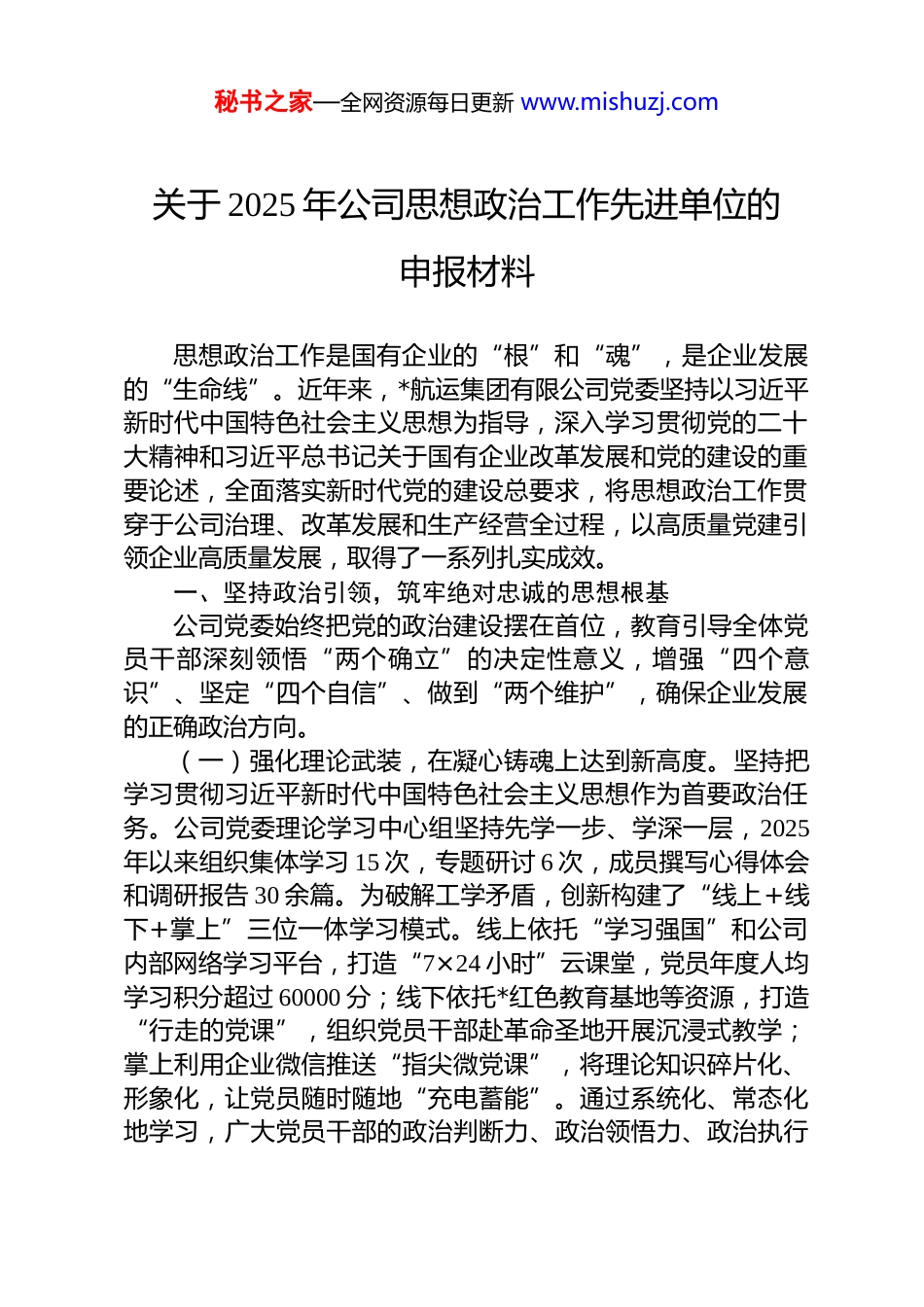 秘书之家—全网资源每日更新 www.mishuzj.com关于 2025 年公司思想政治工作先进单位的申报材料思想政治工作是国有企业的“根”和“魂”,是企业发展的“生命线”。近年来,*航运集团有限公司党委坚持以习近平新时代中国特色社会主义思想为指导,深入学习贯彻党的二十大精神和习近平总书记关于国有企业改革发展和党的建设的重要论述,全面落实新时代党的建设总要求,将思想政治工作贯穿于公司治理、改革发展和生产经营全过程,以高质量党建引领企业高质量发展,取得了一系列扎实成效。一、坚持政治引领,筑牢绝对忠诚的思想根基公司党委始终把党的政治建设摆在首位,教育引导全体党员干部深刻领悟“两个确立”的决定性意义,增强“四个意识”、坚定“四个自信”、做到“两个维护”,确保企业发展的正确政治方向。(一)强化理论武装,在凝心铸魂上达到新高度。坚持把学习贯彻习近平新时代中国特色社会主义思想作为首要政治任务。公司党委理论学习中心组坚持先学一步、学深一层,2025年以来组织集体学习 15 次,专题研讨 6 次,成员撰写心得体会和调研报告 30 余篇。为破解工学矛盾,创新构建了“线上+线下+掌上”三位一体学习模式。线上依托“学习强国”和公司内部网络学习平台,打造“7×24 小时”云课堂,党员年度人均学习积分超过 60000 分;线下依托*红色教育基地等资源,打造“行走的党课”,组织党员干部赴革命圣地开展沉浸式教学;掌上利用企业微信推送“指尖微党课”,将理论知识碎片化、形象化,让党员随时随地“充电蓄能”。通过系统化、常态化地学习,广大党员干部的政治判断力、政治领悟力、政治执行秘书之家—全网资源每日更新 www.mishuzj.com力显著增强。(二)严明政治纪律,在对党忠诚上彰显新担当。公司党委始终将政治纪律和政治规矩挺在前面,制定了《关于加强政治建设的若干措施》,将“两个维护”作为最高政治原则和根本政治规矩,具体落实到公司重大决策、重要干部任免、重大项目安排等各项工作中。定期开展政治生态分析研判,对苗头性、倾向性问题早发现、早提醒、早纠正。2025 年,公司开展了“严守政治纪律、践行对党忠诚”专项教育活动,组织全体党员重温入党誓词、学习党章党规、观看警示教育片,引导党员干部在思想深处铸就忠诚品格,在实际行动中体现责任担当。(三)坚决贯彻执行,在服务大局上展现新作为。公司党委自觉心怀“国之大者”,坚决贯彻落实党中央和上级党委的决策部署。面对复杂多变的国际航运市场,公司党委主动担当作为,坚决服务共建“一带一路”倡议和海洋强国战略。2025年,在公司党委的坚强领导下,成功开辟了“*—*国际新航线”,打通了我国*地区与*地区的海上物流新通道,将运输周期缩短了 15%,为稳定区域产业链供应链作出了重要贡献。在集团年度党建工作责任制考核中,公司党委连续三年获评“优秀”等次,2025 年度综合得分 98.5 分,位居前列。二、聚焦强基固本,锻造坚强有力的战斗堡垒公司党委坚持大抓基层的鲜明导向,以提升组织力为重点突出政治功能,推动基层党组织全面进步、全面过硬,让党旗在生产经营一线高高飘扬。(一)优化组织设置,实现党的领导全覆盖。公司成立于2020 年,虽然年轻,但党建工作的起点高、标准严。截至 2025年 10 月,公司共有员工 1200 余人,设立党委 1 个,党支部 25个,其中 15 个设立在船舶和关键业务部门上,党员总数达到350 名,占员工总数的 29%。公司党委坚持“四同步、四对接”原则,做到业务发展到哪里,党组织就建到哪里,党的工秘书之家—全网资源每日更新 www.mishuzj.com作就开展到哪里。针对远洋船舶党员分散、流动性强的特点,创新设立“海上流动党员党支部”,通过卫星网络定期开展“三会一课”,确保党员“离港不离党、远航不断线”。(二)建强骨干队伍,发挥头雁领航作用。公司党委坚持党管干部原则,大力实施“领航”干部能力提升计划。一方面,严把政治首关,将政治标准作为选人用人的第一标准;另一方面,加强专业训练,每年选派超过 50 名中层干部和业务骨干参加国内外高端航运物流管理培训。同时,高度重视党务工作者队伍建设,将...