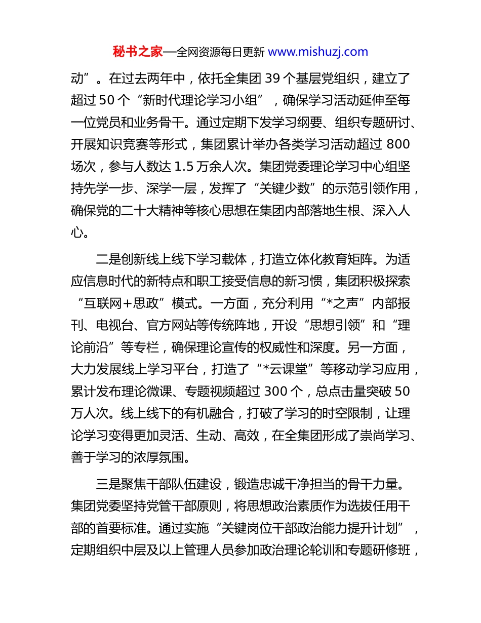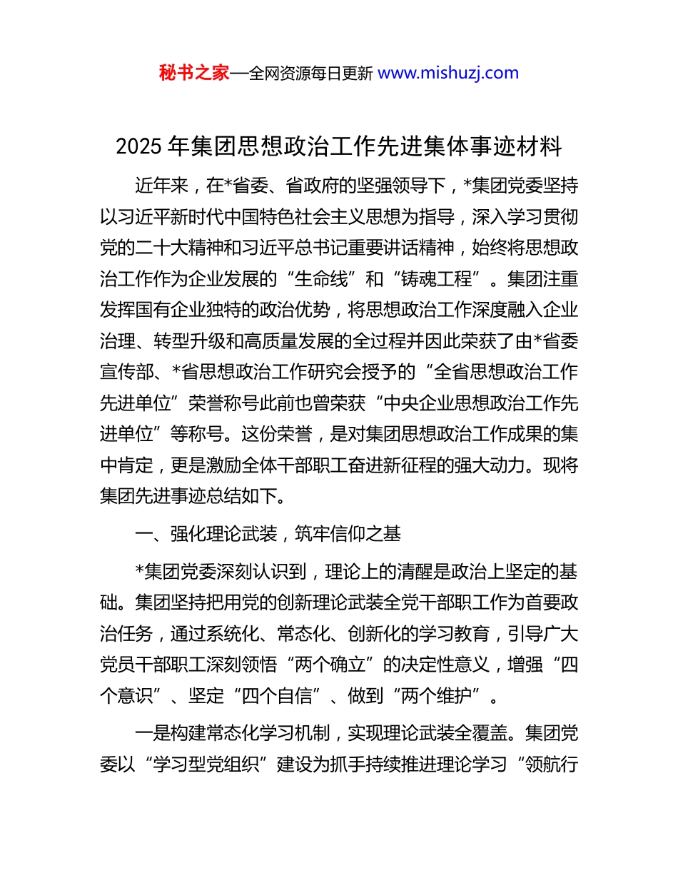 秘书之家—全网资源每日更新 www.mishuzj.com2025 年集团思想政治工作先进集体事迹材料近年来,在*省委、省政府的坚强领导下,*集团党委坚持以习近平新时代中国特色社会主义思想为指导,深入学习贯彻党的二十大精神和习近平总书记重要讲话精神,始终将思想政治工作作为企业发展的“生命线”和“铸魂工程”。集团注重发挥国有企业独特的政治优势,将思想政治工作深度融入企业治理、转型升级和高质量发展的全过程并因此荣获了由*省委宣传部、*省思想政治工作研究会授予的“全省思想政治工作先进单位”荣誉称号此前也曾荣获“中央企业思想政治工作先进单位”等称号。这份荣誉,是对集团思想政治工作成果的集中肯定,更是激励全体干部职工奋进新征程的强大动力。现将集团先进事迹总结如下。一、强化理论武装,筑牢信仰之基*集团党委深刻认识到,理论上的清醒是政治上坚定的基础。集团坚持把用党的创新理论武装全党干部职工作为首要政治任务,通过系统化、常态化、创新化的学习教育,引导广大党员干部职工深刻领悟“两个确立”的决定性意义,增强“四个意识”、坚定“四个自信”、做到“两个维护”。一是构建常态化学习机制,实现理论武装全覆盖。集团党委以“学习型党组织”建设为抓手持续推进理论学习“领航行秘书之家—全网资源每日更新 www.mishuzj.com动”。在过去两年中,依托全集团 39 个基层党组织,建立了超过 50 个“新时代理论学习小组”,确保学习活动延伸至每一位党员和业务骨干。通过定期下发学习纲要、组织专题研讨、开展知识竞赛等形式,集团累计举办各类学习活动超过 800场次,参与人数达 1.5 万余人次。集团党委理论学习中心组坚持先学一步、深学一层,发挥了“关键少数”的示范引领作用,确保党的二十大精神等核心思想在集团内部落地生根、深入人心。二是创新线上线下学习载体,打造立体化教育矩阵。为适应信息时代的新特点和职工接受信息的新习惯,集团积极探索“互联网+思政”模式。一方面,充分利用“*之声”内部报刊、电视台、官方网站等传统阵地,开设“思想引领”和“理论前沿”等专栏,确保理论宣传的权威性和深度。另一方面,大力发展线上学习平台,打造了“*云课堂”等移动学习应用,累计发布理论微课、专题视频超过 300 个,总点击量突破 50万人次。线上线下的有机融合,打破了学习的时空限制,让理论学习变得更加灵活、生动、高效,在全集团形成了崇尚学习、善于学习的浓厚氛围。三是聚焦干部队伍建设,锻造忠诚干净担当的骨干力量。集团党委坚持党管干部原则,将思想政治素质作为选拔任用干部的首要标准。通过实施“关键岗位干部政治能力提升计划”,定期组织中层及以上管理人员参加政治理论轮训和专题研修班,秘书之家—全网资源每日更新 www.mishuzj.com不断提高干部队伍的政治判断力、政治领悟力、政治执行力。同时,集团严格执行民主生活会和组织生活会制度,深入开展批评与自我批评,有效解决各级领导班子中存在的作风问题,着力锻造一支对党忠诚、勇于创新、治企有方、兴企有为、清正廉洁的高素质专业化干部队伍。二、融入中心工作,激发奋进伟力思想政治工作的成效,最终要体现在推动企业改革发展的实践中。*集团党委坚持围绕中心、服务大局,将思想政治工作与生产经营、科技创新、社会责任紧密结合,把党的政治优势、组织优势转化为企业的竞争优势、发展优势,为集团实现高质量发展注入了强大精神动力。第一,打造特色服务品牌,在履行使命中彰显国企担当。集团党委将服务社会、奉献人民作为思想政治工作的生动实践课堂。依托“*共产党员服务队”这一金字招牌,组织开展了“*连百企、服务进万家”等多个专项行动在过去两年中,累计为超过 100 家产业链上下游中小企业提供技术咨询和支持服务,助力区域经济协同发展。同时,集团倾力打造的“*志愿情”志愿服务项目,聚焦助学、助残、环保、社区服务等领域,因其广泛的社会影响力和良好的公众口碑,荣获*省志愿服务项目竞赛金奖。近两年来,该项目共组织各类志愿活动秘书之家—全网资源每日更新 www.mishuzj.com200 余场,参与职工超过 5000 人次,生动诠释了新时代国企的责任...