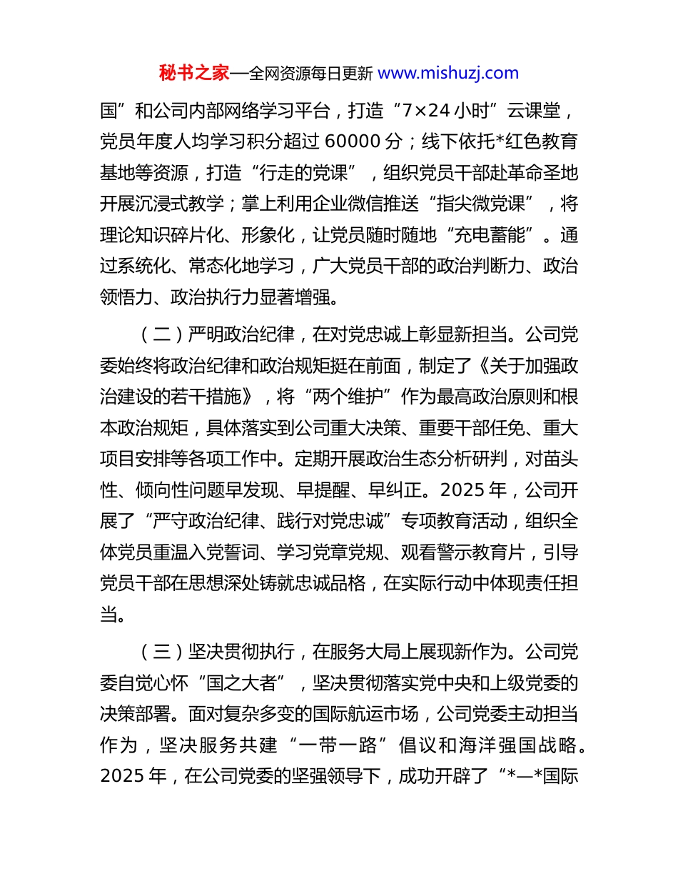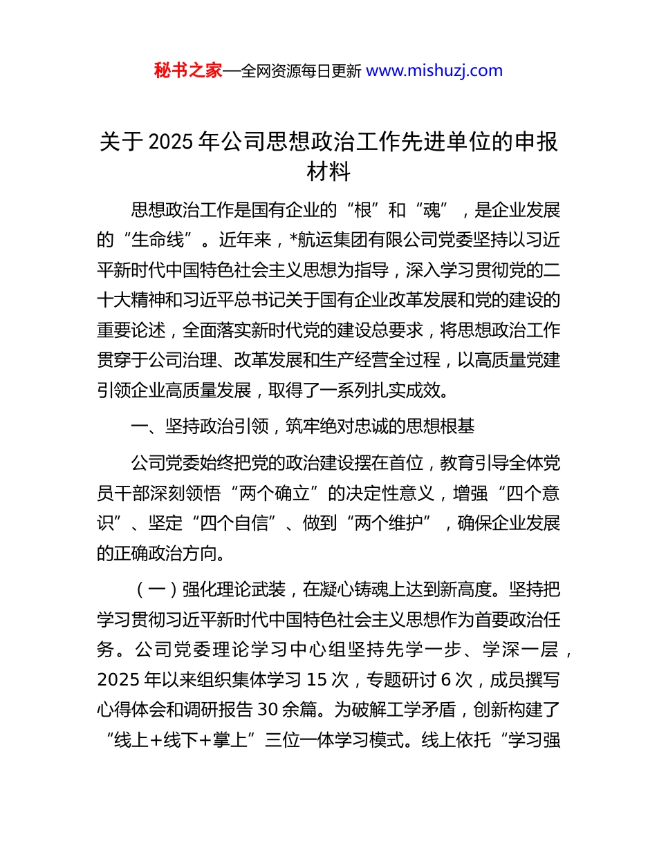 秘书之家—全网资源每日更新 www.mishuzj.com关于 2025 年公司思想政治工作先进单位的申报材料思想政治工作是国有企业的“根”和“魂”,是企业发展的“生命线”。近年来,*航运集团有限公司党委坚持以习近平新时代中国特色社会主义思想为指导,深入学习贯彻党的二十大精神和习近平总书记关于国有企业改革发展和党的建设的重要论述,全面落实新时代党的建设总要求,将思想政治工作贯穿于公司治理、改革发展和生产经营全过程,以高质量党建引领企业高质量发展,取得了一系列扎实成效。一、坚持政治引领,筑牢绝对忠诚的思想根基公司党委始终把党的政治建设摆在首位,教育引导全体党员干部深刻领悟“两个确立”的决定性意义,增强“四个意识”、坚定“四个自信”、做到“两个维护”,确保企业发展的正确政治方向。(一)强化理论武装,在凝心铸魂上达到新高度。坚持把学习贯彻习近平新时代中国特色社会主义思想作为首要政治任务。公司党委理论学习中心组坚持先学一步、学深一层,2025 年以来组织集体学习 15 次,专题研讨 6 次,成员撰写心得体会和调研报告 30 余篇。为破解工学矛盾,创新构建了“线上+线下+掌上”三位一体学习模式。线上依托“学习强秘书之家—全网资源每日更新 www.mishuzj.com国”和公司内部网络学习平台,打造“7×24 小时”云课堂,党员年度人均学习积分超过 60000 分;线下依托*红色教育基地等资源,打造“行走的党课”,组织党员干部赴革命圣地开展沉浸式教学;掌上利用企业微信推送“指尖微党课”,将理论知识碎片化、形象化,让党员随时随地“充电蓄能”。通过系统化、常态化地学习,广大党员干部的政治判断力、政治领悟力、政治执行力显著增强。(二)严明政治纪律,在对党忠诚上彰显新担当。公司党委始终将政治纪律和政治规矩挺在前面,制定了《关于加强政治建设的若干措施》,将“两个维护”作为最高政治原则和根本政治规矩,具体落实到公司重大决策、重要干部任免、重大项目安排等各项工作中。定期开展政治生态分析研判,对苗头性、倾向性问题早发现、早提醒、早纠正。2025 年,公司开展了“严守政治纪律、践行对党忠诚”专项教育活动,组织全体党员重温入党誓词、学习党章党规、观看警示教育片,引导党员干部在思想深处铸就忠诚品格,在实际行动中体现责任担当。(三)坚决贯彻执行,在服务大局上展现新作为。公司党委自觉心怀“国之大者”,坚决贯彻落实党中央和上级党委的决策部署。面对复杂多变的国际航运市场,公司党委主动担当作为,坚决服务共建“一带一路”倡议和海洋强国战略。2025 年,在公司党委的坚强领导下,成功开辟了“*—*国际秘书之家—全网资源每日更新 www.mishuzj.com新航线”,打通了我国*地区与*地区的海上物流新通道,将运输周期缩短了 15%,为稳定区域产业链供应链作出了重要贡献。在集团年度党建工作责任制考核中,公司党委连续三年获评“优秀”等次,2025 年度综合得分 98.5 分,位居前列。二、聚焦强基固本,锻造坚强有力的战斗堡垒公司党委坚持大抓基层的鲜明导向,以提升组织力为重点突出政治功能,推动基层党组织全面进步、全面过硬,让党旗在生产经营一线高高飘扬。(一)优化组织设置,实现党的领导全覆盖。公司成立于2020 年,虽然年轻,但党建工作的起点高、标准严。截至2025 年 10 月,公司共有员工 1200 余人,设立党委 1 个,党支部 25 个,其中 15 个设立在船舶和关键业务部门上,党员总数达到 350 名,占员工总数的 29%。公司党委坚持“四同步、四对接”原则,做到业务发展到哪里,党组织就建到哪里,党的工作就开展到哪里。针对远洋船舶党员分散、流动性强的特点,创新设立“海上流动党员党支部”,通过卫星网络定期开展“三会一课”,确保党员“离港不离党、远航不断线”。(二)建强骨干队伍,发挥头雁领航作用。公司党委坚持党管干部原则,大力实施“领航”干部能力提升计划。一方面,严把政治首关,将政治标准作为选人用人的第一标准;另一方秘书之家—全网资源每日更新 www.mishuzj.com面,加强专业训练,每年选派超过 50 名中层干部和业务骨干参加国内外高端航...